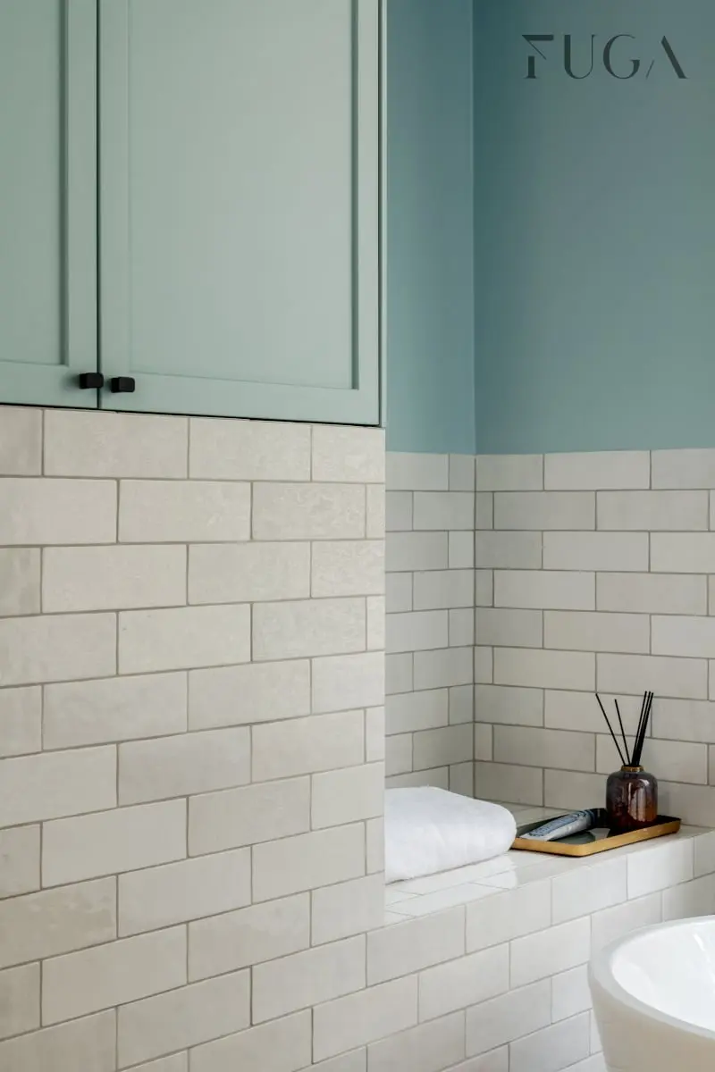 Proste płytki „cegiełki” zyskały dekoracyjny wygląd, za sprawą gierowania krawędzi pod kątem 45 stopni. Idealnie dobrany kolor fugi sprawia, że całość tworzy spójny efekt. Harmonijny wygląd wnętrza to także zasługa skrupulatnego operowania kolorem. W tym przypadku nie było mowy o różnicy choćby o jeden ton pomiędzy ścianą a frontami szafek. Jak zdradzają architektki, identyczny kolor obu elementów jest zasługą tego, że ten pierwszy powstał z mieszalnika farb, drugi w lakierni u stolarza.
