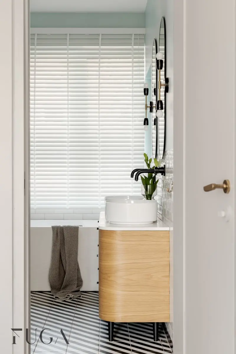 O wspaniałym wykorzystaniu przestrzeni świadczy fakt, że pomimo tego że łazienka jest dość wąska, udało się z niej stworzyć mini salon kąpielowy, którego prawdziwym „must have” jest wanna wolnostojaca. Oprócz tego architektki postawiły na długą szafkę, która zmieściła dwie umywalki – w sam raz dla dużej rodziny.
