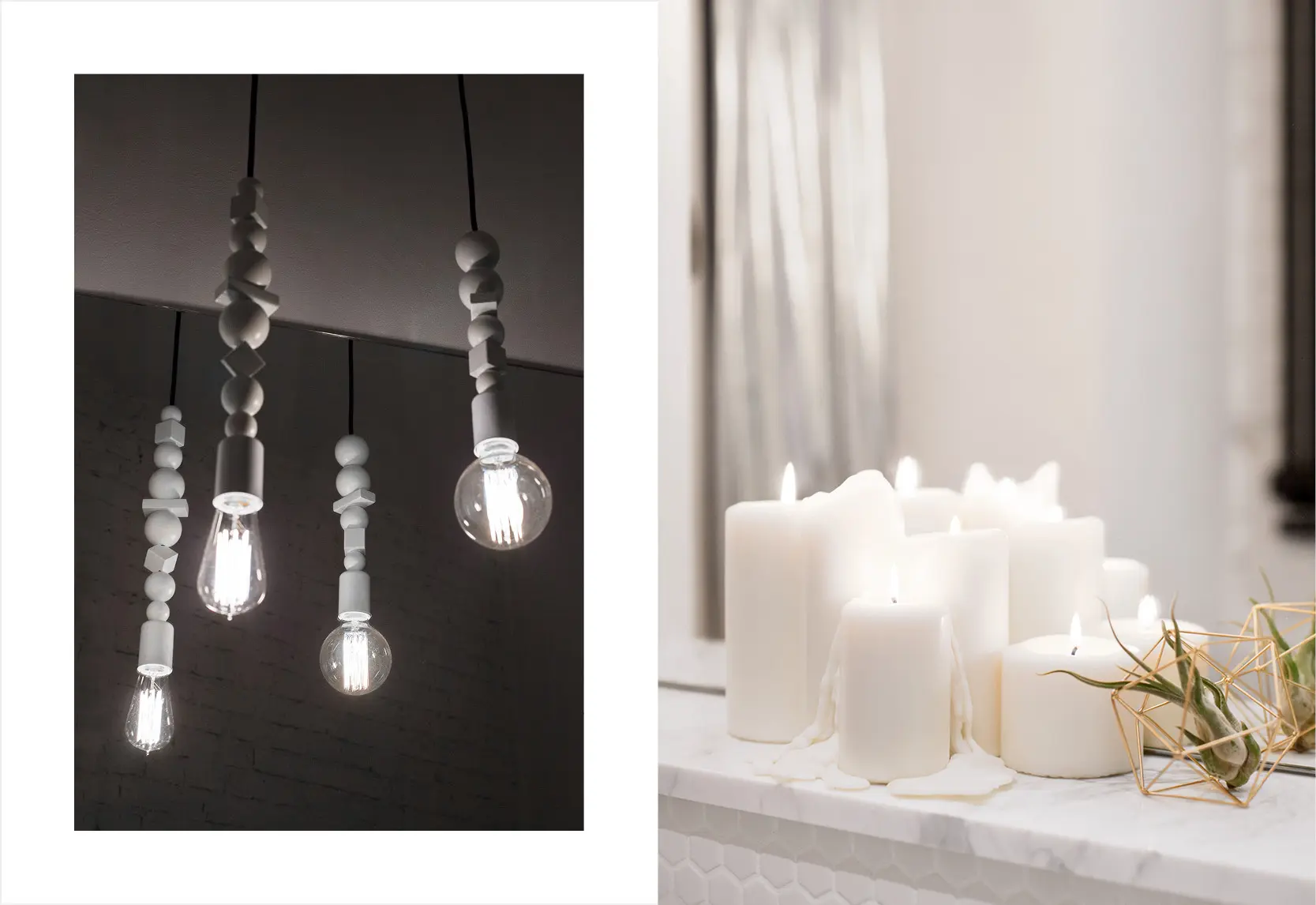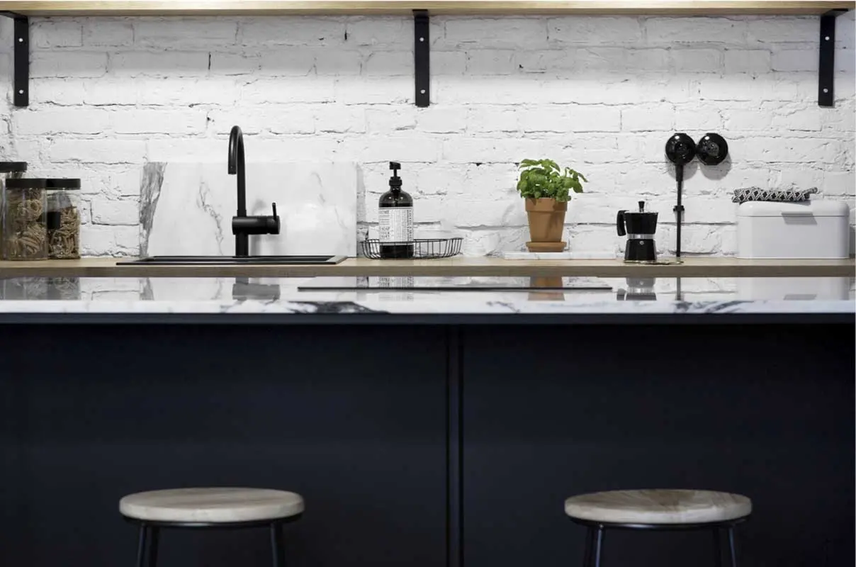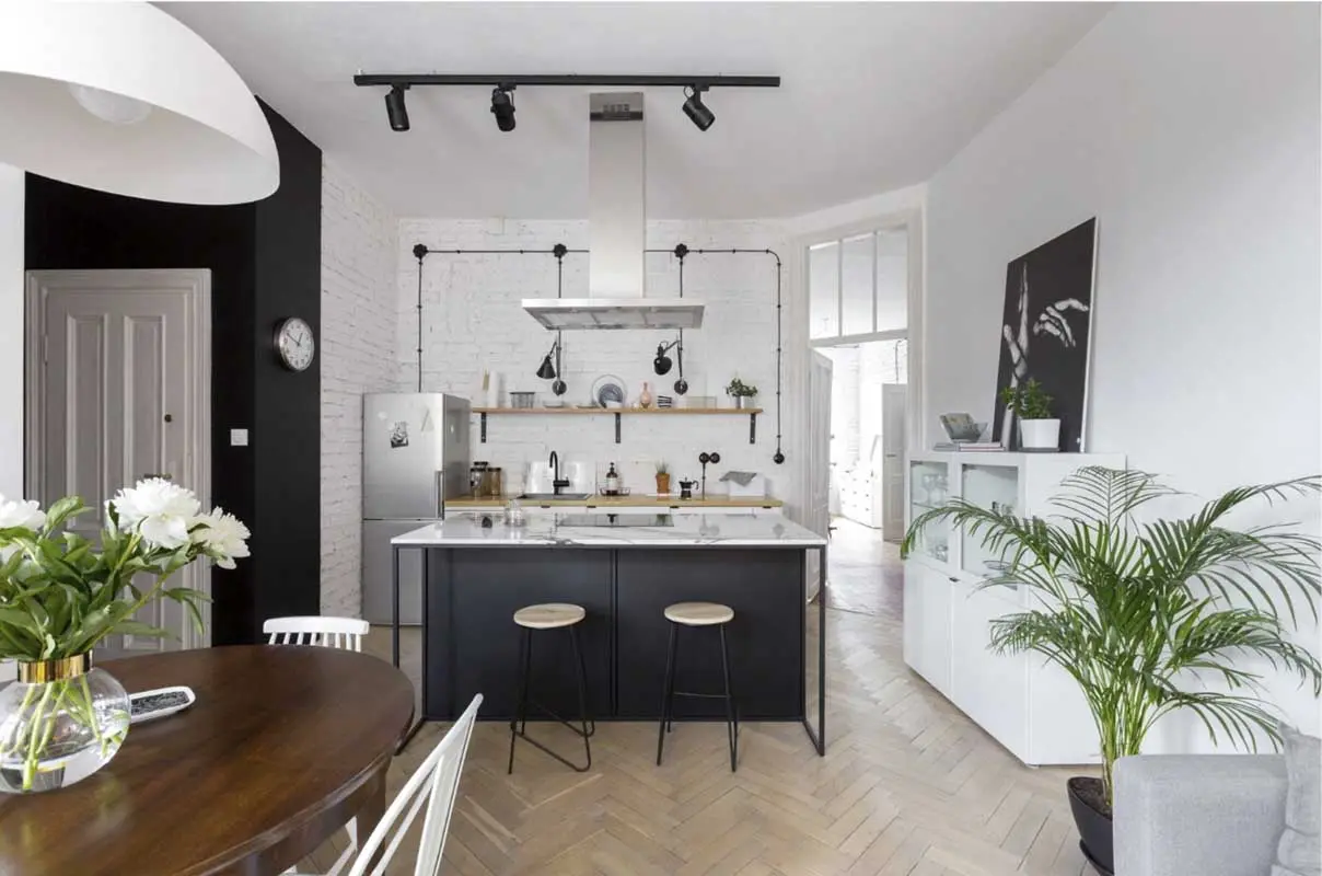 Industrialny klimat ujawnia się w wyeksponowanym, czarnym okablowaniu, a także metalowych elementach. Został on jednak złagodzony marmurowym akcentem, wykorzystanym min. jako blat wyspy kuchennej.