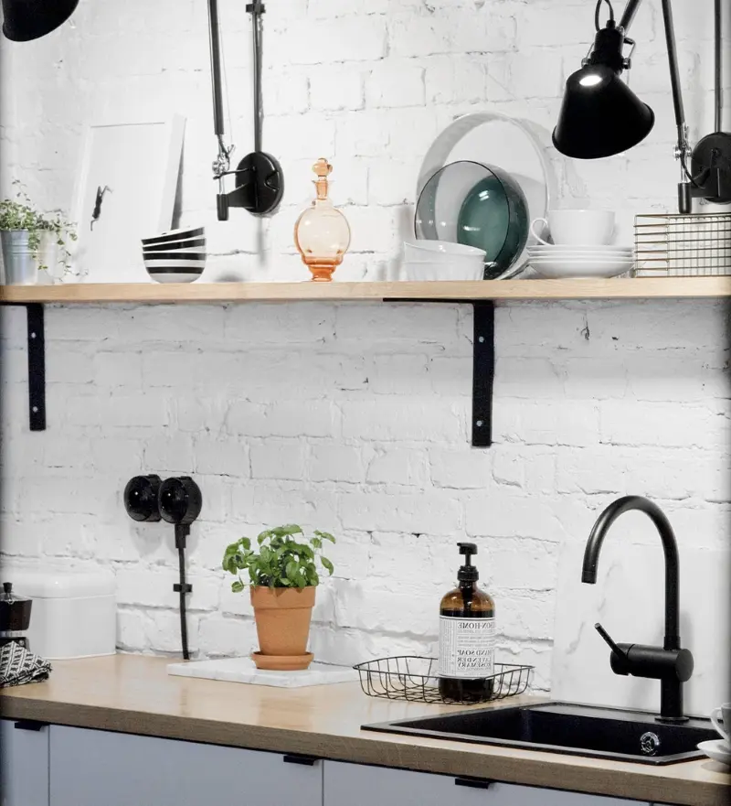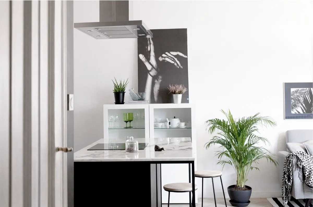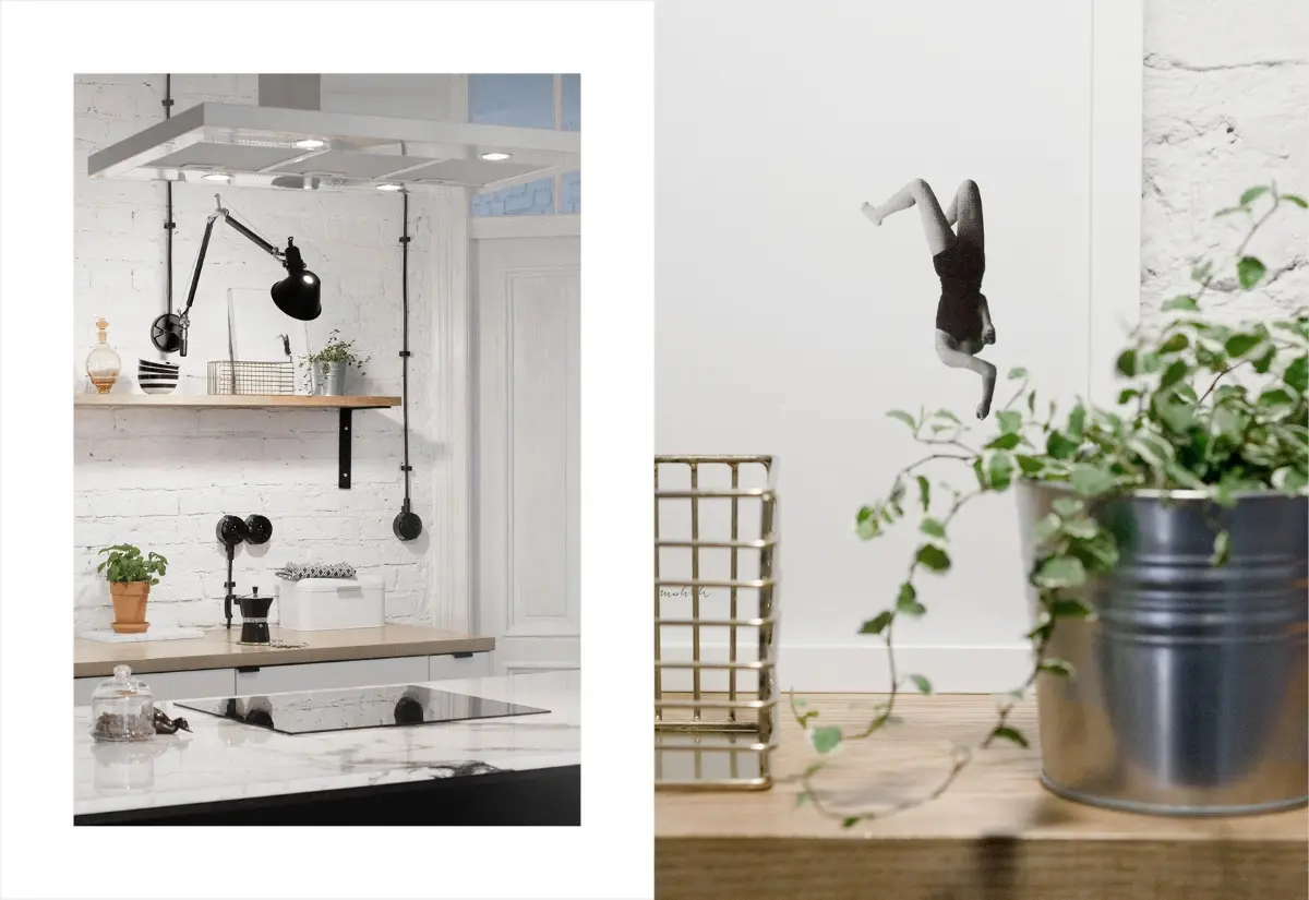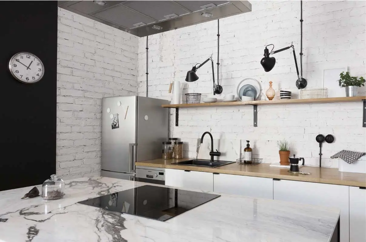 Industrialny klimat ujawnia się w wyeksponowanym, czarnym okablowaniu, a także metalowych elementach. Został on jednak złagodzony marmurowym akcentem, wykorzystanym min. jako blat wyspy kuchennej.