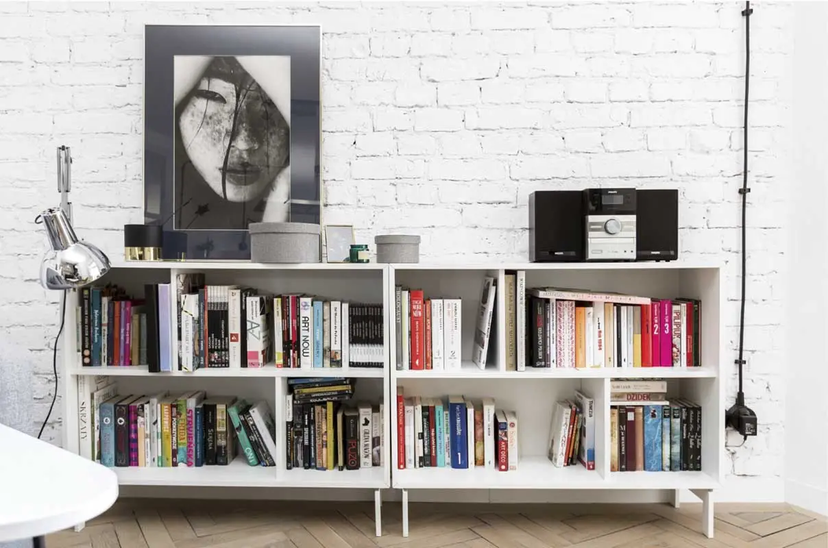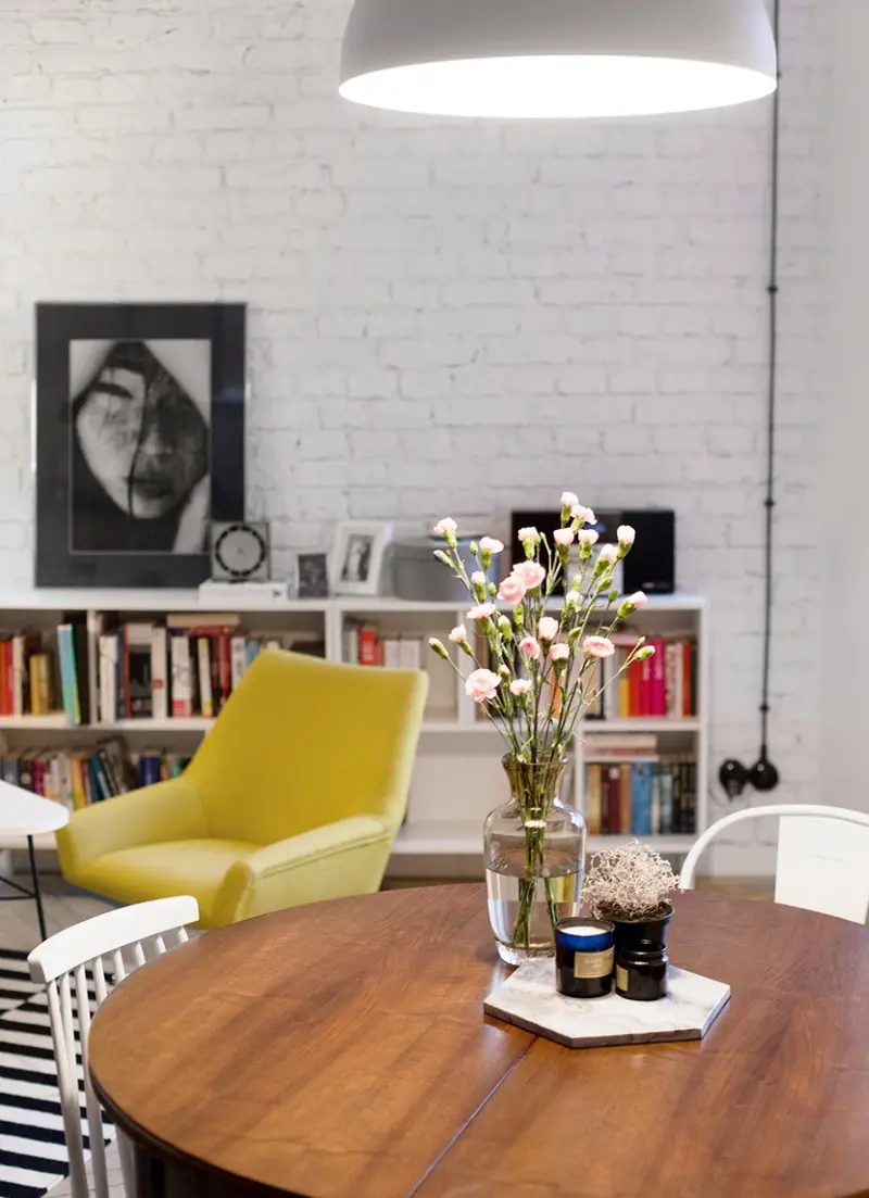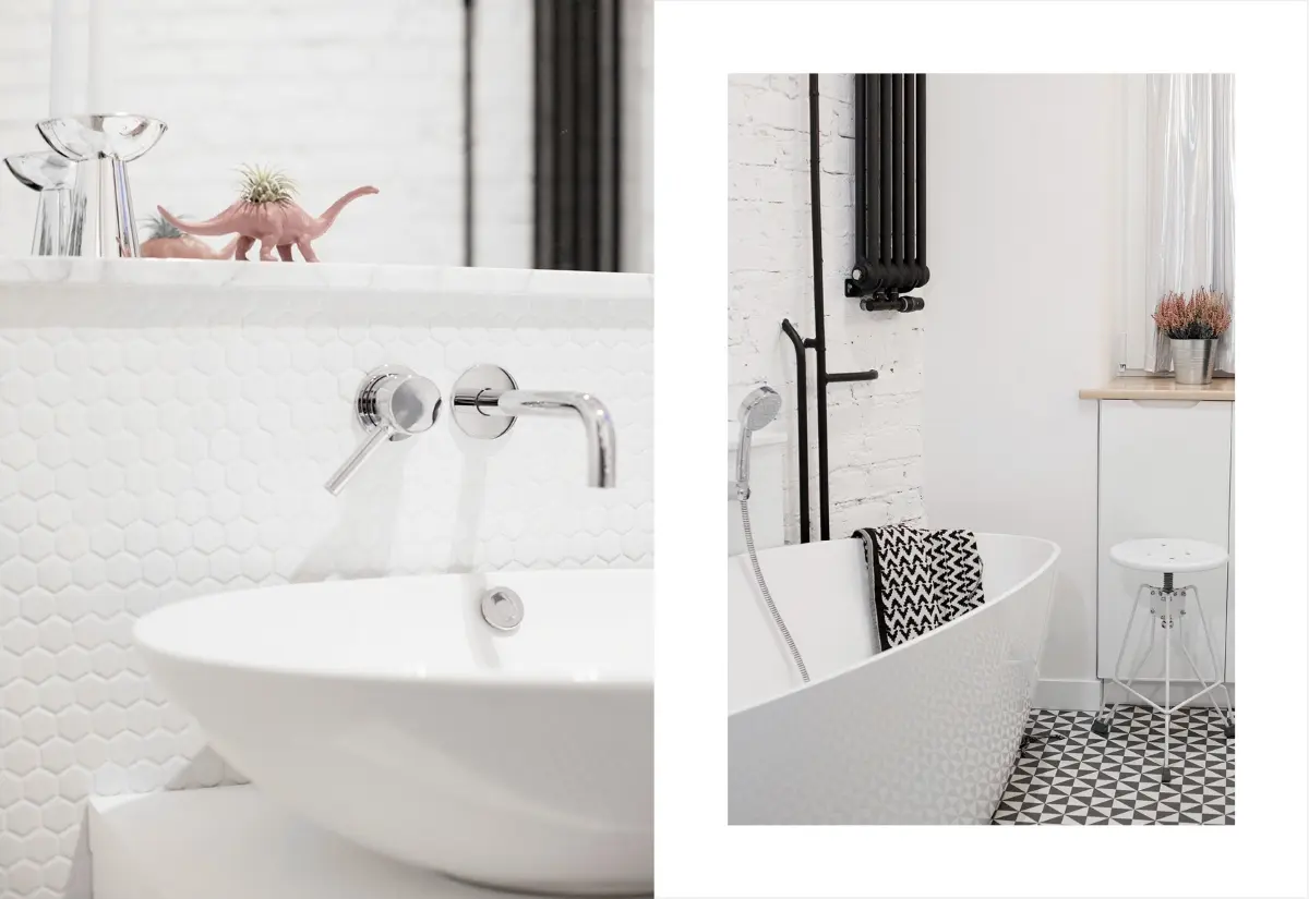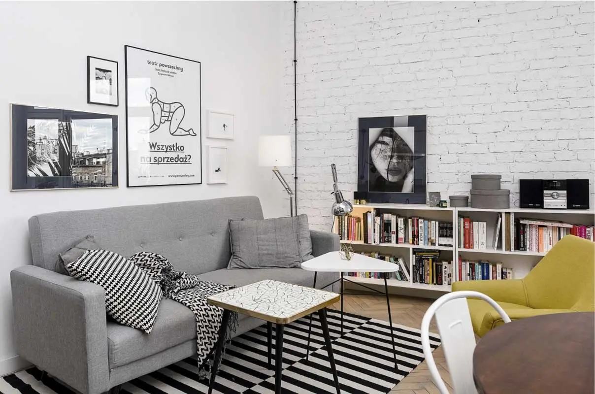 Monochromatyczna baza kolorystyczna, wprowadziła ład do wnętrza, w którym znajduje się bardzo dużo rzeczy. Sprytnie uniknięto chaosu, dzięki zastosowaniu jako dominującego zestawu połączenia bieli z czernią. Uzupełnienie stanowią akcenty barwne, takie jak musztardowy i butelkowozielony fotel, a także liczne grafiki, plakaty i zdjęcia dekorujące ściany.