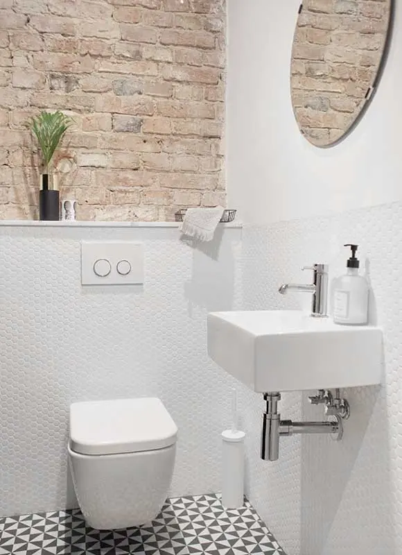 Łazienka, na pierwszy rzut oka, zdaje się być urządzona w bardzo zachowawczy sposób. Tutaj, wyjątkowo, pozwolono industrialnemu stylowi zagrać główną rolę. Natomiast, kiedy przyjrzymy się uważniej, zauważymy metaliczną zasłonę, ciekawą dekorację kabla na którym wiszą żarówki przy lustrze i mini doniczkę, zorganizowaną w figurce różowego dinozaura.
