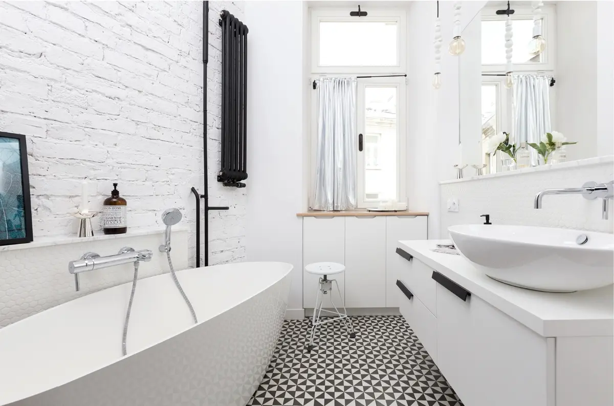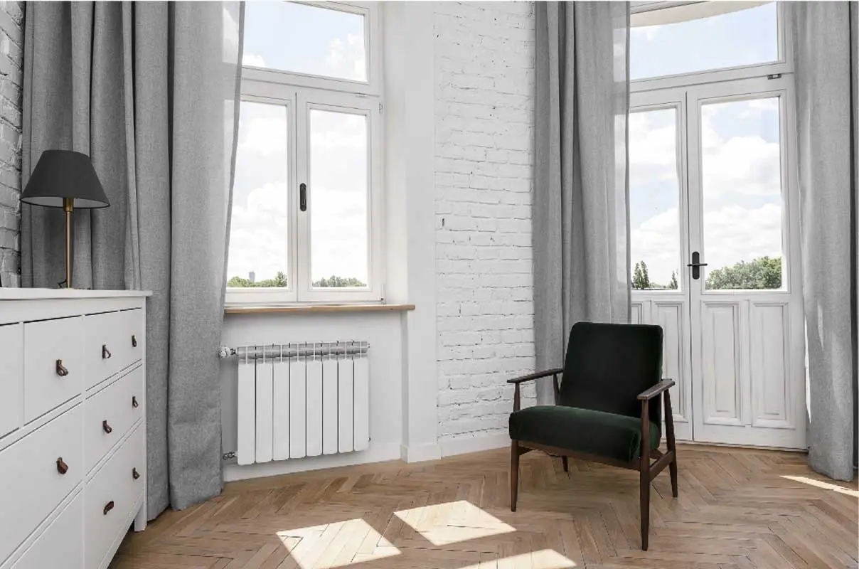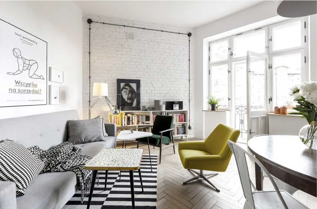 Strefa dzienna jest bardzo jasna i przestronna, przede wszystkim dzięki temu, że mieszkanie jest wysokie i posiada duże okna. Historia miejsca została podkreślona, poprzez wyeksponowanie oryginalnego drewnianego parkietu, ram okiennych wraz z drzwiami balkonowymi oraz ceglanych ścinań, pomalowanych na biało.