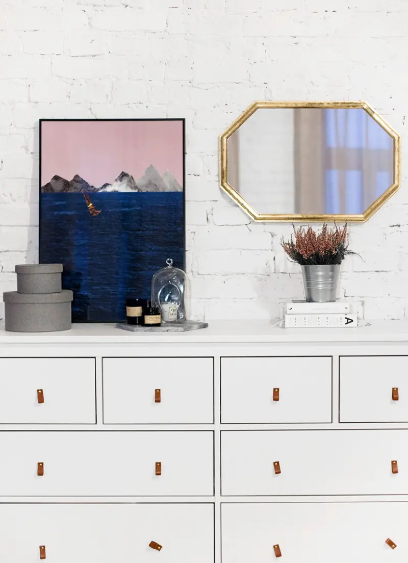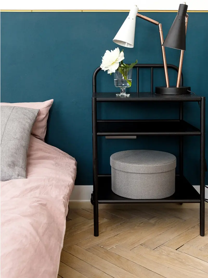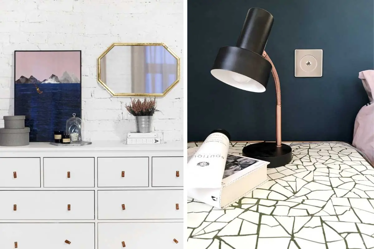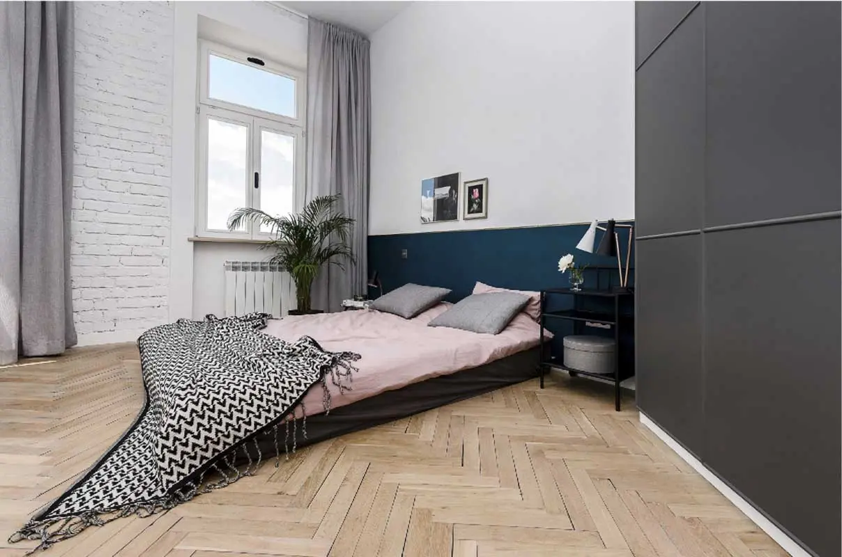 W minimalistycznej sypialni, udało się przemycić romantyczne motywy. Mimo ograniczonego wyposażenia, elementy dekoracyjne takie jak pastelowe dodatki, złota rama dekoracyjnego lustra czy różnego rodzaju puzderka, ocieplają wnętrze.