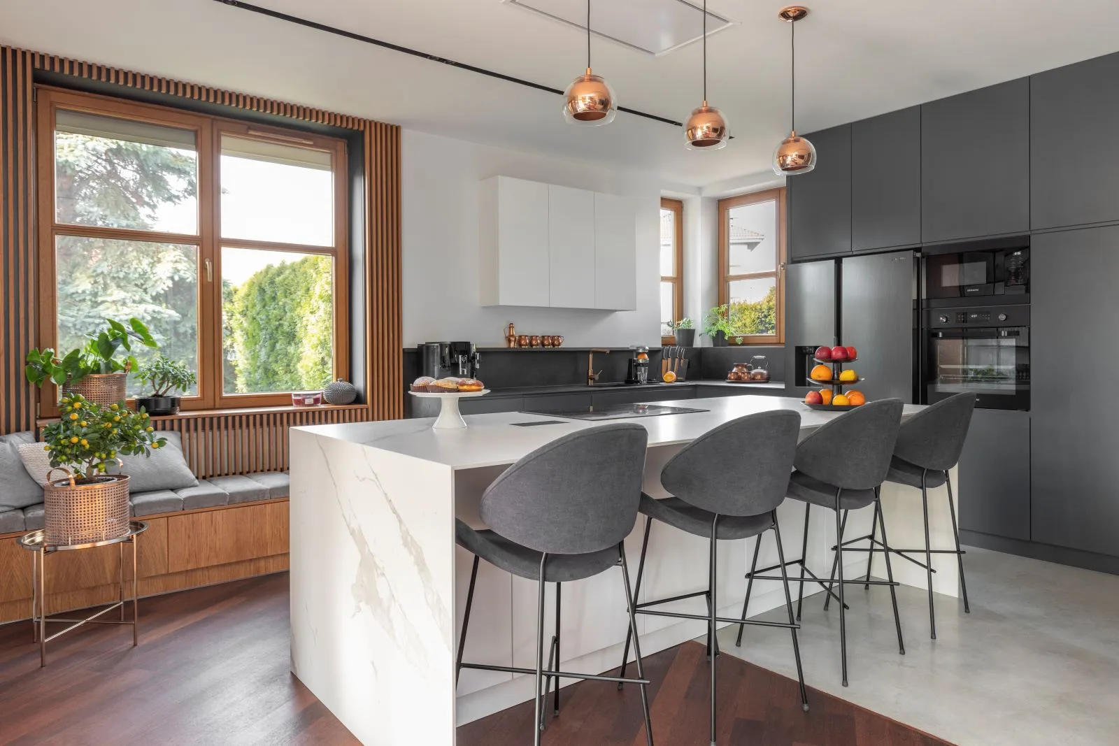 Sercem strefy dziennej jest prawie trzymetrowa wyspa kuchenna, wykonana ze spieku kuchennego, wokół której toczy się życie domowników. Kuchnia została zaprojektowana z myślą o funkcjonalności oraz projekt został podkreślony produktami najwyższej jakości. Przytulnego charakteru dodaje tapicerowane siedzisko, które jest zintegrowane z oknami. To ulubione miejsce właścicieli domu, gdzie chętnie spędzają czas z książką.