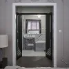 Bardzo istotną rolę w realizacji odegrała kompozycja kolorystyczna. W roli głównej występuje burzowy błękit, który stanowi idealne tło dla akcentów w nieco bardziej nasyconych barwach. W salonie wzrok przykuwają sofa oraz pufy w kolorze oberżyny. Dopełnieniem kompozycji są detale w kolorze złota. W jednej z łazienek króluje z kolei pudrowy róż, który zestawiono z ciemnym wyposażeniem i jasną, kamienną podłogą.