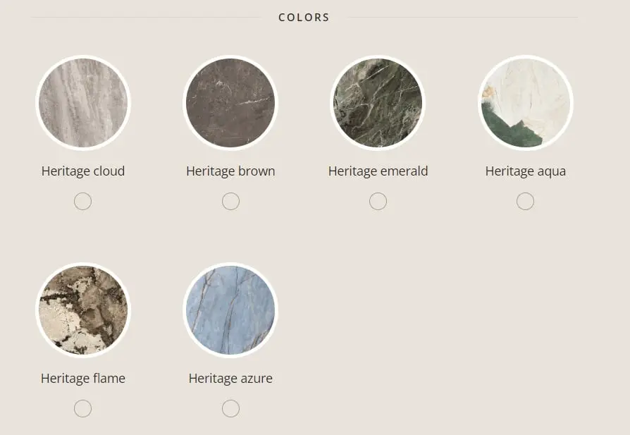 Czerpiąc inspirację ze szlachetnych naturalnych odcieni majestatycznych marmurów, kolekcja Heritage Luxe odkrywa przed nami na nowo artystyczne i architektoniczne dziedzictwo. Od wieków pałace, rzeźby i pomniki w Europie były tworzone z kolorowego marmuru, uważanego za perfekcyjną formę naturalnego malarstwa dzięki wyrazistemu żyłkowaniu i zróżnicowanej palecie barw.