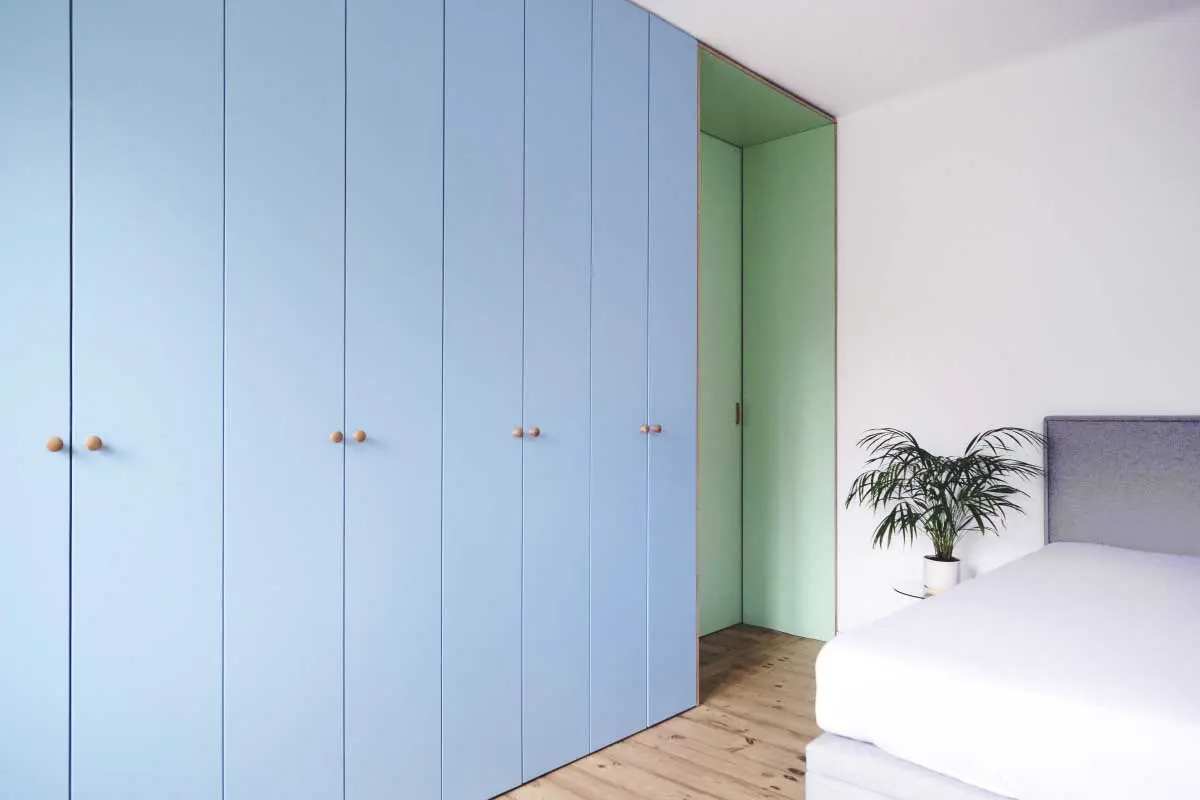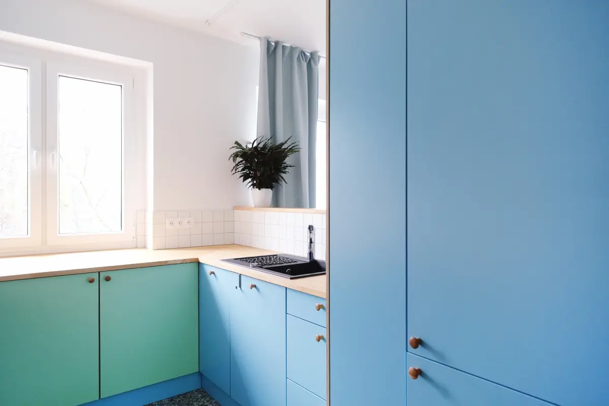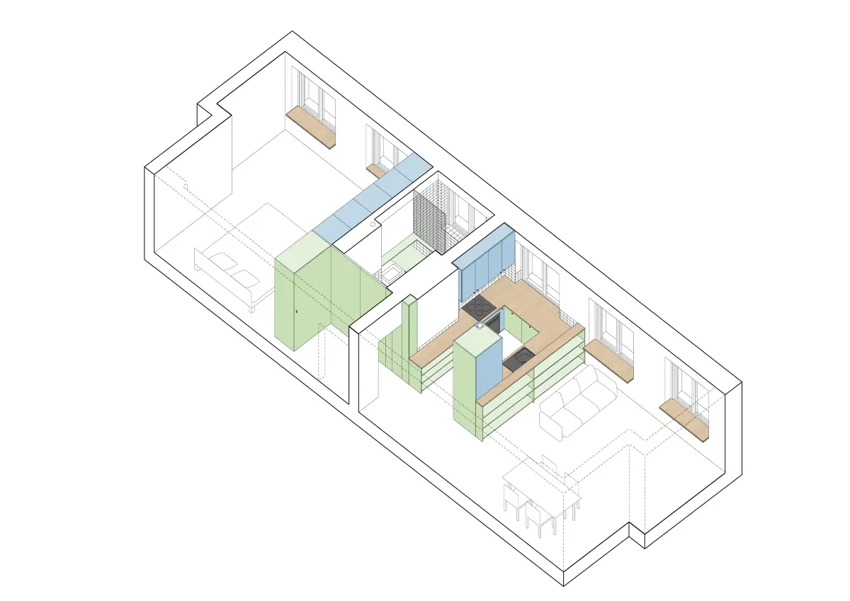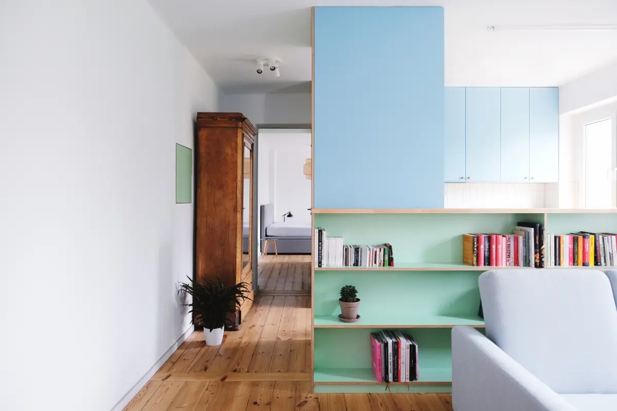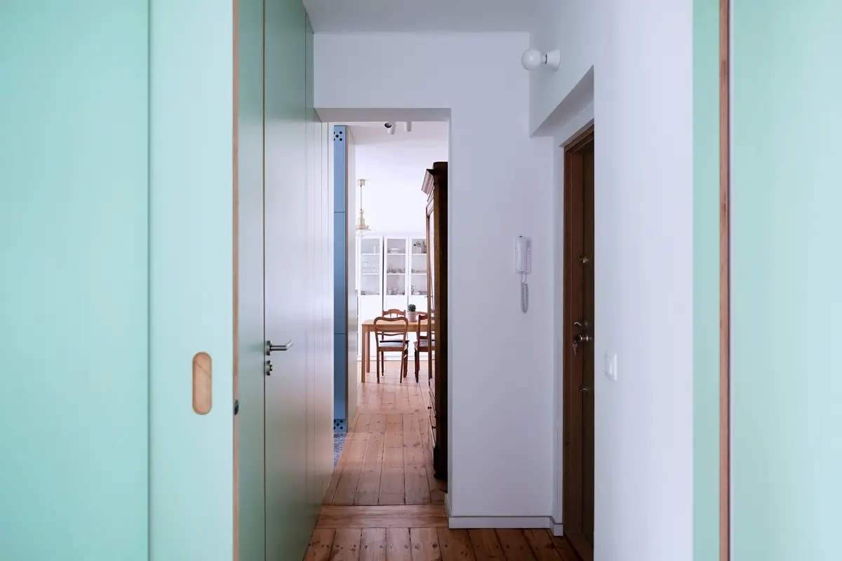 Poznańskie mieszkanie zostało podzielone na dwie strefy: dzienną i nocną. Osiągnięto to przez umieszczenie w jego centrum wielofunkcyjnego „sciano-mebla”, będącego współczesną wersją meblościanki. Pastelowe fronty w kolorze błękitu i zieleni, nawiązują do stylistyki modernizmu. Echem ówczesnych rozwiązań, jest także wykorzystanie tej zabudowy jako licznych miejsc do przechowywania, dzięki czemu we wnętrzu panuje wyjątkowy ład. Łazienka również jest ukłonem w stronę tamtej epoki. Ciekawie zorganizowana strefa prysznica, którą od reszty pomieszczenia oddziela niska ścianka, poza walorami estetycznymi, jest bardzo łatwa w utrzymaniu czystości. Podłogę w tym miejscu, postanowiono pokryć płytkami o teksturze granitu, który odnosi się do oryginalnych rozwiązań stosowanych w latach 50. Architekci postawili również na elementy vintage w wyposażeniu mieszkania: w korytarzu stanęła piękny drewniany kredens, a przy stole jadalnianym rozkompletowany zestaw krzeseł.
