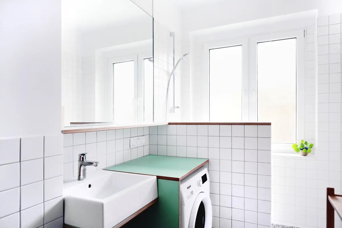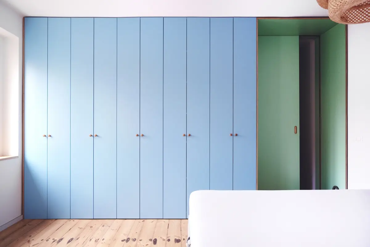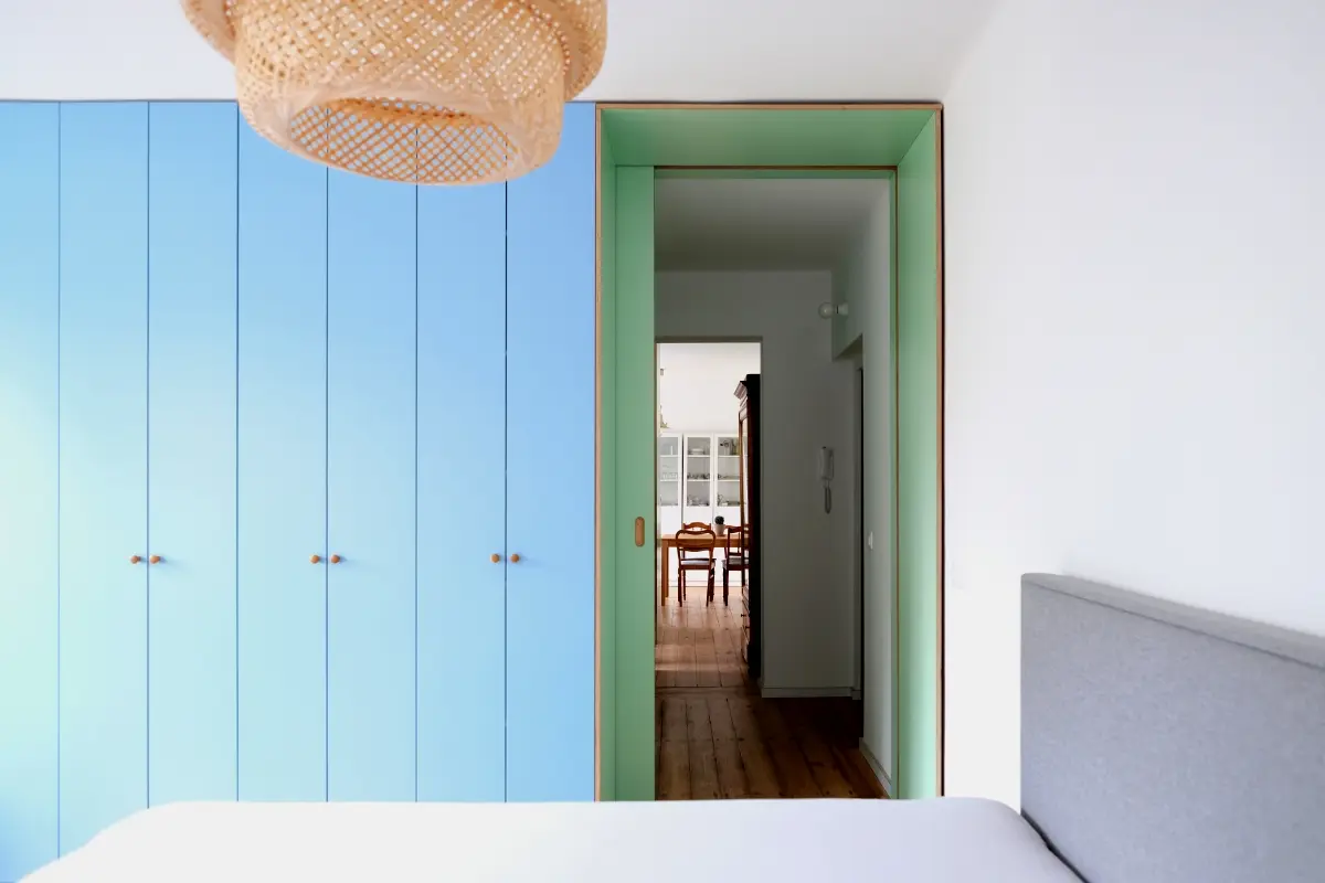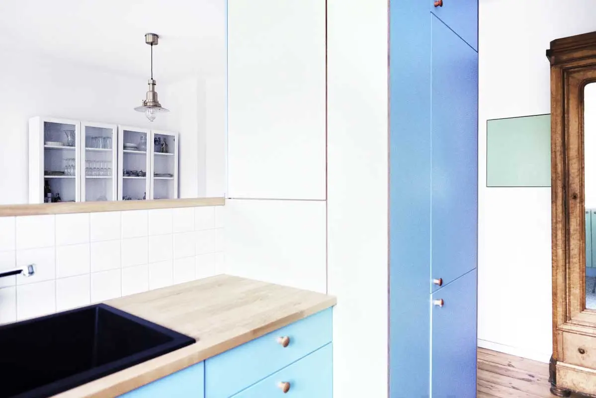 Poznańskie mieszkanie zostało podzielone na dwie strefy: dzienną i nocną. Osiągnięto to przez umieszczenie w jego centrum wielofunkcyjnego „sciano-mebla”, będącego współczesną wersją meblościanki. Pastelowe fronty w kolorze błękitu i zieleni, nawiązują do stylistyki modernizmu. Echem ówczesnych rozwiązań, jest także wykorzystanie tej zabudowy jako licznych miejsc do przechowywania, dzięki czemu we wnętrzu panuje wyjątkowy ład. Łazienka również jest ukłonem w stronę tamtej epoki. Ciekawie zorganizowana strefa prysznica, którą od reszty pomieszczenia oddziela niska ścianka, poza walorami estetycznymi, jest bardzo łatwa w utrzymaniu czystości. Podłogę w tym miejscu, postanowiono pokryć płytkami o teksturze granitu, który odnosi się do oryginalnych rozwiązań stosowanych w latach 50. Architekci postawili również na elementy vintage w wyposażeniu mieszkania: w korytarzu stanęła piękny drewniany kredens, a przy stole jadalnianym rozkompletowany zestaw krzeseł.