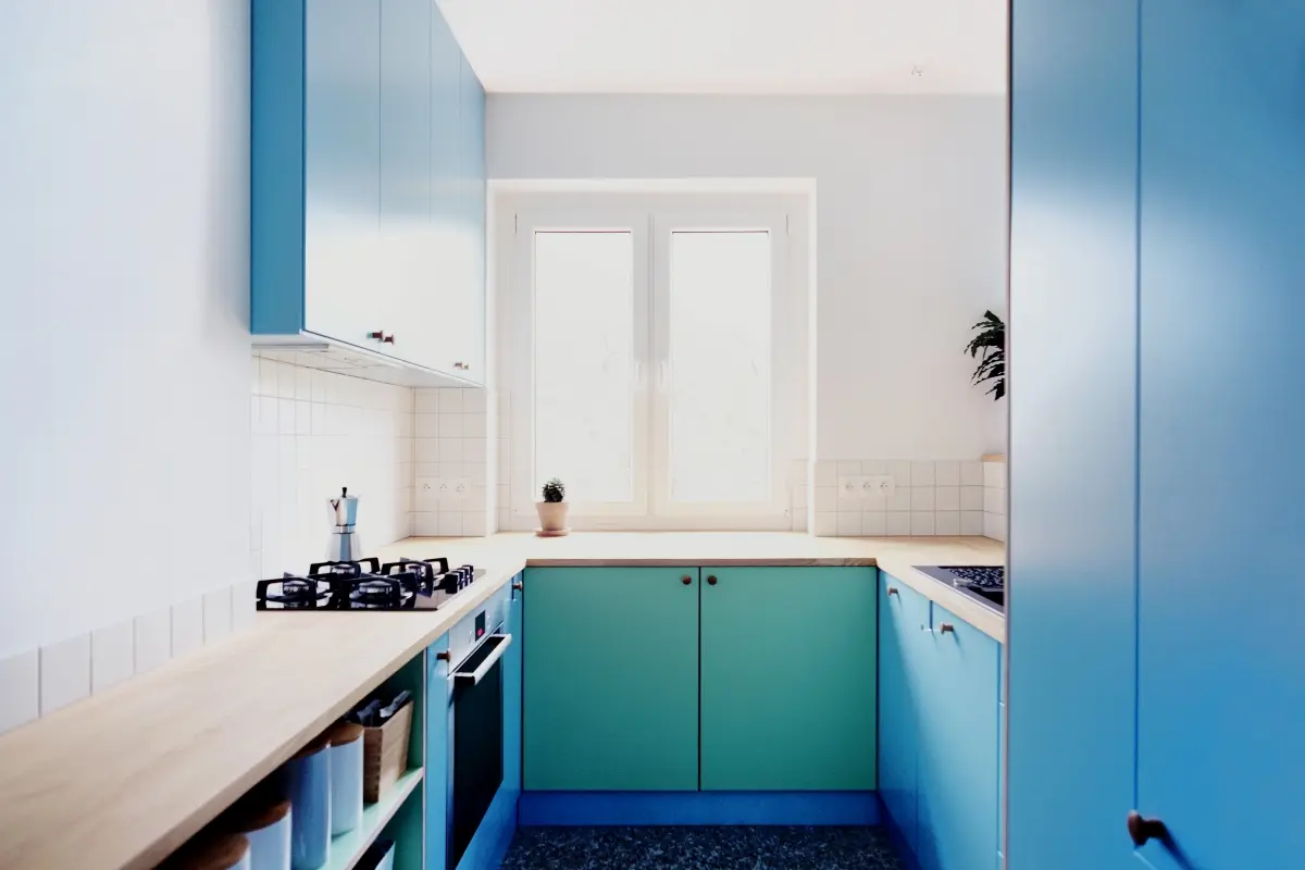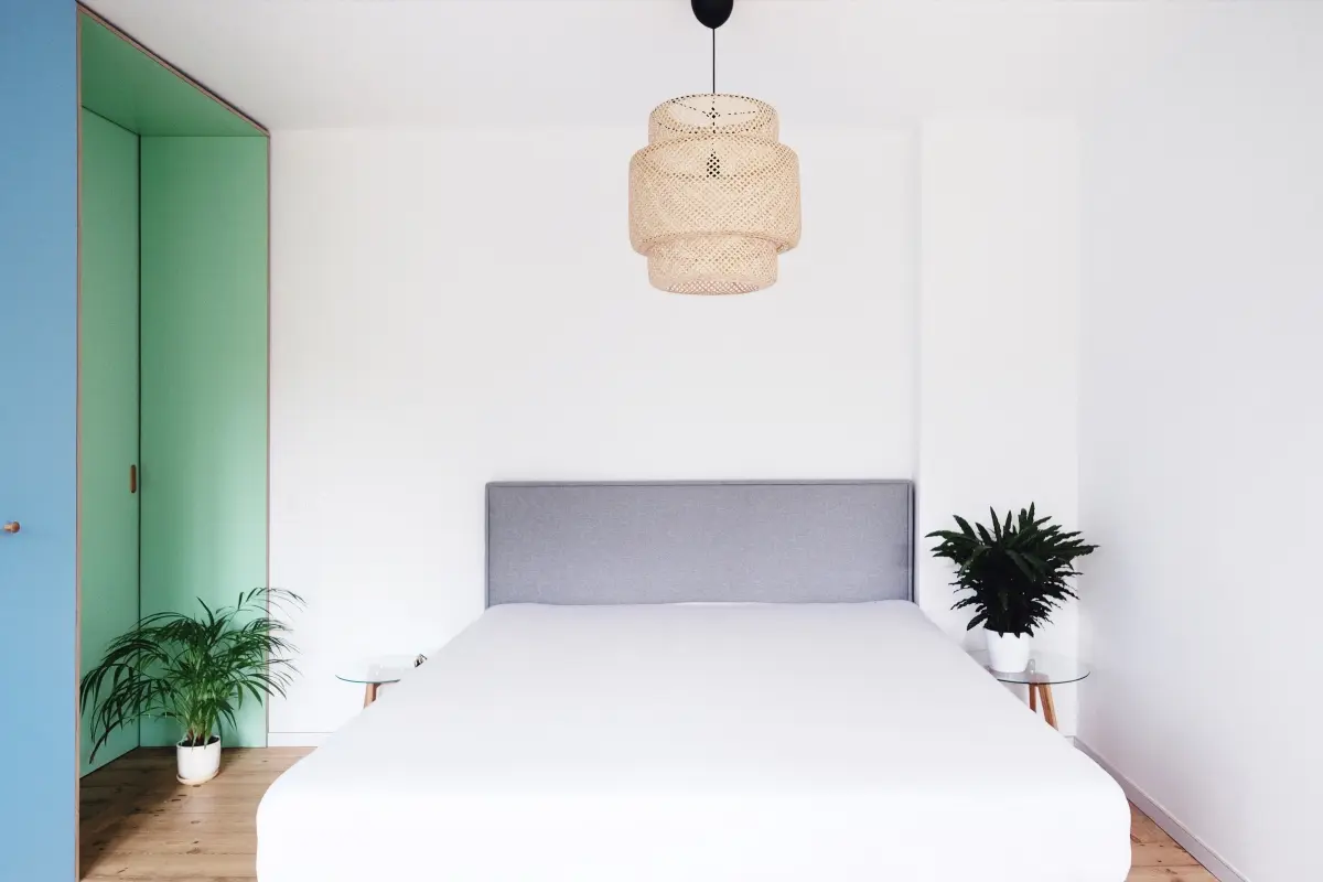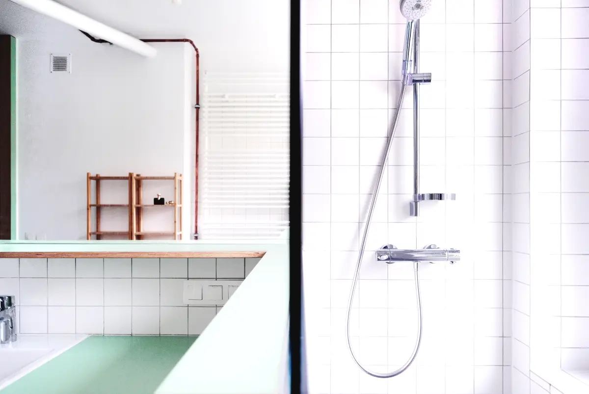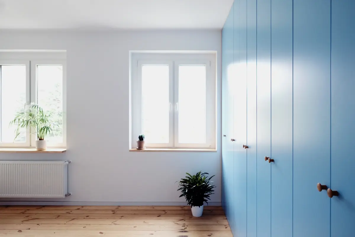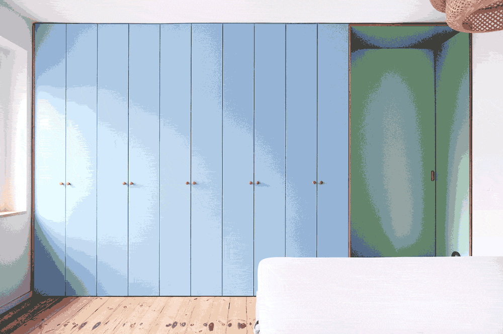 Poznańskie mieszkanie zostało podzielone na dwie strefy: dzienną i nocną. Osiągnięto to przez umieszczenie w jego centrum wielofunkcyjnego „sciano-mebla”, będącego współczesną wersją meblościanki. Pastelowe fronty w kolorze błękitu i zieleni, nawiązują do stylistyki modernizmu. Echem ówczesnych rozwiązań, jest także wykorzystanie tej zabudowy jako licznych miejsc do przechowywania, dzięki czemu we wnętrzu panuje wyjątkowy ład. Łazienka również jest ukłonem w stronę tamtej epoki. Ciekawie zorganizowana strefa prysznica, którą od reszty pomieszczenia oddziela niska ścianka, poza walorami estetycznymi, jest bardzo łatwa w utrzymaniu czystości. Podłogę w tym miejscu, postanowiono pokryć płytkami o teksturze granitu, który odnosi się do oryginalnych rozwiązań stosowanych w latach 50. Architekci postawili również na elementy vintage w wyposażeniu mieszkania: w korytarzu stanęła piękny drewniany kredens, a przy stole jadalnianym rozkompletowany zestaw krzeseł.