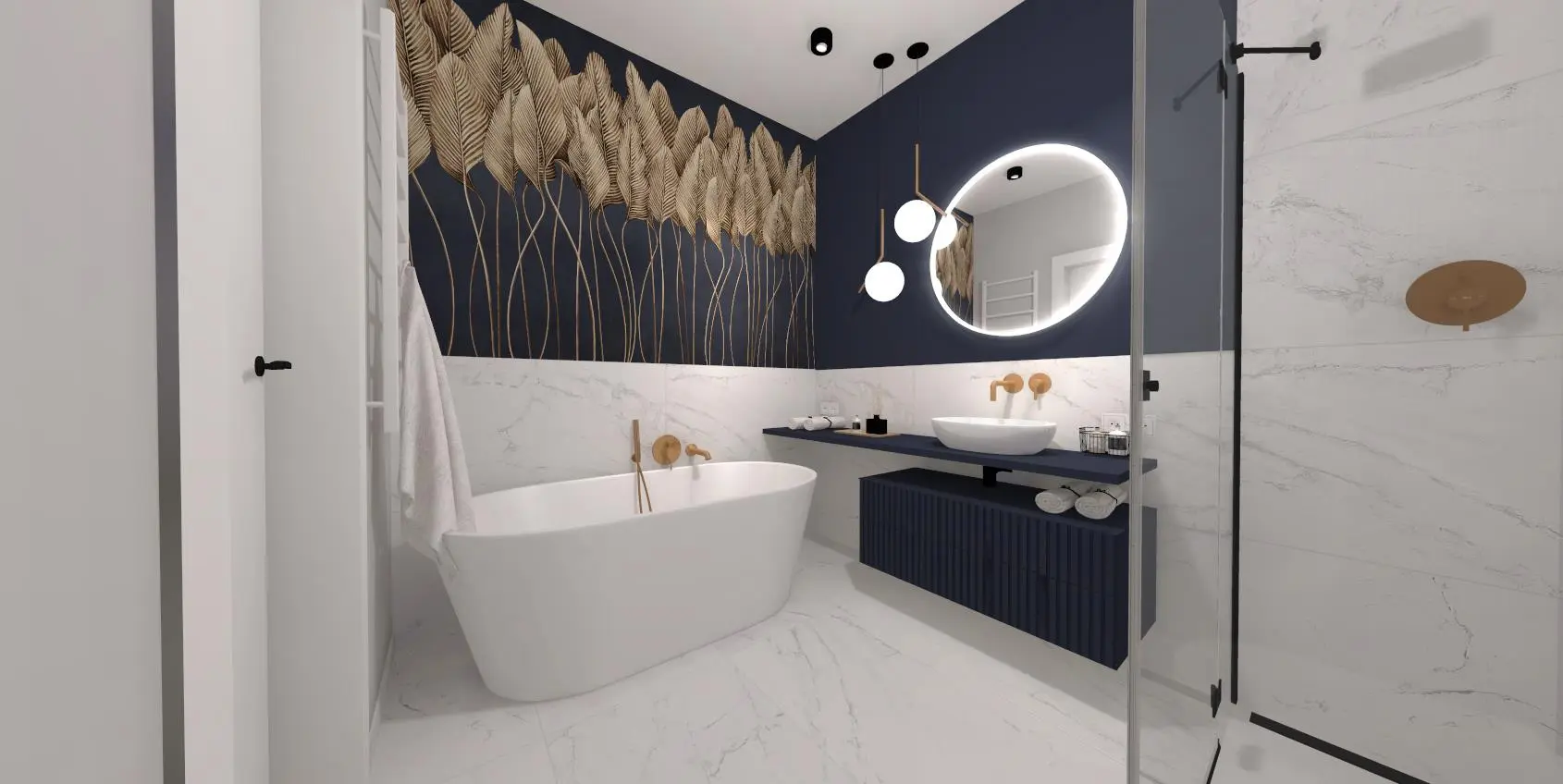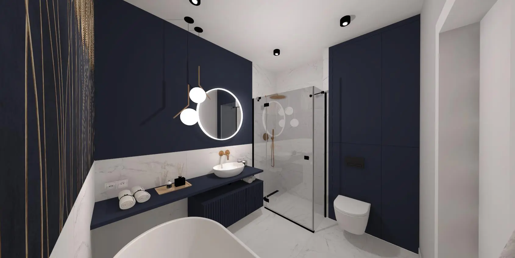 Kiedyś w łazience rządziły zachowawcze biele, beże i szarości. Jednak odchodzimy od nich i powoli wprowadzamy coraz więcej koloru. Dziś zainteresowanie budzi o wiele więcej barw, również tych o zdecydowanie ciemniejszej tonacji, jak dostojny granat. Jest ceniony za wyważoną elegancję i jednoczesne odejście od sztampy i nudy. Jesteś fanem granatu? Marzysz o nietuzinkowej, eleganckiej i funkcjonalnej łazience? Poznaj projekt, który jest kwintesencją dobrego stylu i niebanalnych rozwiązań. W łazience z wanną Hushlab Bowls, wolnostojącą postawiono na ciekawe rozwiązania.