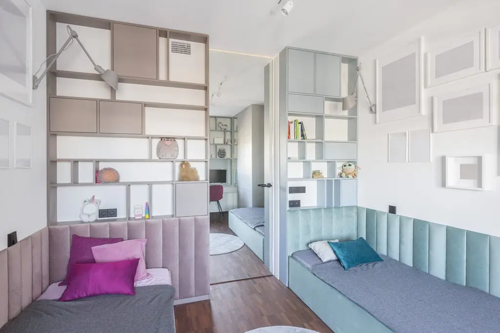 Podłoga w salonie to przemysłowy parkiet z różnych gatunków egzotycznego drewna. Architektki zaproponowały do niego meble w naturalnym, jasnym odcieniu. Część prywatna mieszkania to sypialnia oraz pokój dziewczynek wizualnie podzielony kolorami na dwie części.