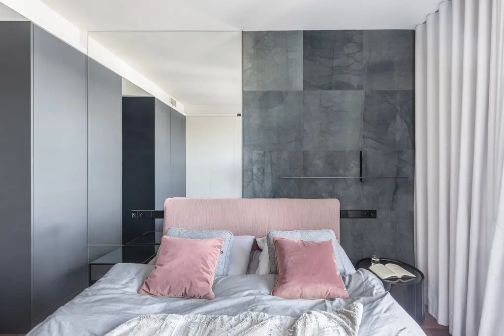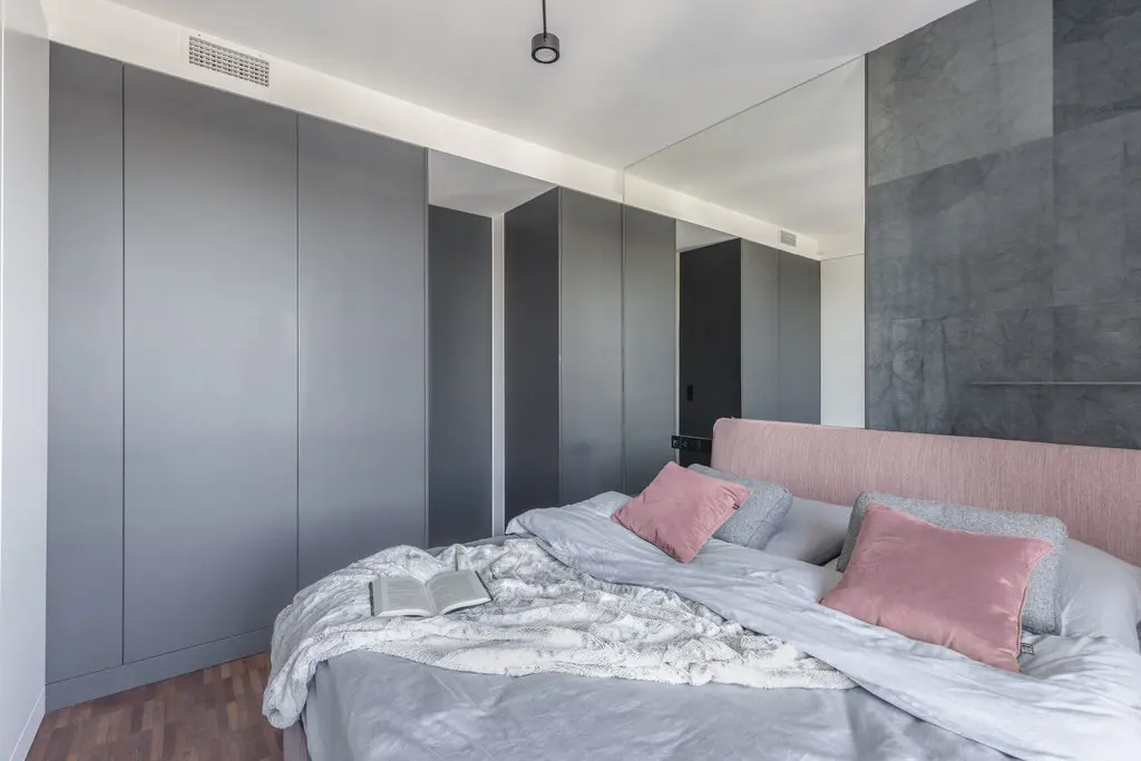 Ściany sypialni rodziców zabudowane zostały w kształt litery L pojemnymi szafami o szarych i białych frontach. Pokój powiększa ogromne lustro sąsiadujące z ciekawą fakturą wykładziny, którą wyłożona została ściana u szczytu łóżka.