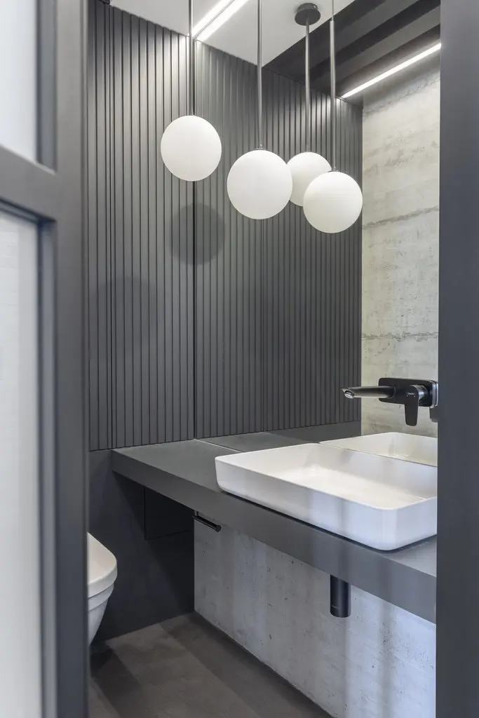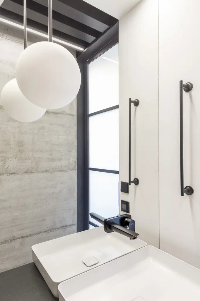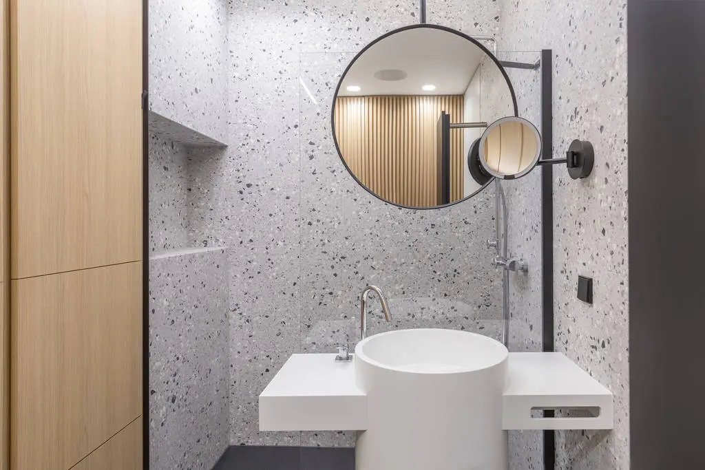 W stumetrowym mieszkaniu przewidziano łazienkę i oddzielną toaletę. Łazienka utrzymana jest w jasnej kolorystyce. Bazę stanowi zabudowa fornirowana dębem w naturalnym odcieniu oraz płytki marki, współczesna interpretacja terazzo, która łączy w sobie wenecką elegancję z praktycznością parcelowanego gresu.