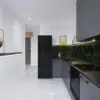 Kuchnia kawalerki jest oddzielnym pomieszczeniem, co umożliwia swobodne korzystanie z niej, niezależnie od innych funkcji w mieszkaniu. Została zaprojektowana z myślą o minimalistycznym stylu i praktyczności. Zabudowa kuchenna w kolorze antracytowym doskonale komponuje się z butelkową zieleń płytek z typu zellige, które zostały umieszczone na ścianie nad blatem roboczym. Ciekawym zabiegiem jest przedłużenie blatu roboczego w formie litery L, dzięki czemu przy oknie powstało miejsce do szybkich posiłków lub picia kawy.