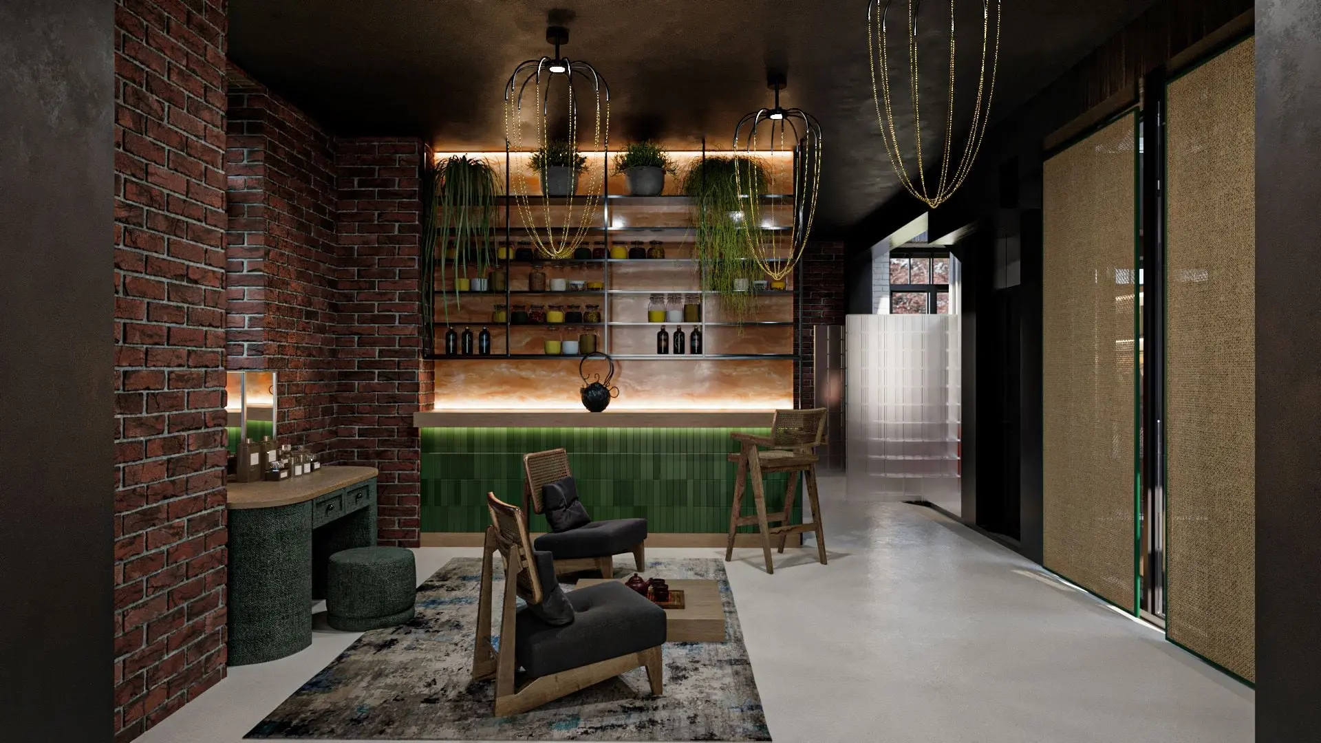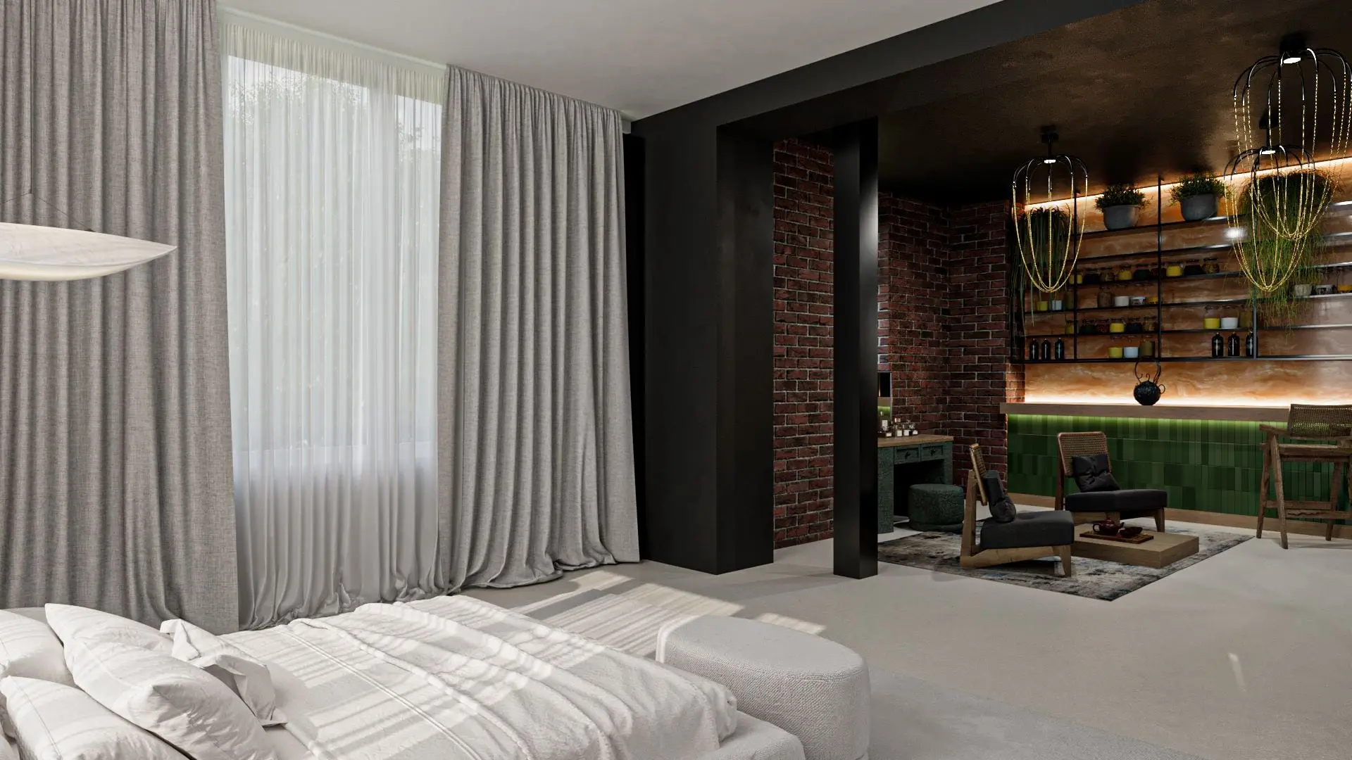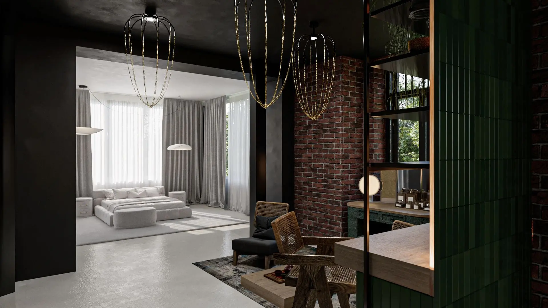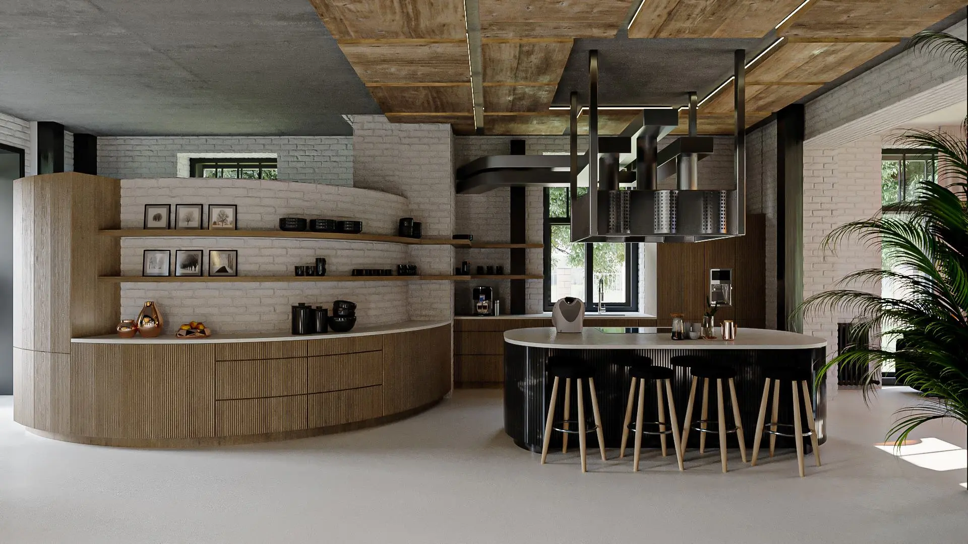 Tło aranżacji, czyli beton i szara cegła, stanowi solidne fundamenty estetycznego wnętrza. Te surowe elementy zostały jednak odpowiednio ocieplone poprzez zastosowanie ryflowanego drewna. To drewno nadaje wnętrzom przytulności i harmonii, tworząc kontrast między nowoczesnym, industrialnym charakterem a przytulnym, naturalnym elementem.