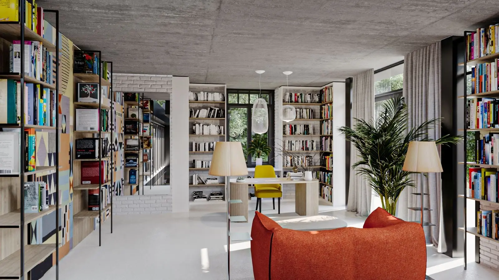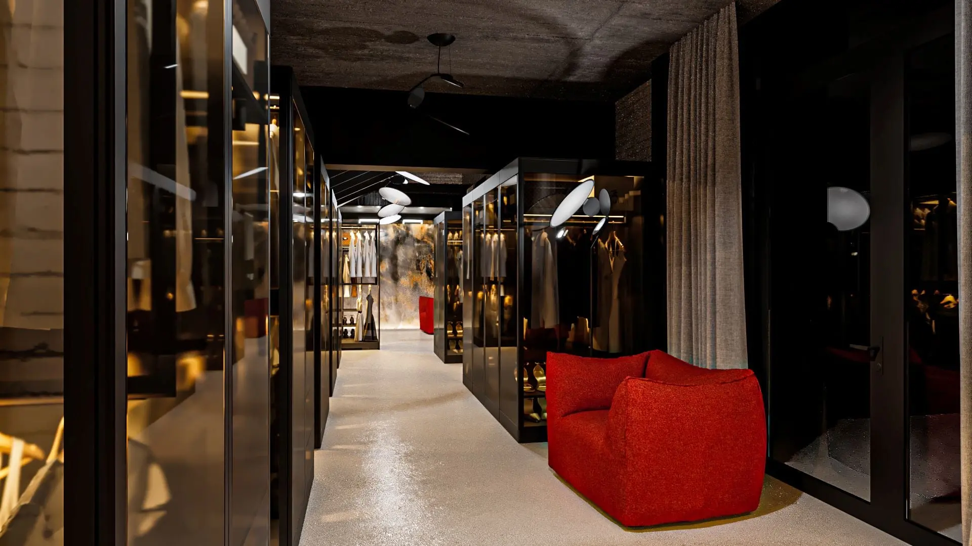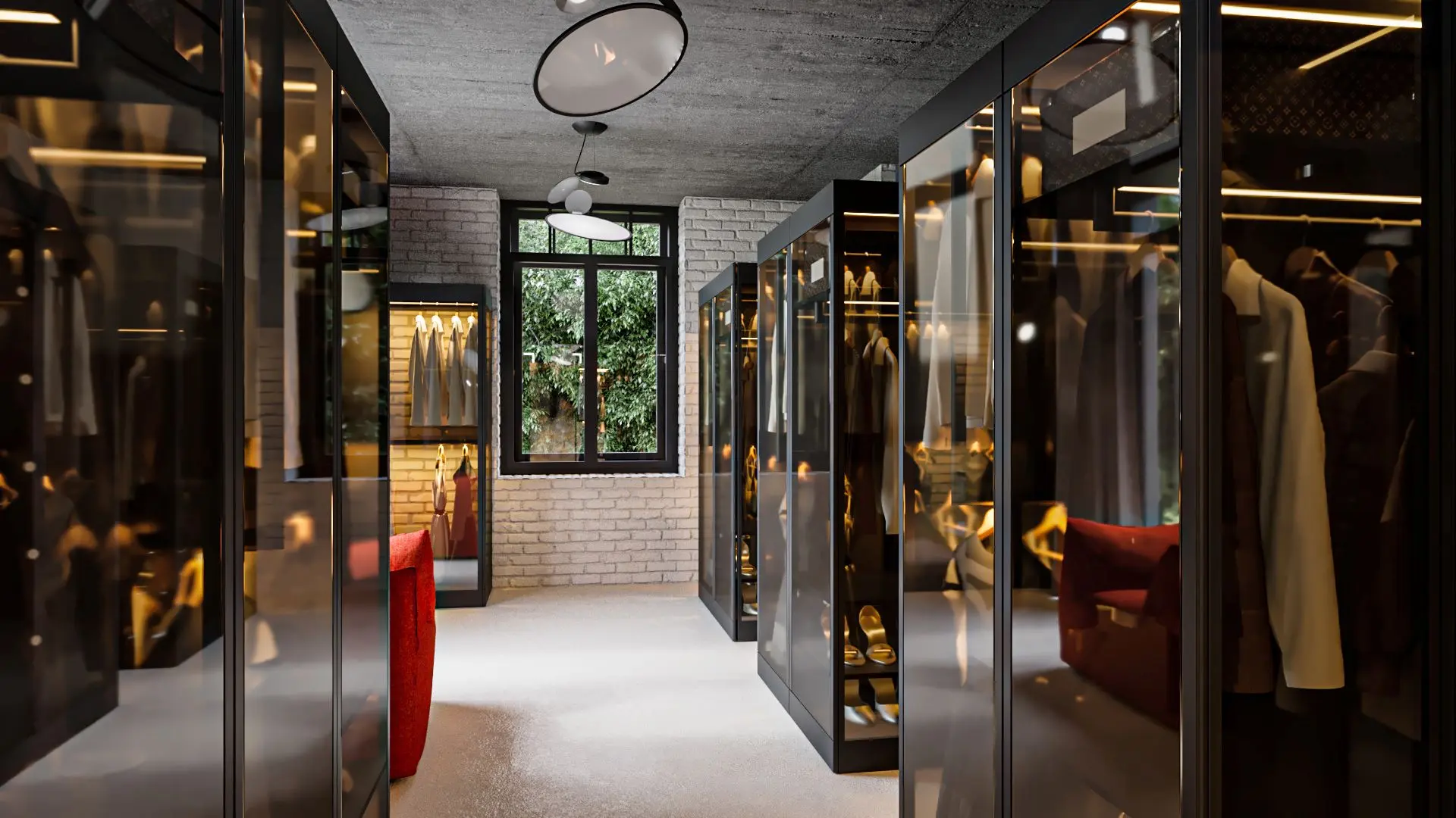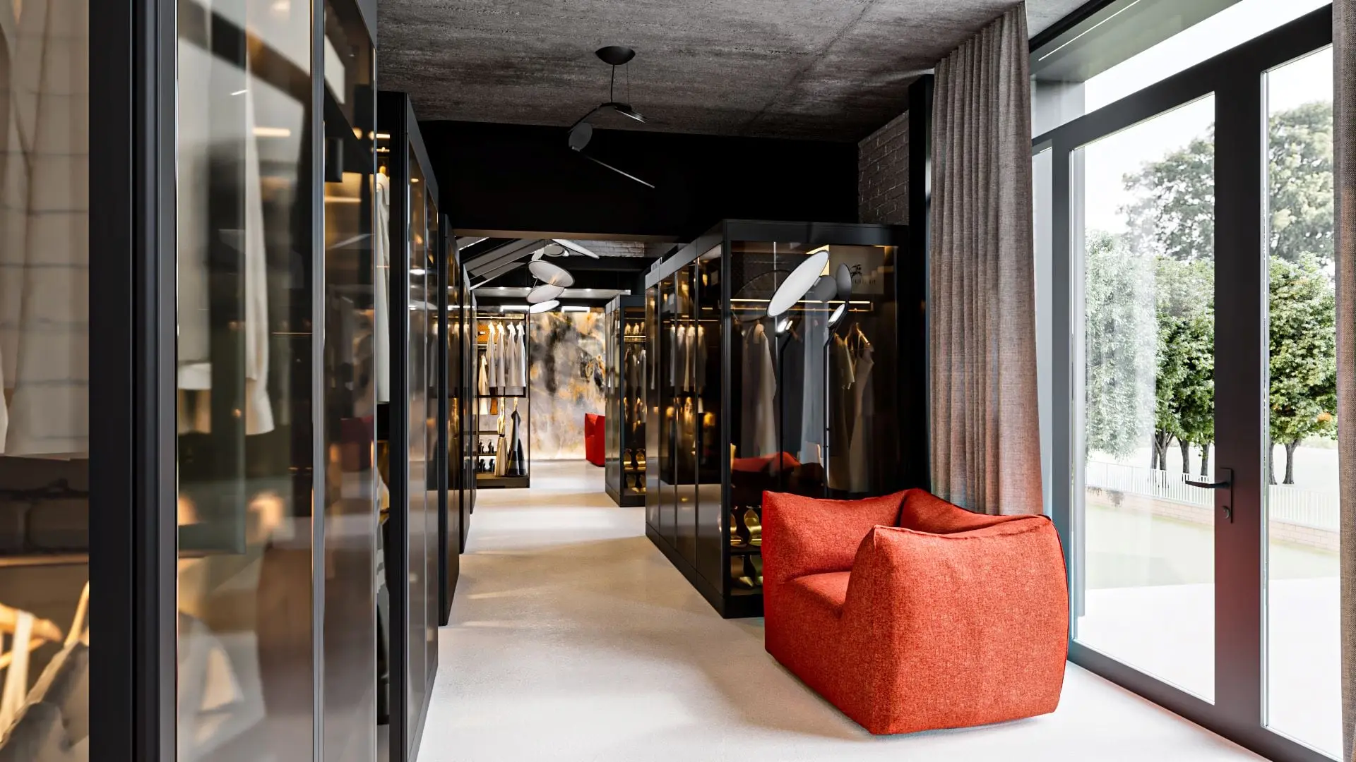 W domu, mimo obecności licznych elementów elektrycznych, panuje wyjątkowa harmonia. Aranżacja wnętrza opiera się na zrównoważonym połączeniu surowych materiałów, takich jak beton i szara cegła, z ciepłym ryflowanym drewnem, co nadaje pomieszczeniom niezwykłego charakteru.