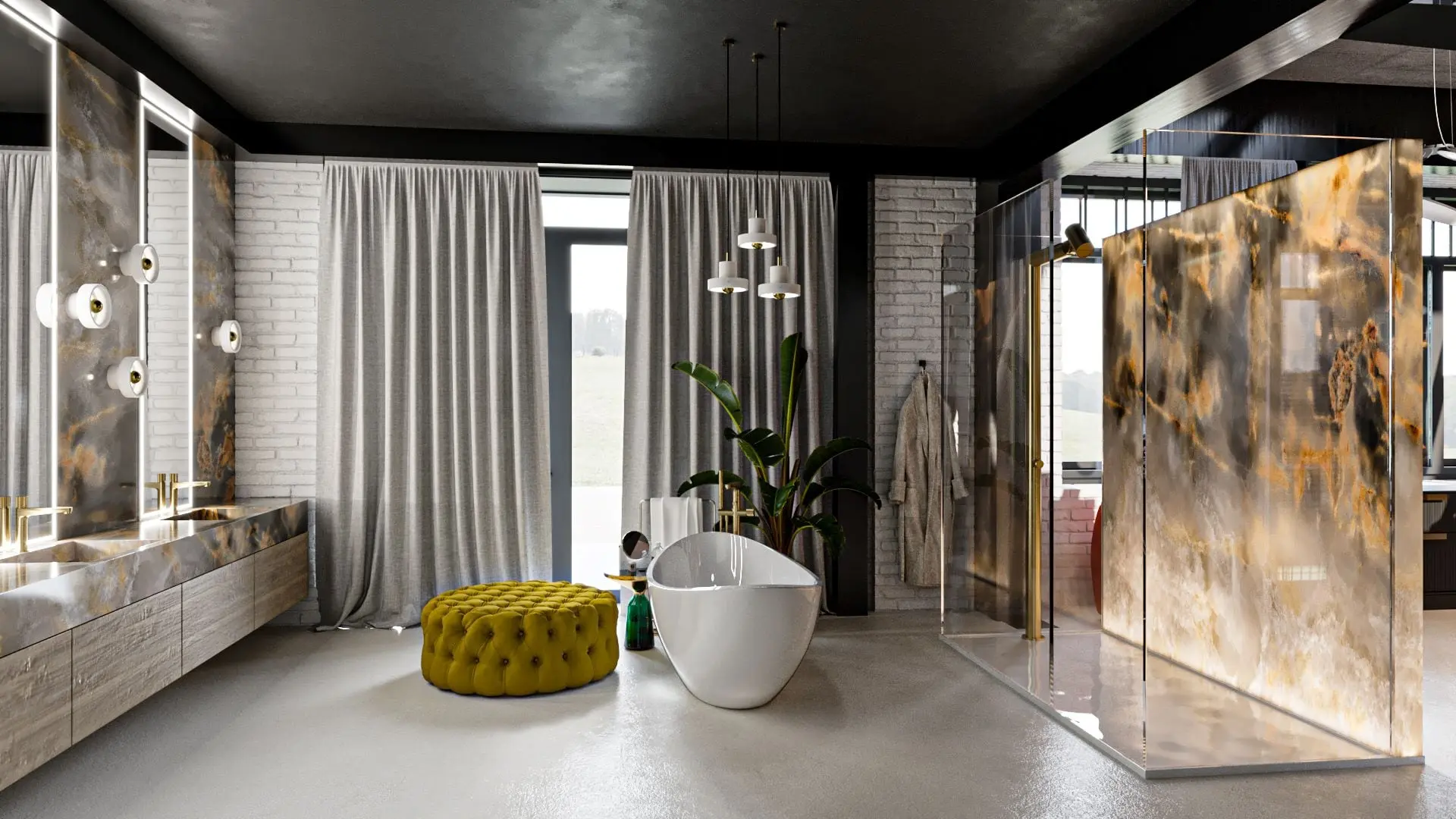 Jasne kolory i minimalistyczny design nadają salonowi kąpielowemu elegancję i nowoczesność. Klasyczne marmurowe płytki, ciekawe akcenty oraz stonowana kolorystyka tworzą spokojną atmosferę, sprzyjającą relaksowi. Ciepłe, naturalne materiały, takie jak kamień, dodają wnętrzu charakteru i przytulności.