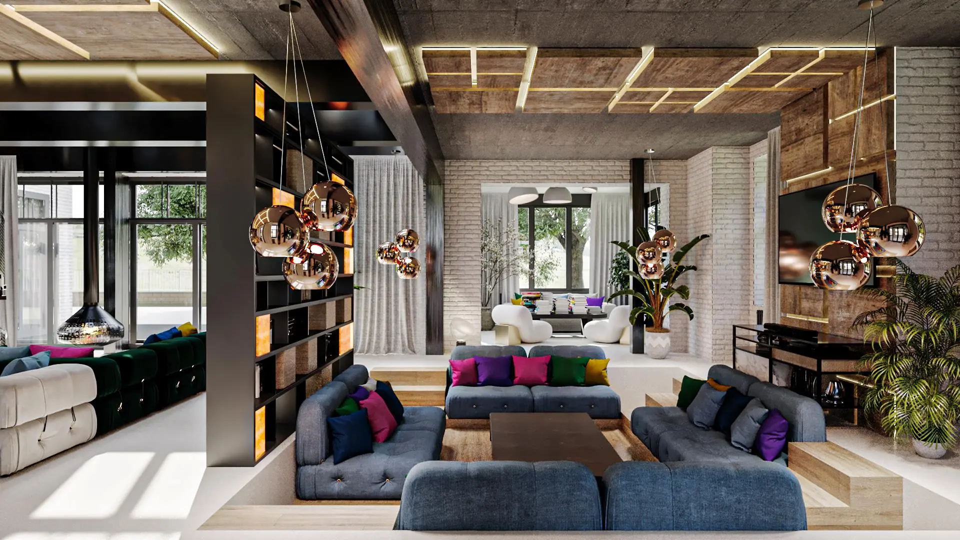 Salon to serce domu, miejsce, gdzie można zrelaksować się po dniu pełnym wyzwań i obowiązków. Wygodne sofy, fotele zachęcają do odpoczynku, a ciepłe oświetlenie tworzy atmosferę intymności. Duże okna pozwalają na dostęp naturalnego światła i zapewniają piękny widok na otaczającą przyrodę.