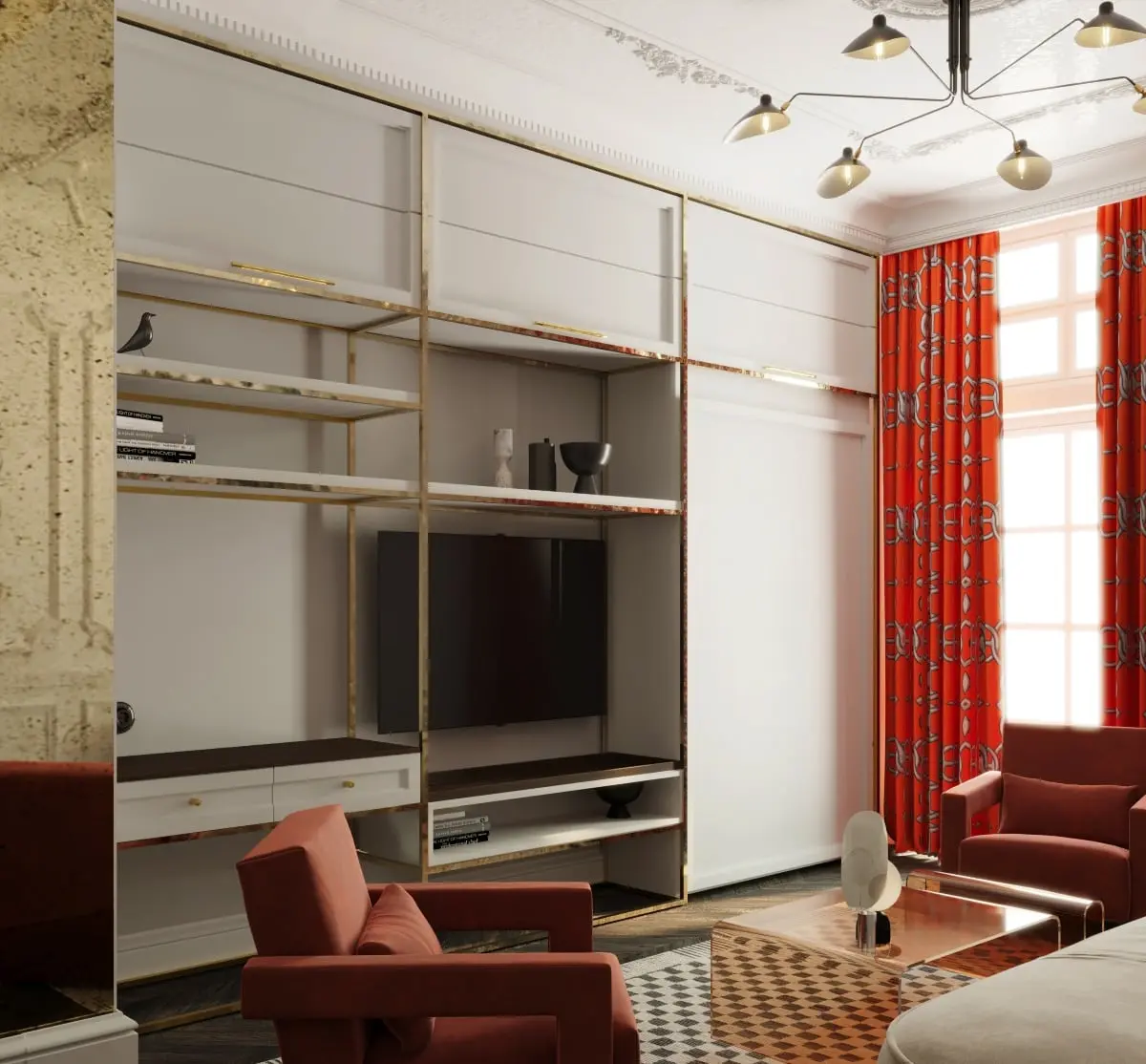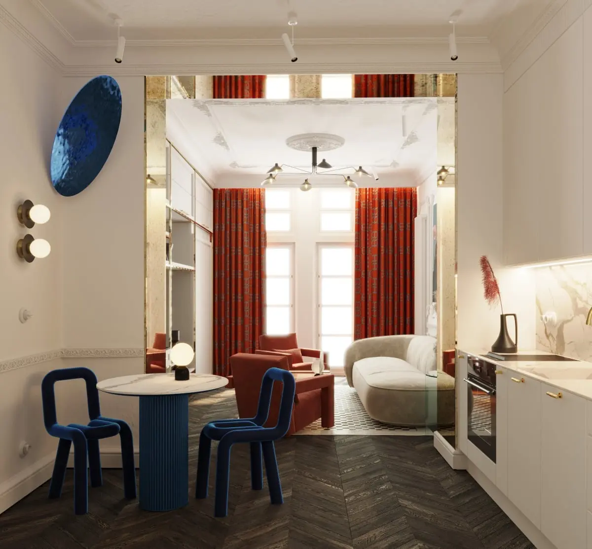 Kristina Busko, której został powierzony projekt mikroapartamentu, zaproponowała Inwestorom zestawienie stylu klasycznego z odważnymi kolorami i oryginalnymi elementami wyposażenia. Pasja architektki do abstrakcyjnego malarstwa oraz filmów Almodovara, została przemycona do wnętrza za pomocą energetycznego odcienia czerwonej pomarańczy oraz szlachetnego kobaltu. Natomiast w centralnej części salonu pojawił się obraz współczesny wrocławskiej malarki KRY_, który przełamuje klasyczność i nadaje aranżacji nonszalancji.
