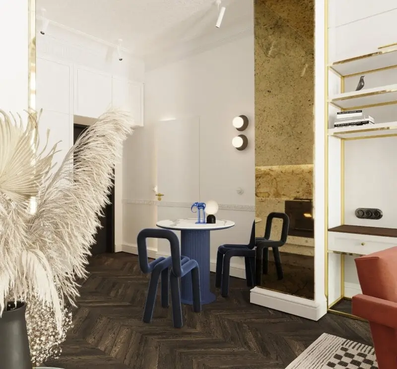 Ograniczona powierzchnia lokalu nie przeszkodziła w urządzeniu nie tylko pięknego, ale i funkcjonalnego wnętrza. Przestrzeń została podzielona na dwie części za sprawą pilastrów, dodatkowo zaakcentowanych złotą bordiurą, wykonaną z antycznego lustra. Pierwsza strefa składa się z aneksu kuchennego ze stołem jadalnianym uzupełnionym o oryginalne krzesła. Dalej przechodzi się do części wypoczynkowej, w której króluje sztukateria, przywodząca na myśl paryskie kamienice. Minimalistyczna meblościanka ze złotym stelażem, skrywa łóżko. Zabieg ten pozwala na szybką zmianę wyrafinowanego salonu w wygodną sypialnię.