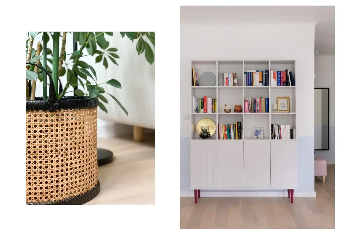 W części salonu został zorganizowany przytulny kącik wypoczynkowy. Wyposażony jest w sofkę na drewnianych nóżkach, fotel typu uszak w pudrowym różu i niski stolik kawowy. Na bocznej ścianie stanął regał, którego kontrastowe nóżki, nawiązują do koloru oprawy nad stołem. Całość została uzupełniona zielonymi roślinami w ozdobnych osłonkach.