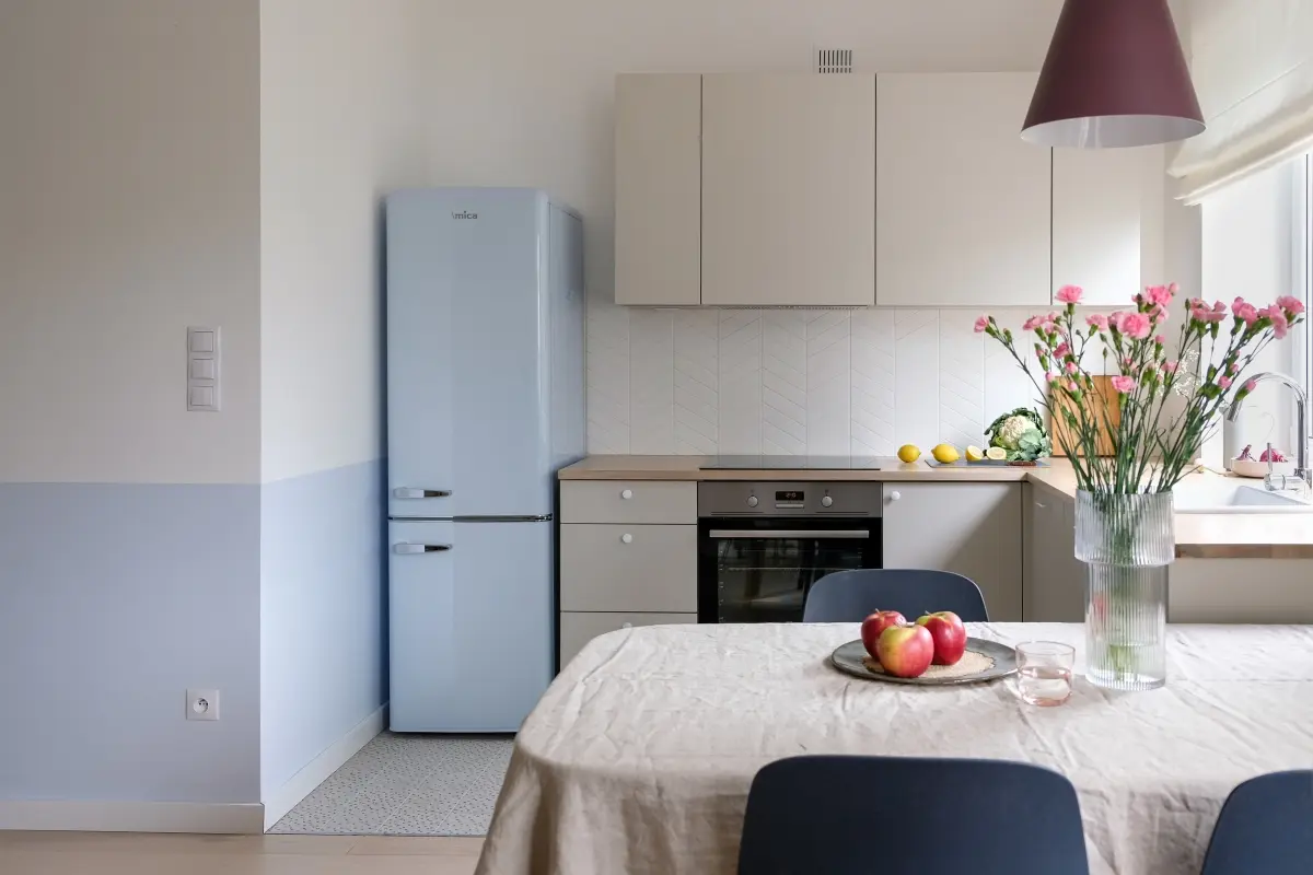 Patrząc na zdjęcia mieszkania bardzo łatwo odgadnąć, kto jest jego właścicielem: młoda, kobieta ceniąca funkcjonalne rozwiązania, ale nie pozbawione faktora przytulności. Na małym metrażu udało się zorganizować bardzo przestronne i jasne wnętrze z kilkoma strefami funkcjonalnymi. Niewielki przedpokój prowadzi do części dziennej. Jest ona otwarta, a dzięki oknom na całej długości ściany, wpada tu mnóstwo naturalnego światła. Po obrysie pomieszczenia biegnie lamperia w odcieniu baby blue. Wnękę wykorzystano na zorganizowanie aneksu kuchennego, którego punktem centralnym jest lodówka w stylu retro o pięknym błękitnym kolorze. Fronty szafek w rozbielonym, pistacjowym odcieniu, harmonijnie współgrają z pastelową paletą wnętrza. Strefę kuchni od salonu „oddziela” stół jadalniany, nad którym zawisła lampa w śliwkowym kolorze, stanowiąca mocny akcent na jasnym tle.