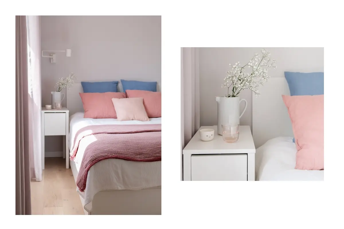Sypialnia stanowi prawdziwą oazę. Okna sprawiają, że jest tu dużo światła, jednak w razie potrzeby można zasłonić je delikatną zasłoną w odcieniu pudrowego różu. Białe meble stapiają się ze ścianami, powiększając optycznie wnętrze i potęgując efekt rozświetlenia. Dodatkowo budują typowy dla stylu skandynawskiego klimat. Na tym tle wyjątkowo dobrze prezentują się tekstylia: poduchy oraz narzuta w pastelowych kolorach.