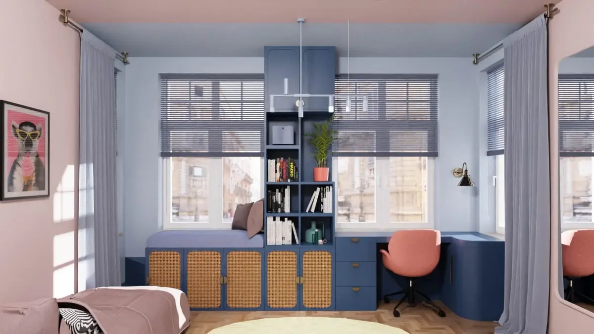 Pokój dla nastoletniej córki Inwestorów jest tak samo wyjątkowy jak reszta mieszkania. Tutaj również da się wyczuć inspiracje paryskim stylem kamienicznym. Błękit i róż stanowią kolory przewodnie wnętrza. Bardzo ciekawym rozwiązaniem jest zabudowa meblowa przy oknie, która z jednej strony jest biurkiem, a z drugiej wygodnym siedziskiem.