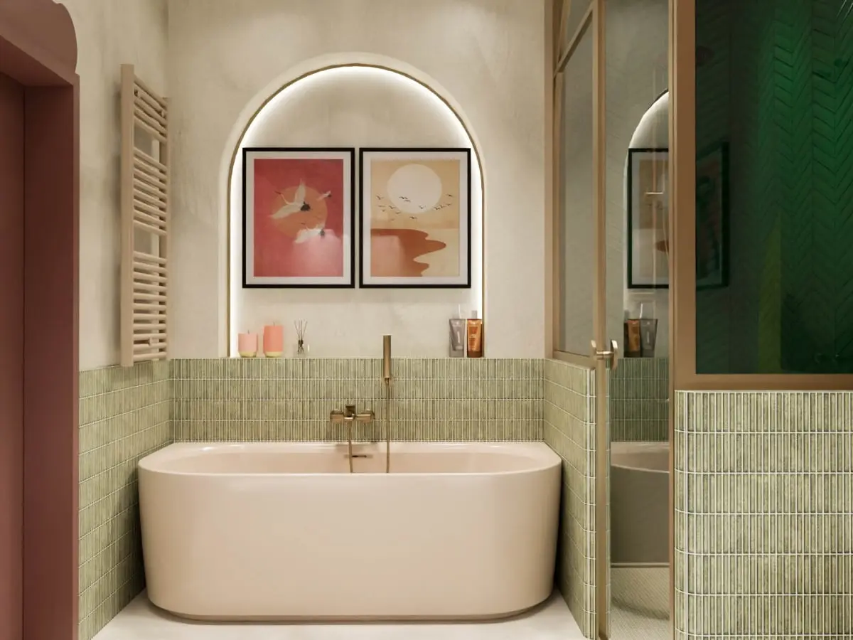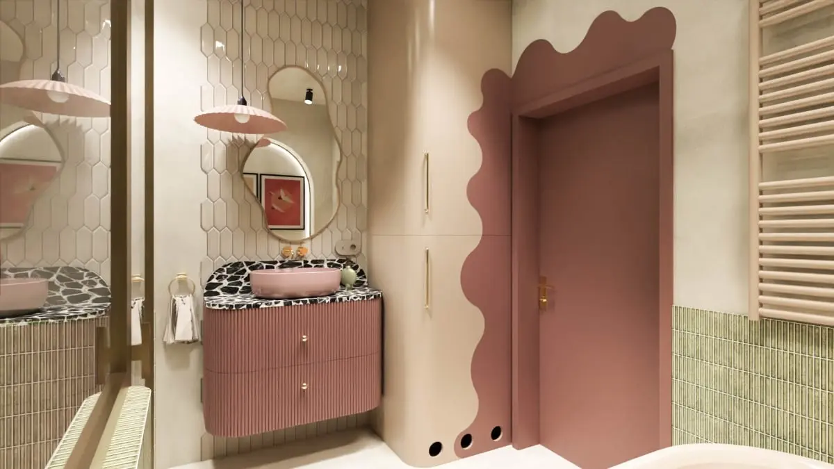 Prawdziwą niespodzianką tego projektu jest salon kąpielowy, gdzie spotykają się róż i szmaragdowa zieleń. Użyto tutaj różnych rodzajów płytek, w tym pięknych miętowych mozaik typu kit-kat, tworząc efektowną ferie kolorów i tekstur. Dodatkowo, organiczne formy i złote detale nadają temu pomieszczeniu wyjątkowego uroku.