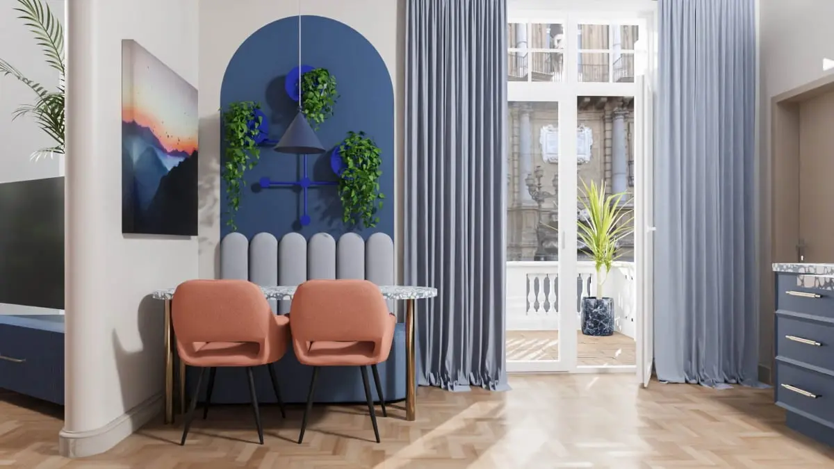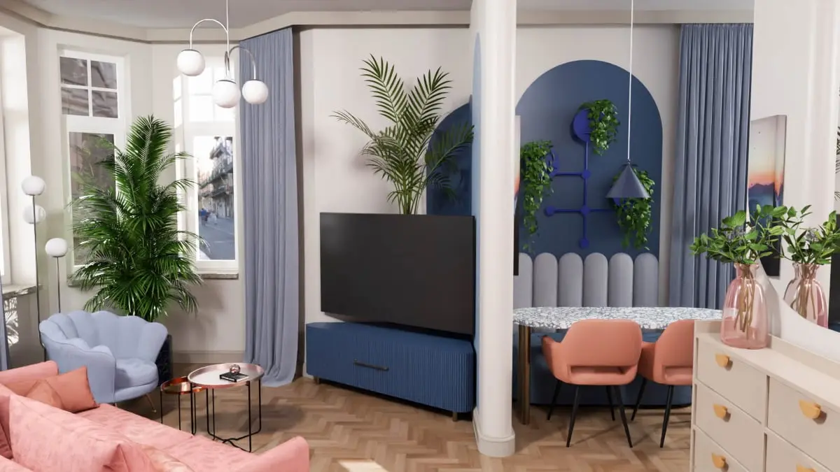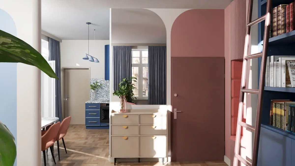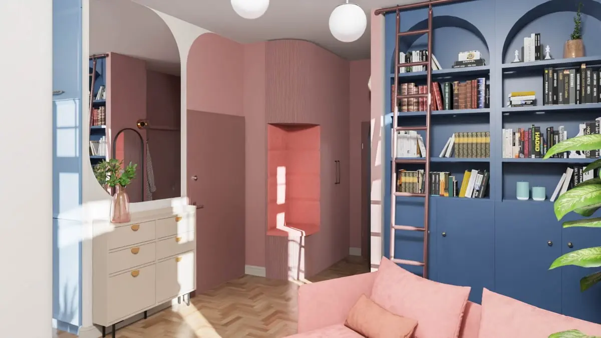 Motywem przewodnim projektu jest królewski błękit, któremu towarzyszy pudrowy róż. Punktem wyjścia dla koncepcji wnętrz był styl paryskich kamienic, jednak wzbogacono go o nieoczywiste motywy, zarówno w kwestii kolorystyki, jak i organicznych form, obłości i łuków. Przekraczając próg tego mieszkania, można poczuć się jak w bajce.