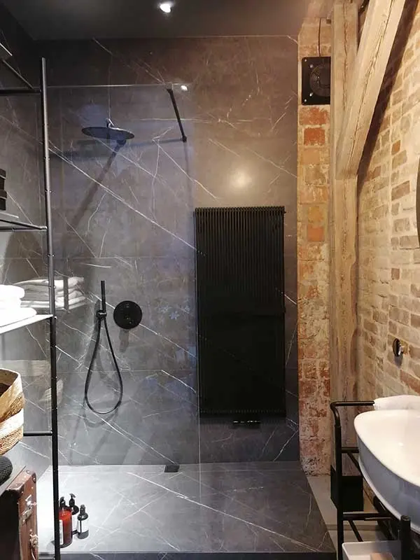 W łazience zainstalowano grzejnik firmy Hushlab, który podkreśla charakter pomieszczenia. Ciekawe połączenie tworzą płytki marmurowe w ciemnej tonacji z naturalną ceglaną ścianą. Nie mogło też zabraknąć czarnej matowej armatury łazienkowej. Aranżacja łazienki jest kontynuacją całego wnętrza, które jest spójne i bardzo ciekawie, funkcjonalnie urządzone.