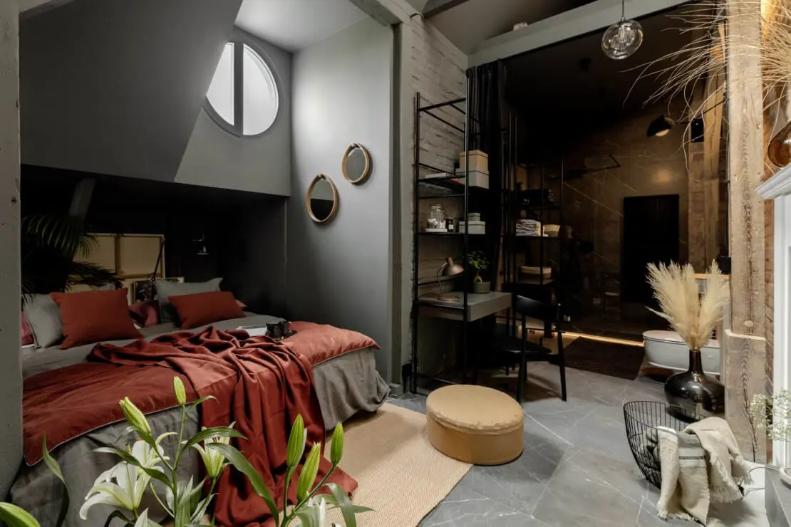 Ciepła wnętrzu dodają naturalne sploty tkanin, kosze z trawy morskiej, brązowe szkło, miękkie tkaniny, suszone trawy w wazonach oraz drewniane belki. Obecność zielonych roślin, naturalne dodatki i ciepłe kolory tworzą przyjazny klimat. Na antresoli udało się wygospodarować również drugą sypialnię – wejdziemy tam po stalowych, kręconych schodach. Przez okna połaciowe roztacza się widok na dachy sąsiednich kamienic oraz PKiN.
