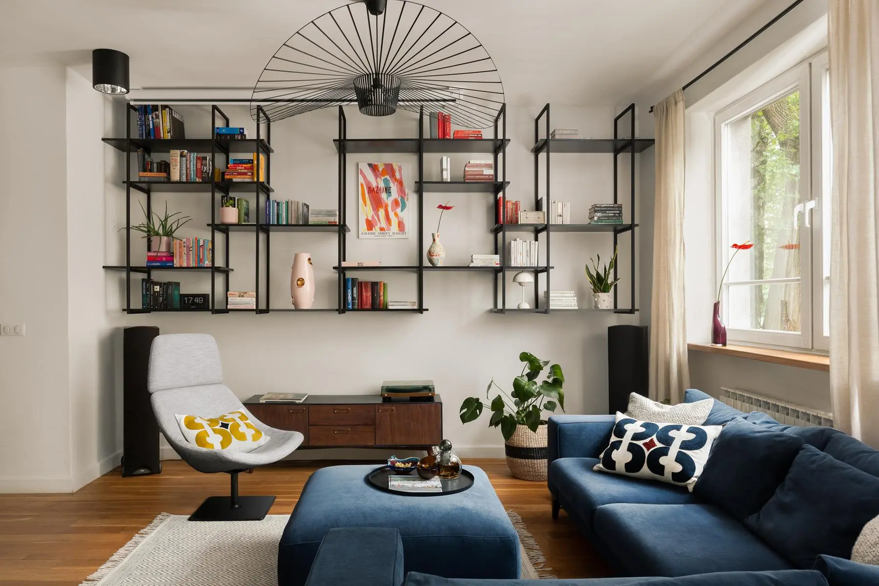 Motywem przewodnim strefy dziennej jest relaks, na co wskazuje między innymi granatowy kompleks wypoczynkowy, a także nowoczesny fotel w uniwersalnym, szarym odcieniu. Elementem wyposażenia salonu, który zdecydowanie przykuwa uwagę, jest regał wykonany na zamówienie. Ciekawa forma i elegancka czerń to odzwierciedlenie loftowego stylu, który doskonale koresponduje z akcentami kolorystycznymi w postaci książek oraz grafik na ścianach.