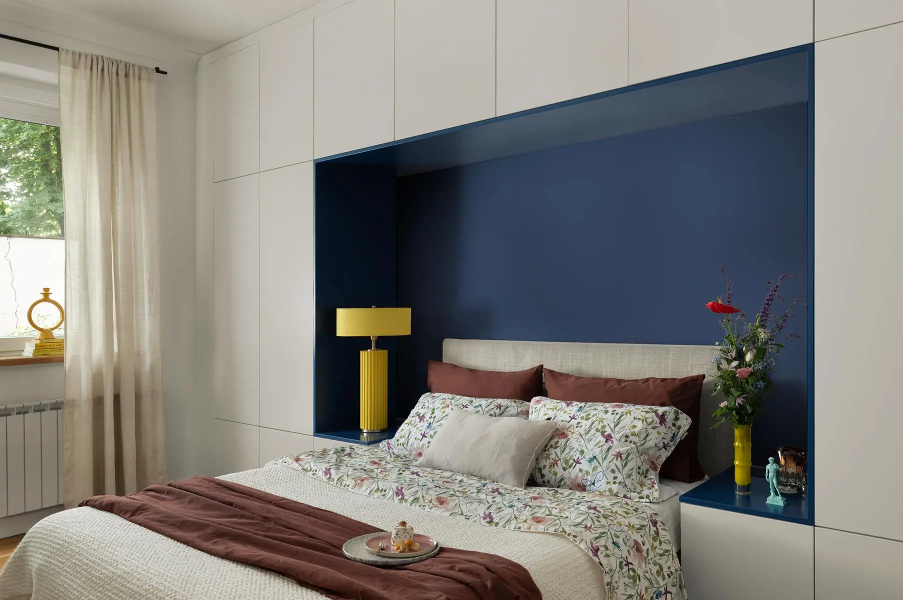 W strefie prywatnej znalazło się miejsce na sypialnię, w której także gości granat. Najciekawszym elementem aranżacji tego pomieszczenia jest jednak wkomponowanie łóżka w zabudowę meblową. To doskonałe rozwiązanie w sytuacji, w której sypialnia jest nie tylko azylem odpoczynku, ale również miejscem do przechowywania. Dzięki temu nie trzeba już próbować wkomponować w aranżację kolejnych mebli wolnostojących, a łóżko zyskuje intymną oprawę.