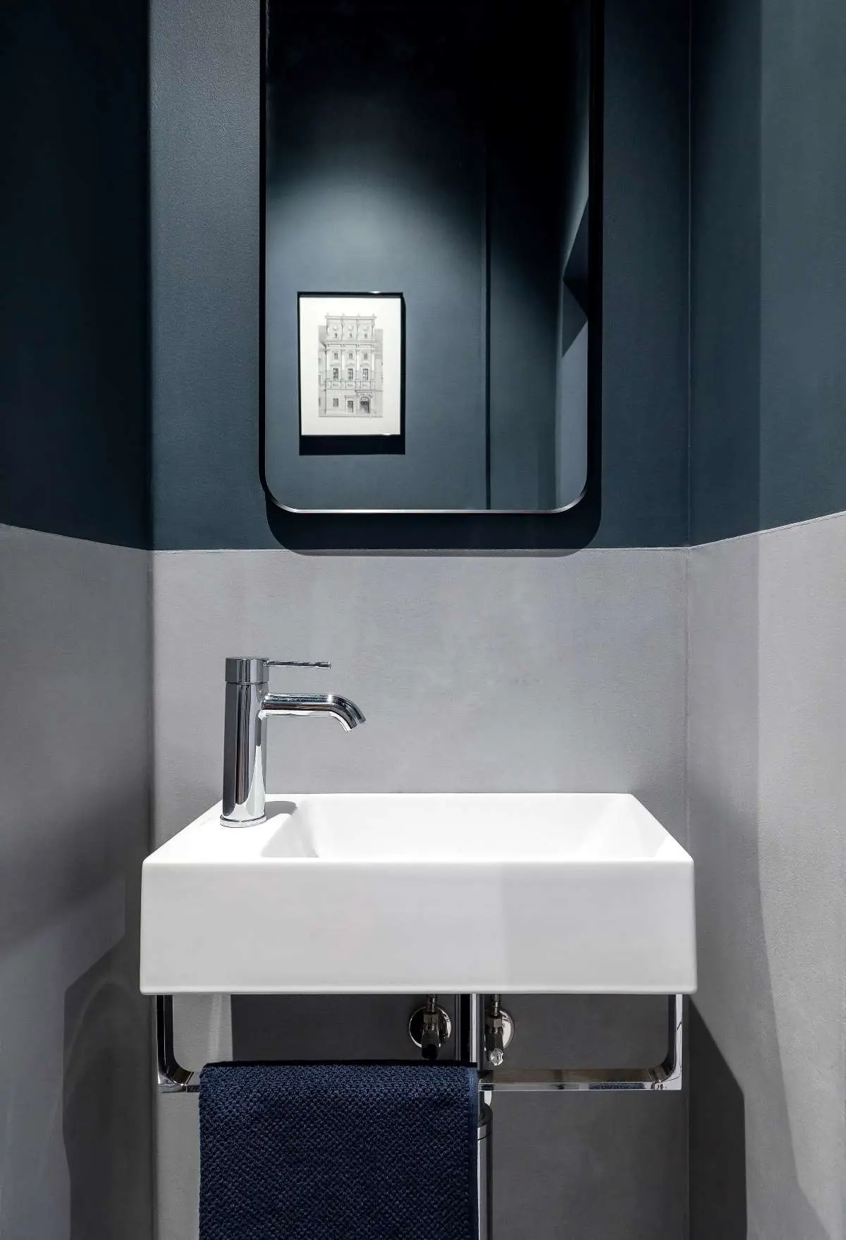 Główna łazienka z prysznicem, z długa szafką pod umywalkową została konsekwentnie utrzymana jest w szarościach i granacie. Granatowe płytki pochodzą z kolekcji Marazzi a białe to Imola. W łazience znajduję się grzejnik Hushlab Fat, umywalka to Duravit Happy. Oświetlenie jakie zostało wybrane do łazienki to tuby od polskiej marki Sternlight o podwyższonej szczelności.