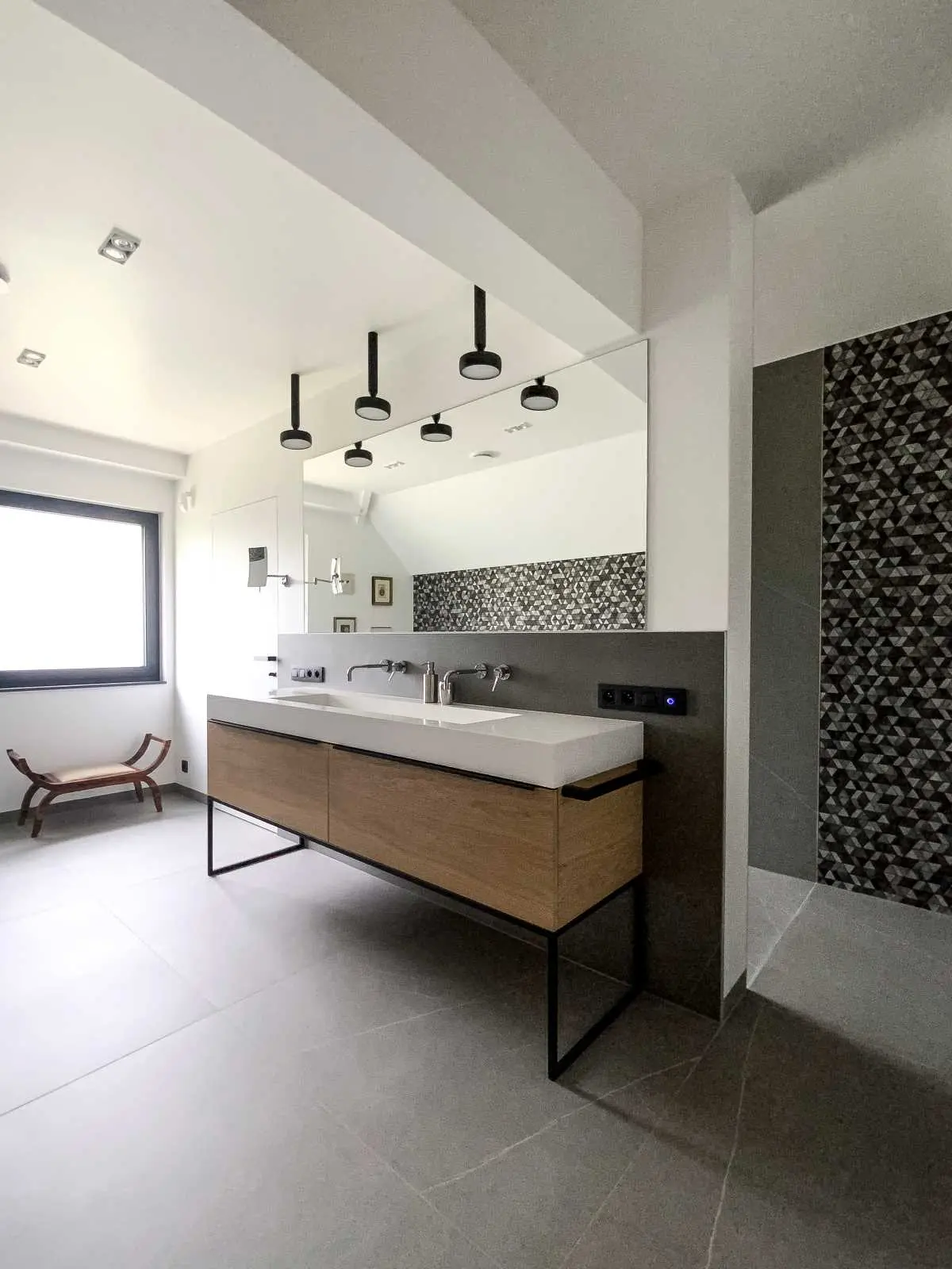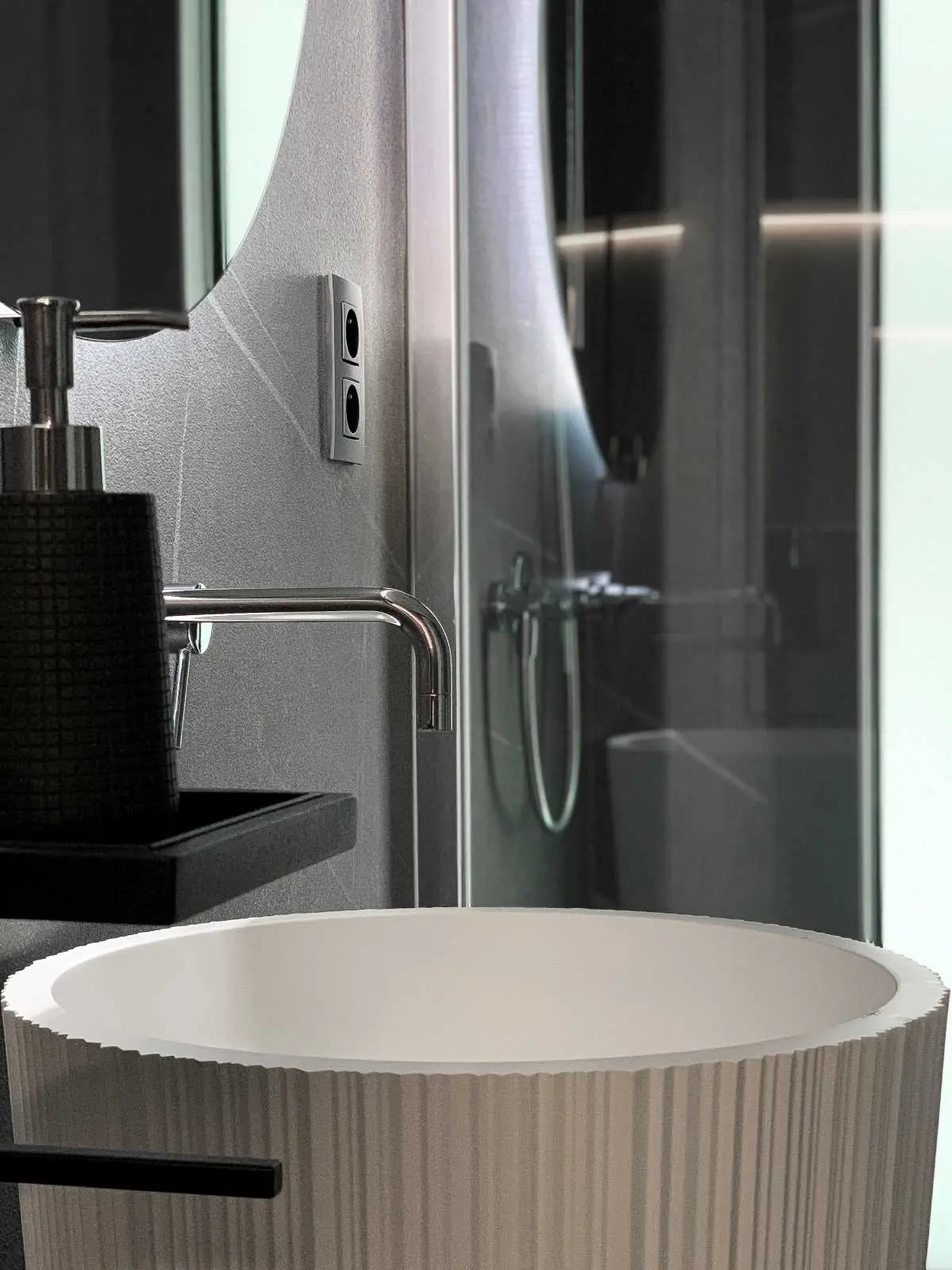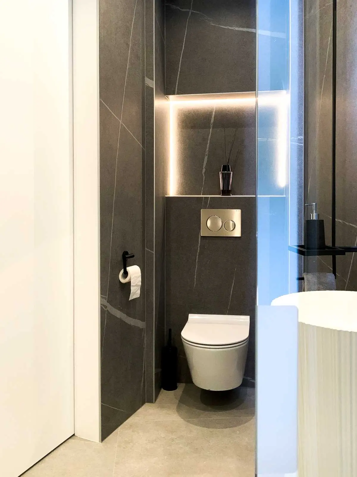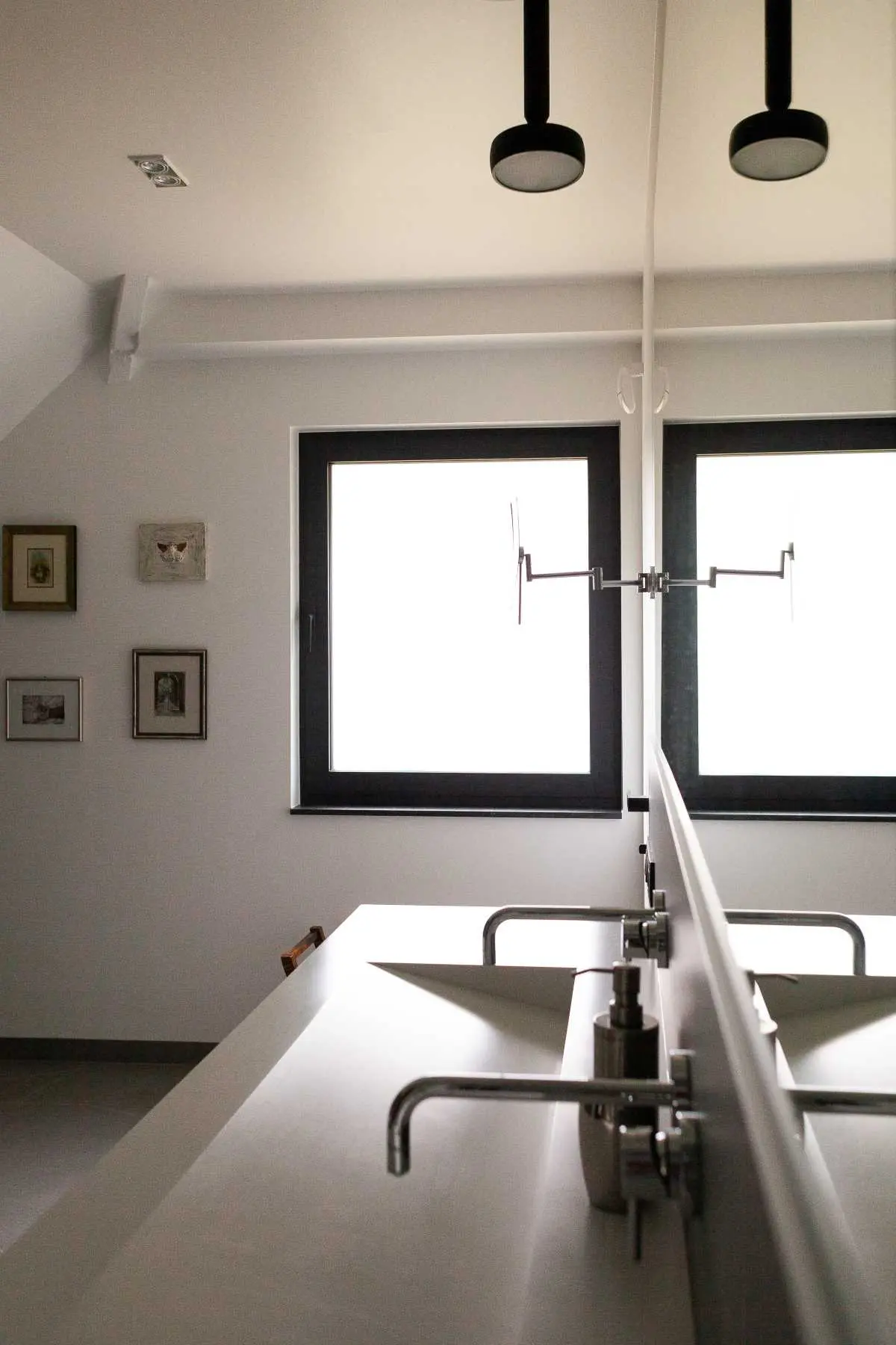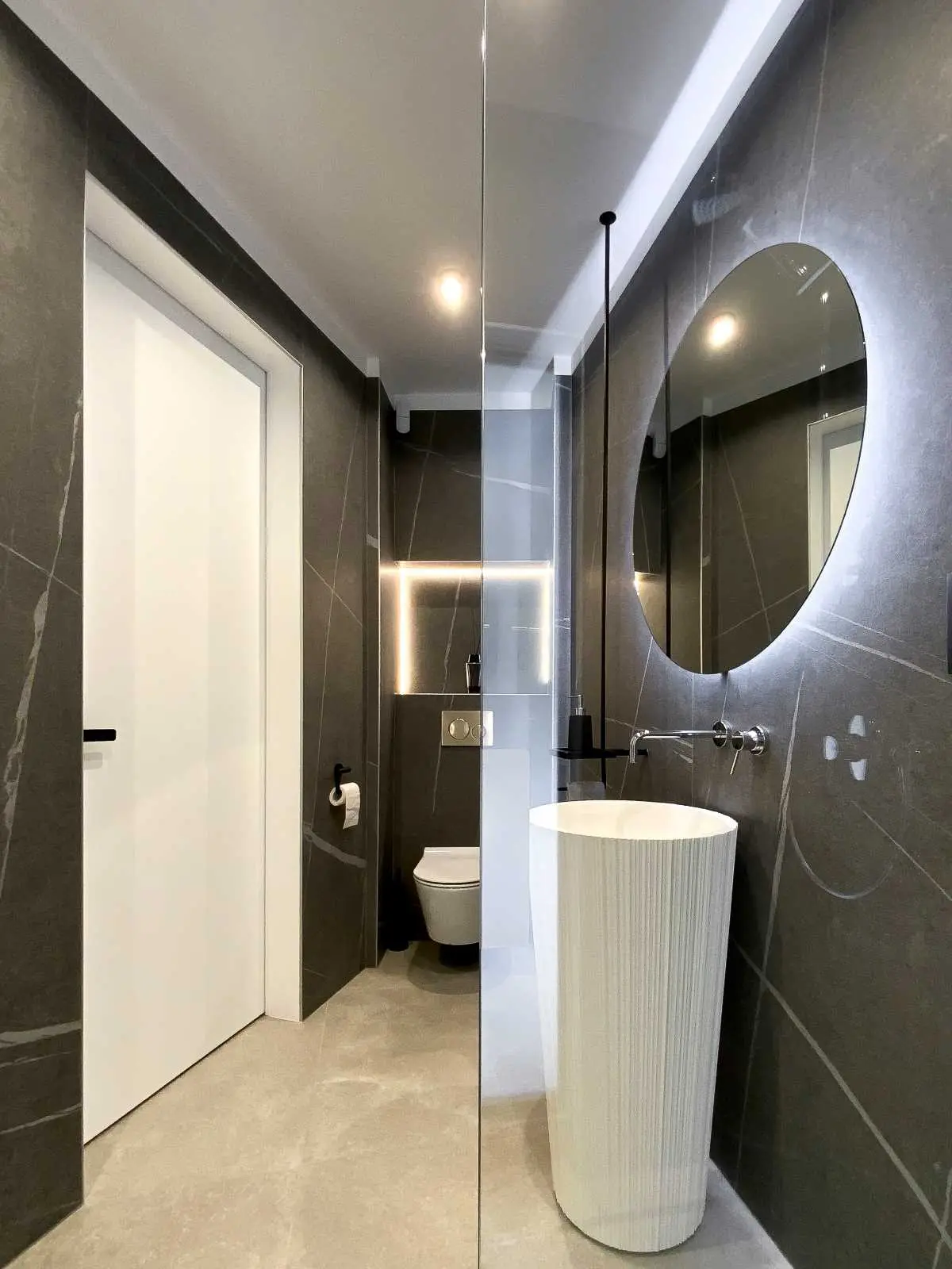 4 łazienki, każda inna lecz przez swój minimalistyczny styl tworzą spójną całość z wnętrzem. Dominują szarości, naturalne kolory, kamień i przede wszystkim najwyższej jakości materiały z górnej półki. Odnajdziemy tu ciekawą ceramikę Antonio Lupi, wyjątkowy design płyt Porcelanosa, L`Antic oraz Wow Design.