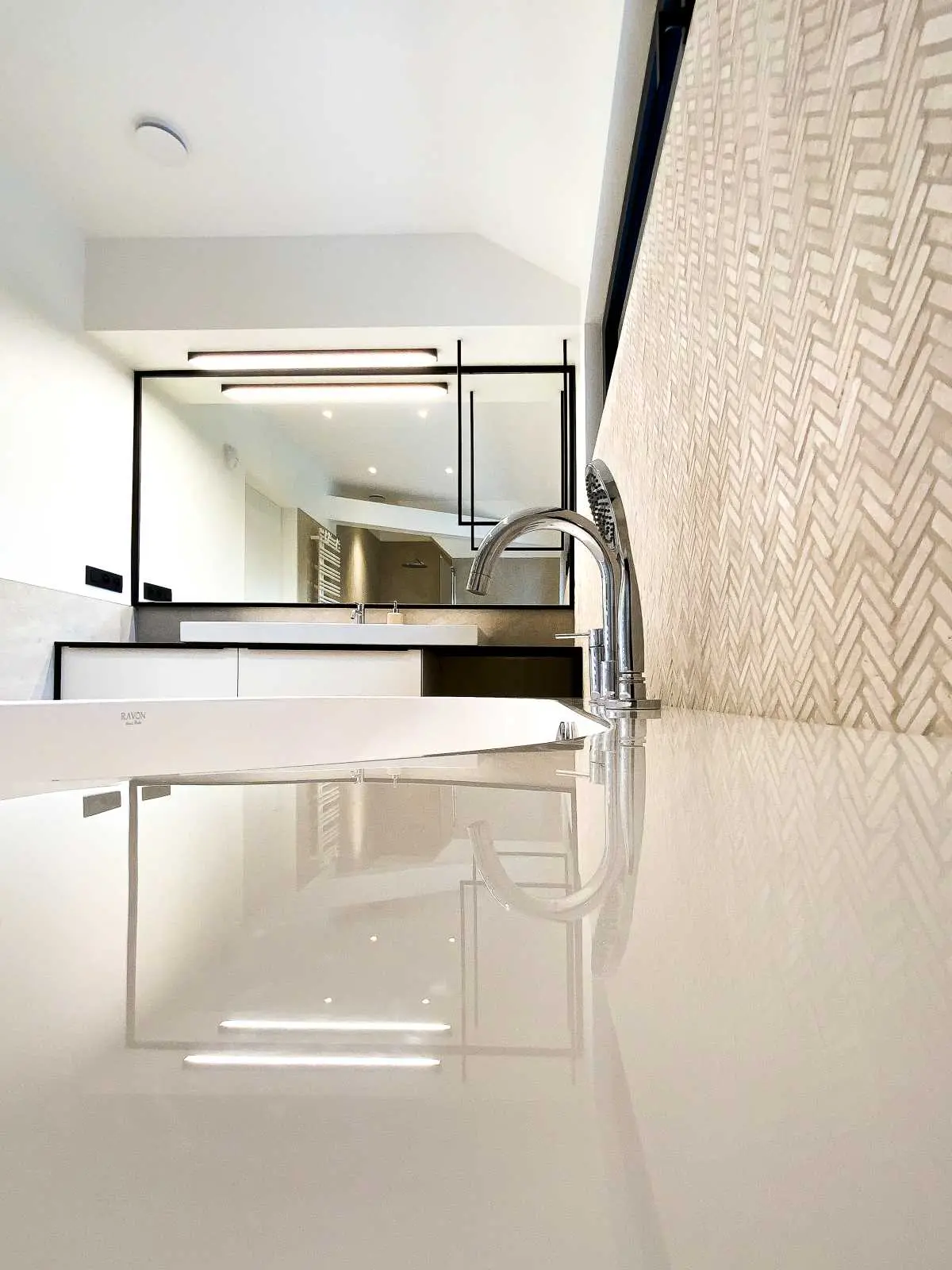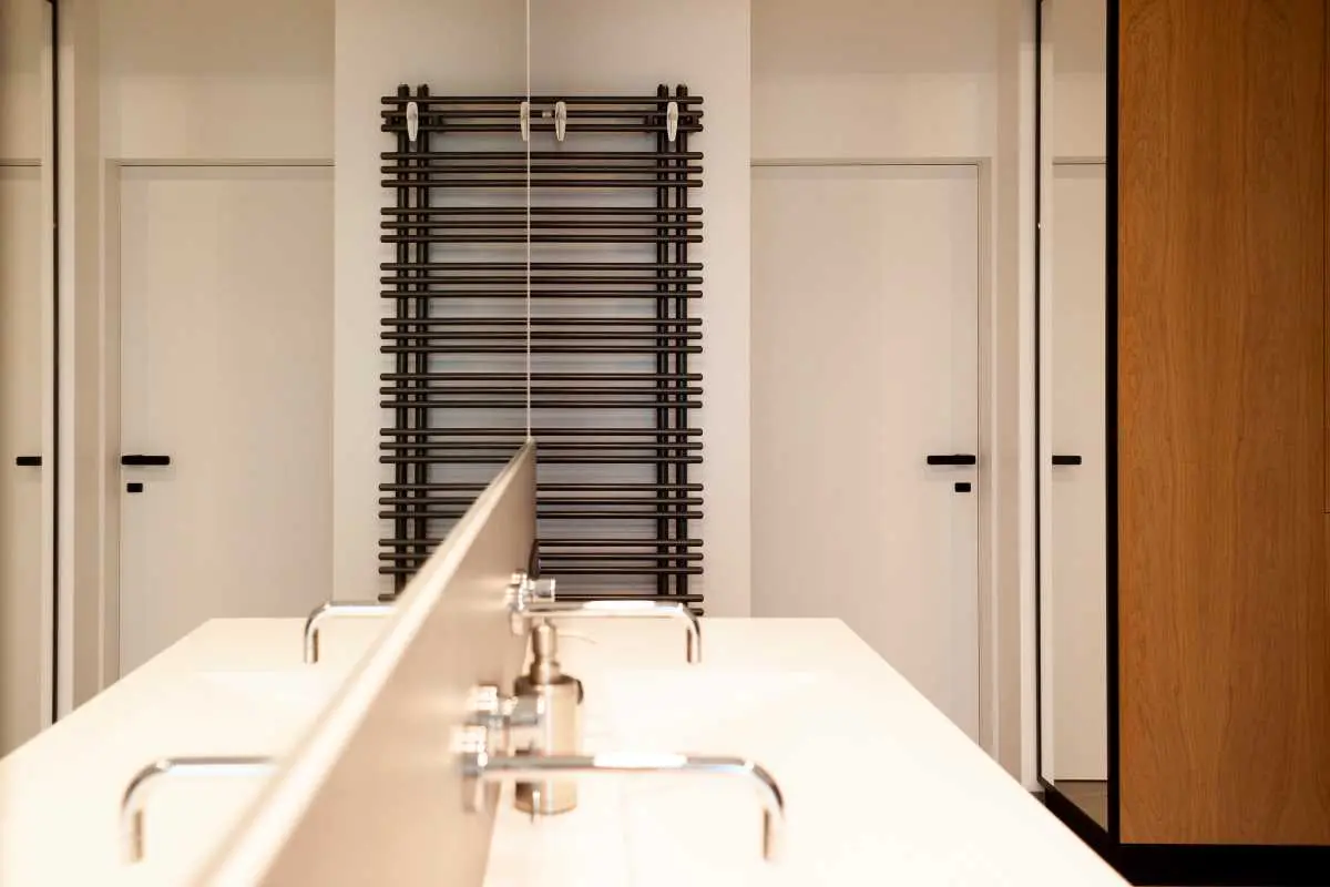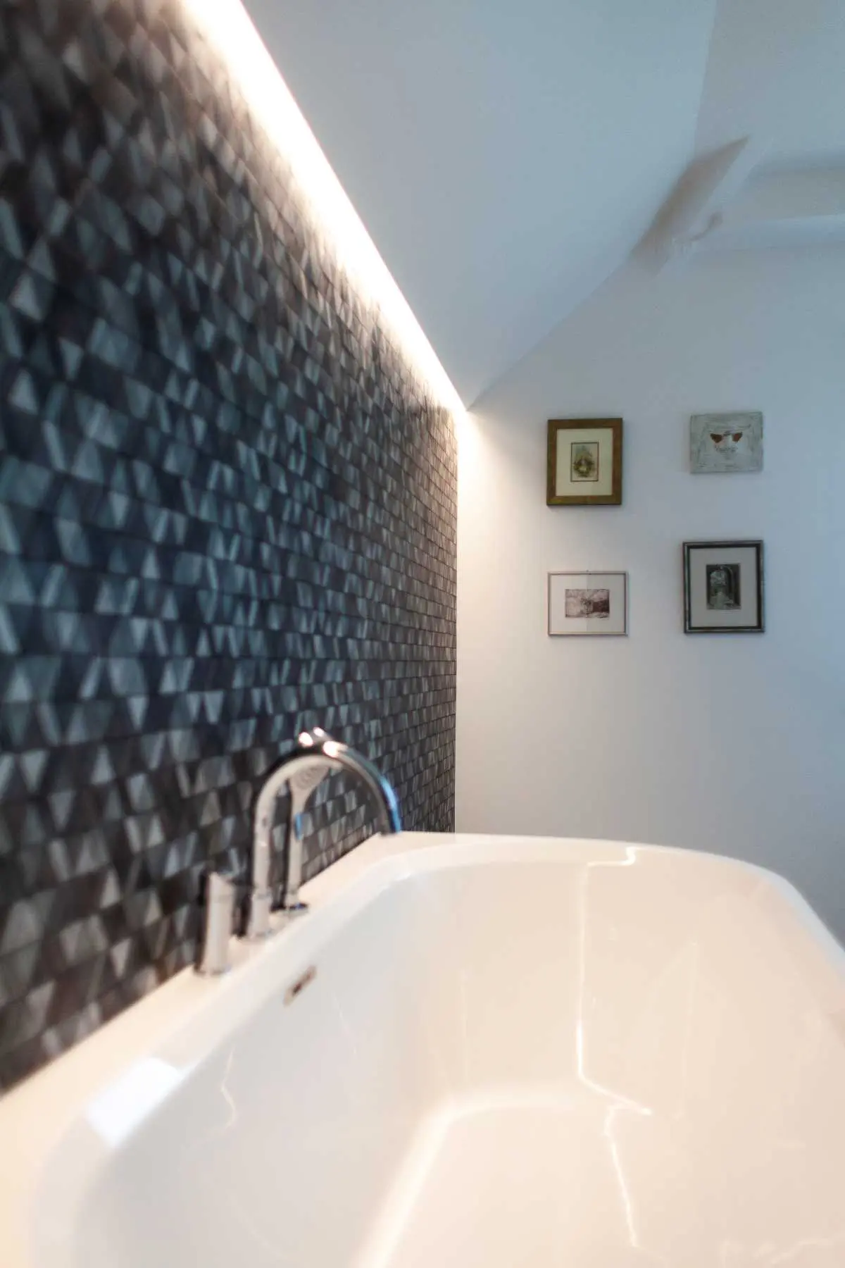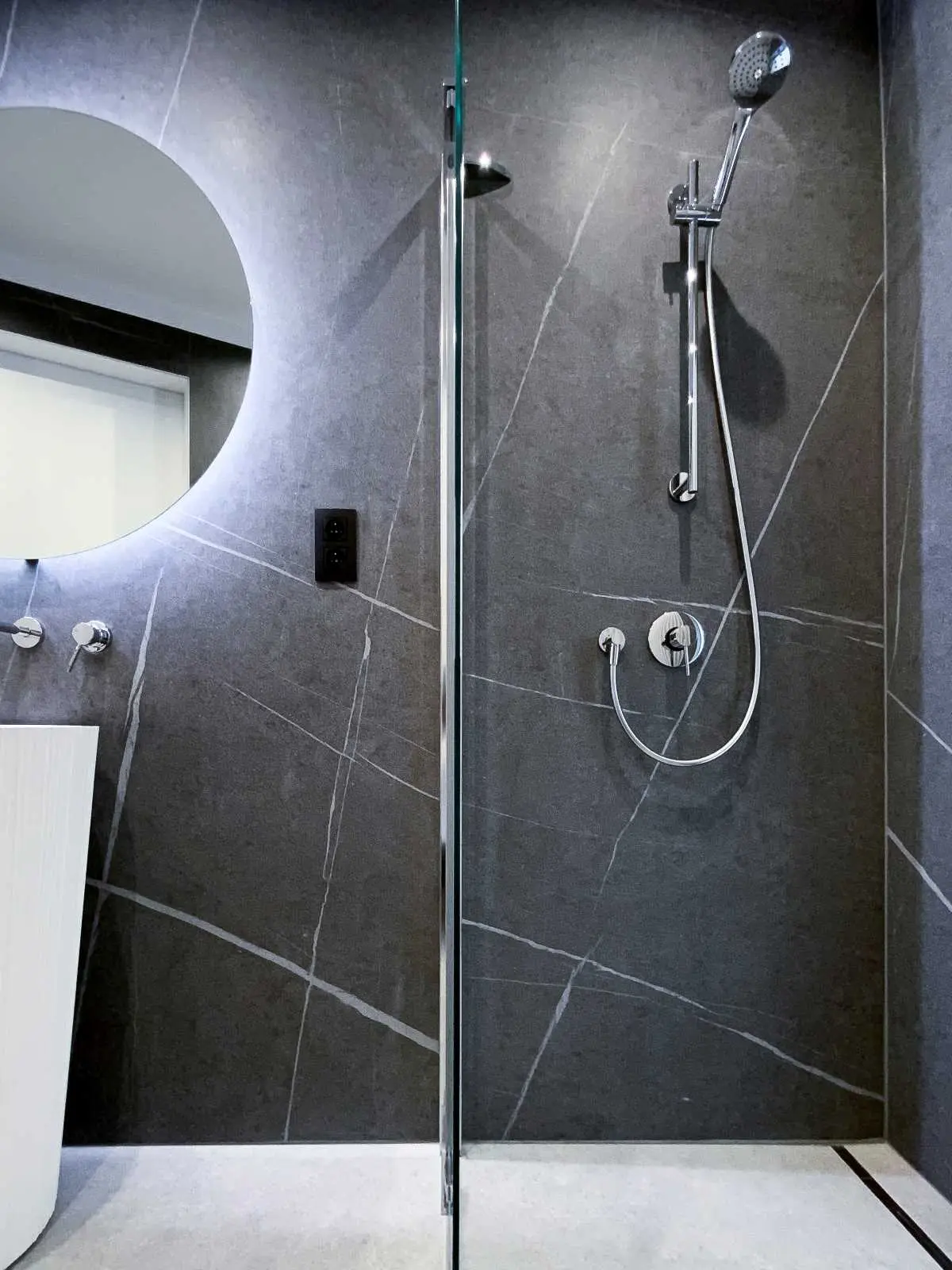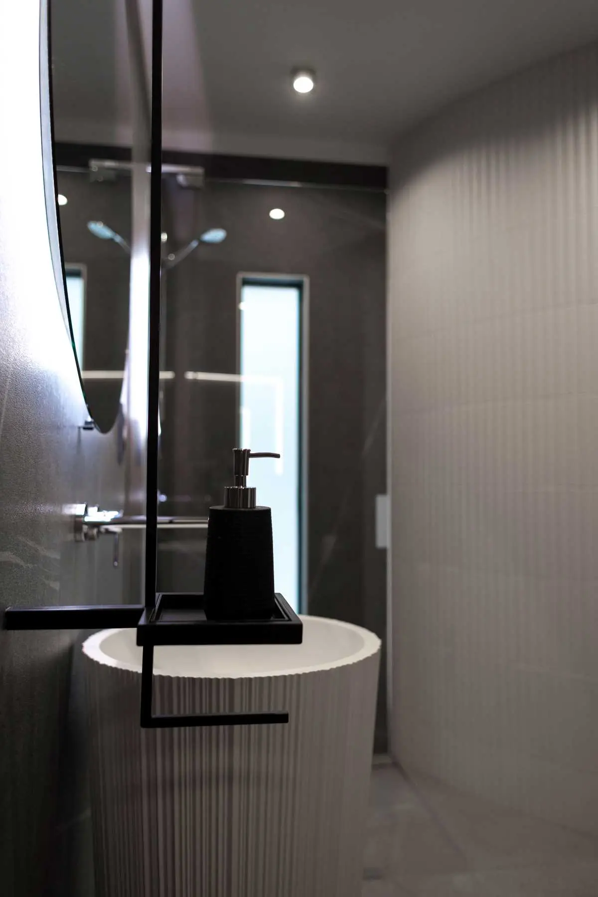 4 łazienki, każda inna lecz przez swój minimalistyczny styl tworzą spójną całość z wnętrzem. Dominują szarości, naturalne kolory, kamień i przede wszystkim najwyższej jakości materiały z górnej półki. Odnajdziemy tu ciekawą ceramikę Antonio Lupi, wyjątkowy design płyt Porcelanosa, L`Antic oraz Wow Design.