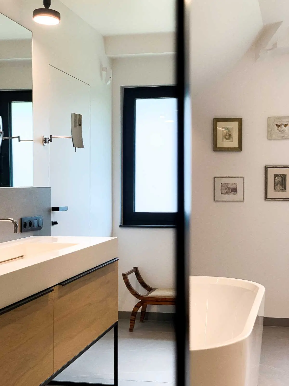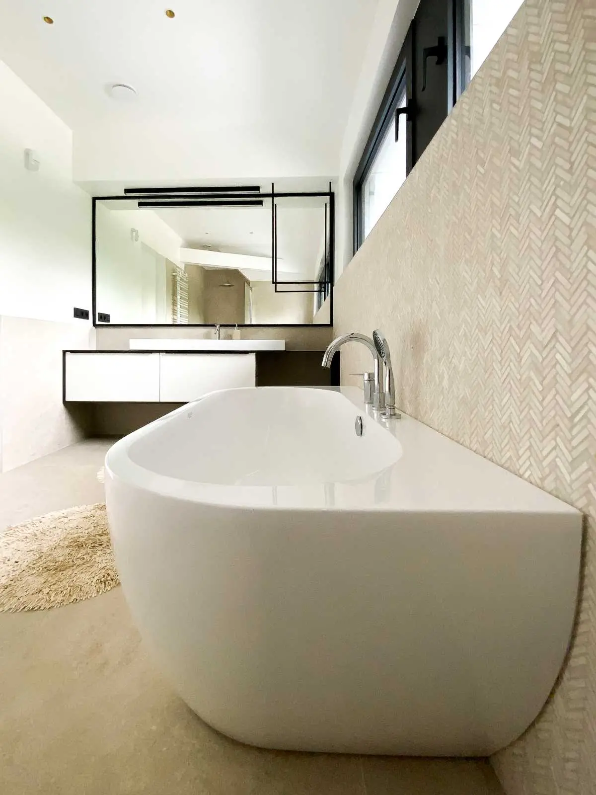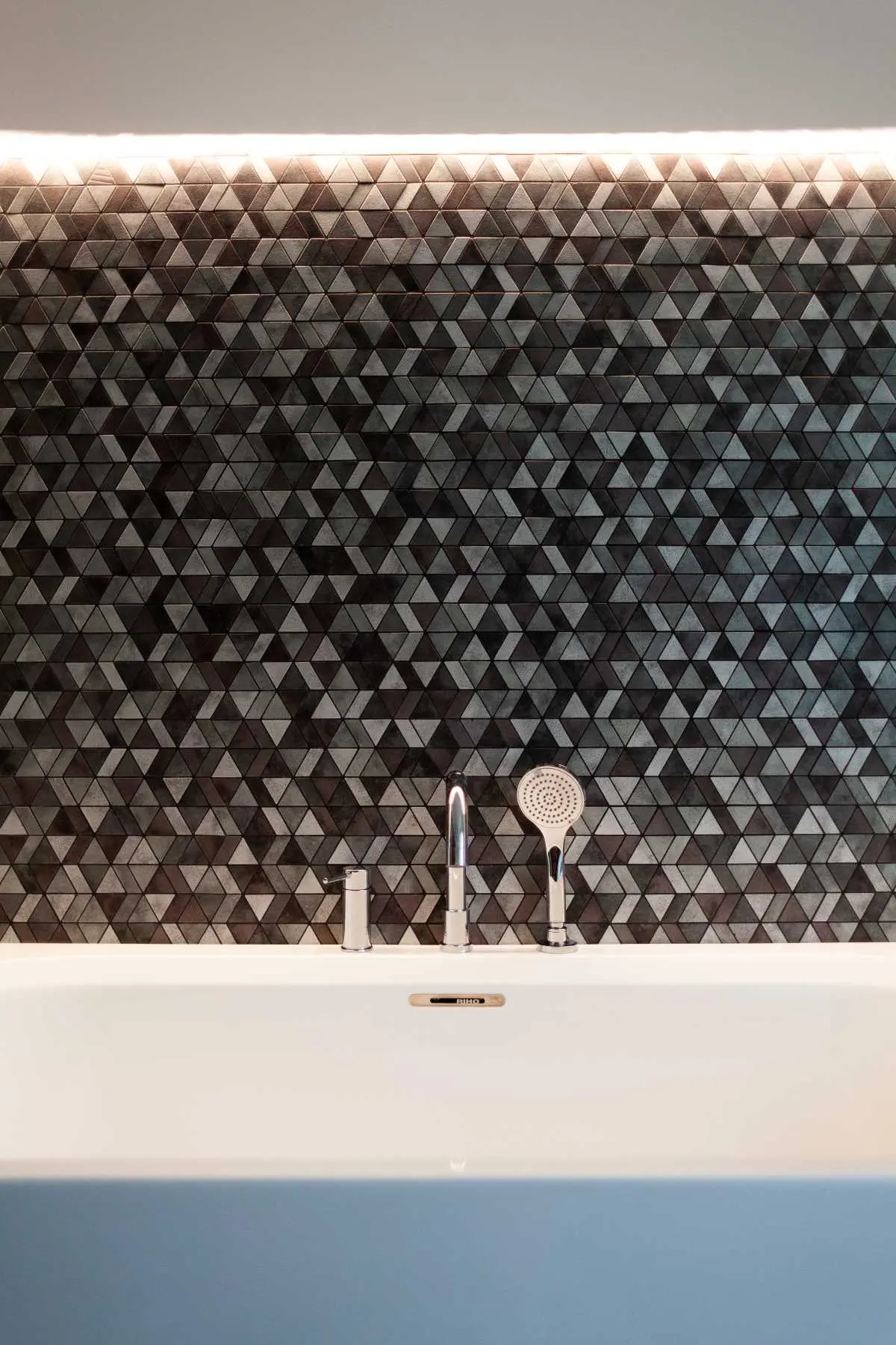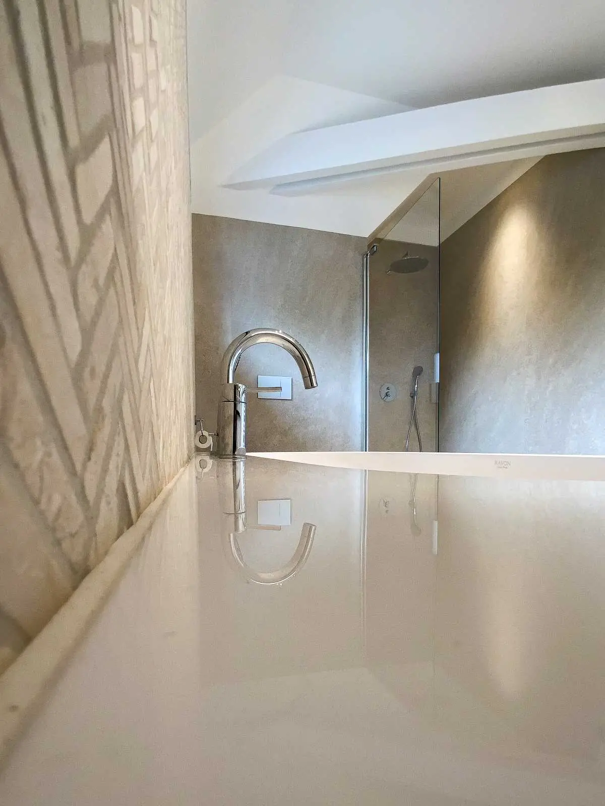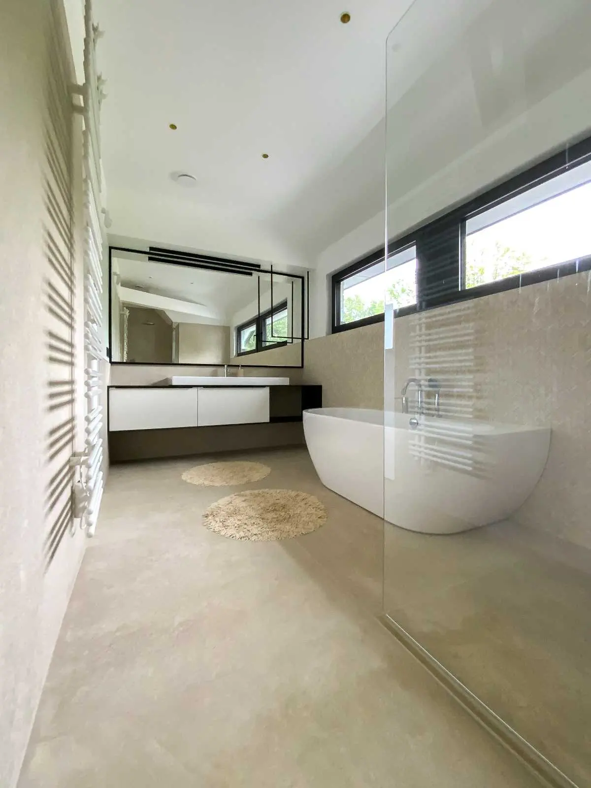 4 łazienki, każda inna lecz przez swój minimalistyczny styl tworzą spójną całość z wnętrzem. Dominują szarości, naturalne kolory, kamień i przede wszystkim najwyższej jakości materiały z górnej półki. Odnajdziemy tu ciekawą ceramikę Antonio Lupi, wyjątkowy design płyt Porcelanosa, L`Antic oraz Wow Design.