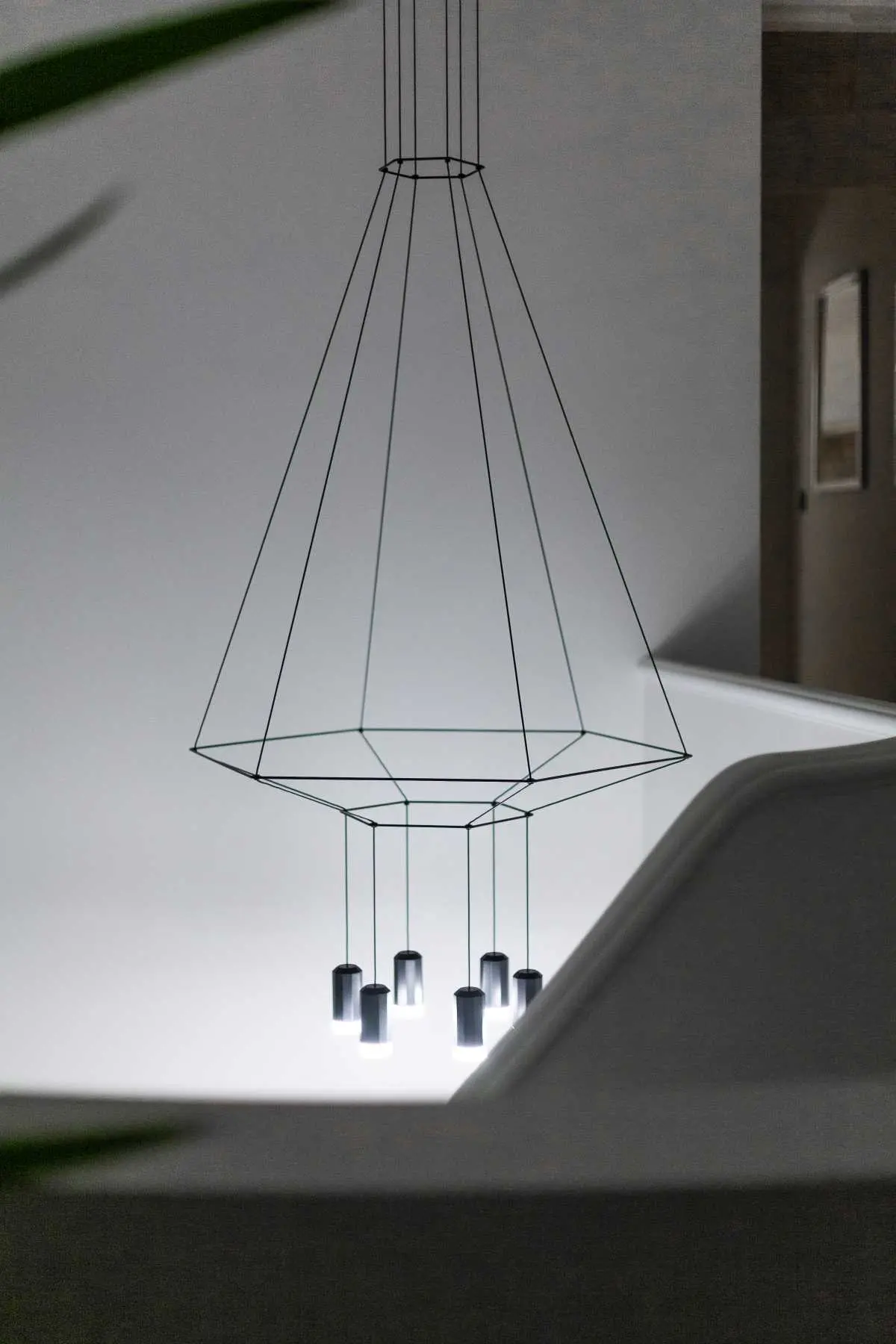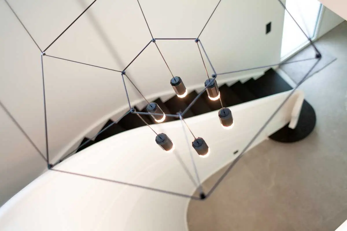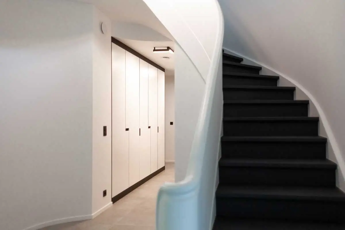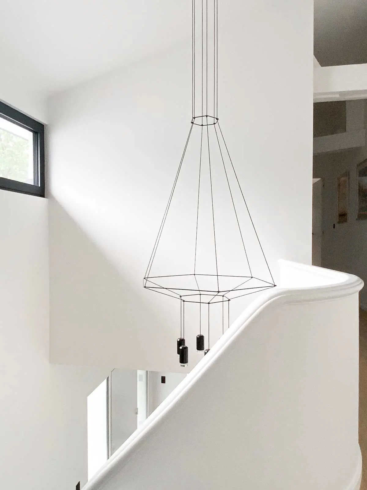 Reprezentacyjna klatka schodowa ze świetnie zachowanymi modernistycznymi schodami wita nas od progu. Wysokie, jasne i funkcjonalne wnętrze otwiera przed nami podróż po znakomitej przestrzeni. Zwieszana minimalistyczna lampa Vibia z kolekcji Wireflow oświetla i ozdabia przestrzeń.