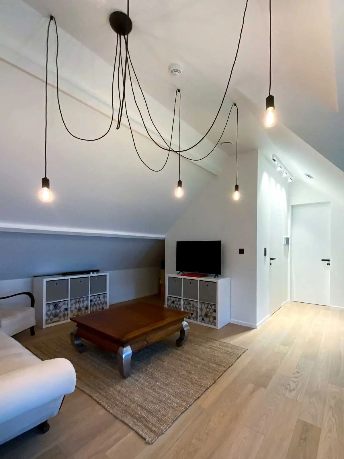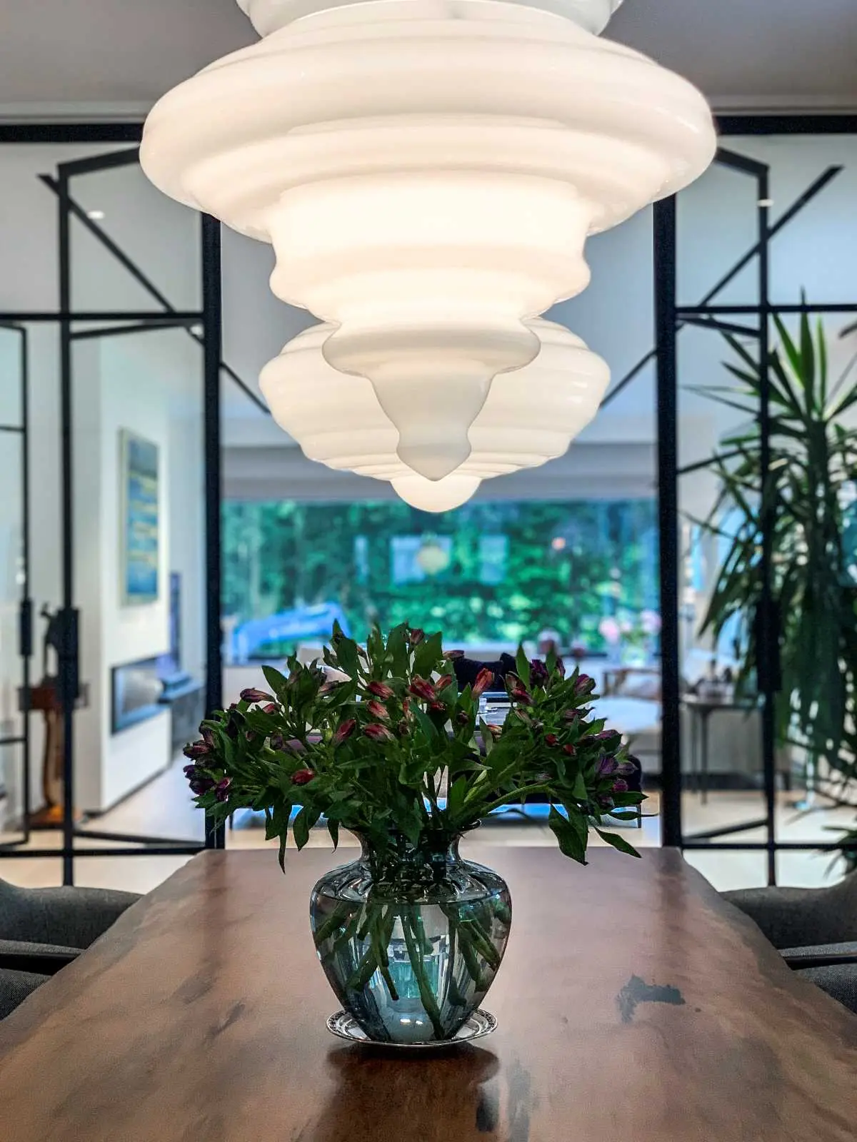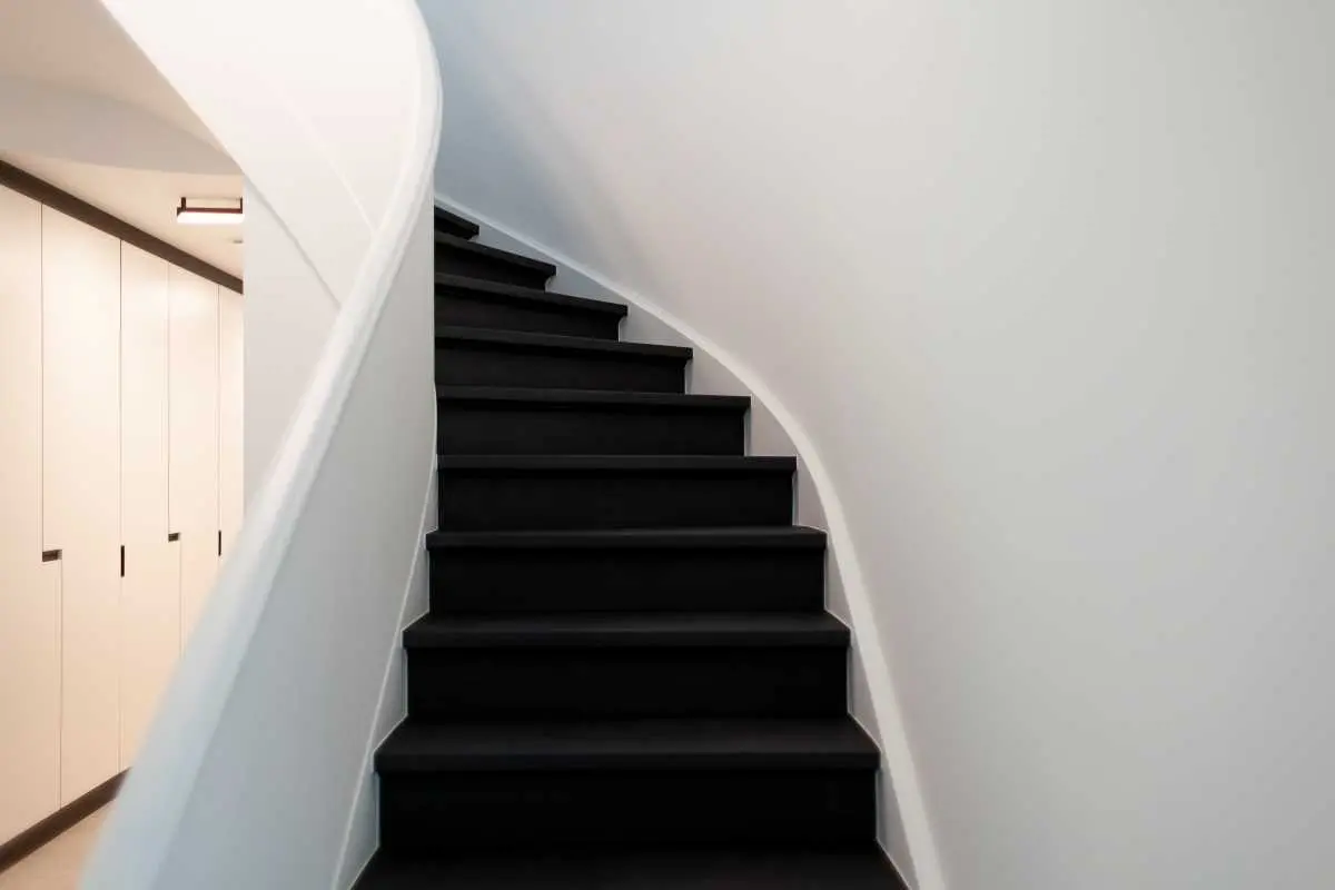 Reprezentacyjna klatka schodowa ze świetnie zachowanymi modernistycznymi schodami wita nas od progu. Wysokie, jasne i funkcjonalne wnętrze otwiera przed nami podróż po znakomitej przestrzeni. Zwieszana minimalistyczna lampa Vibia z kolekcji Wireflow oświetla i ozdabia przestrzeń.