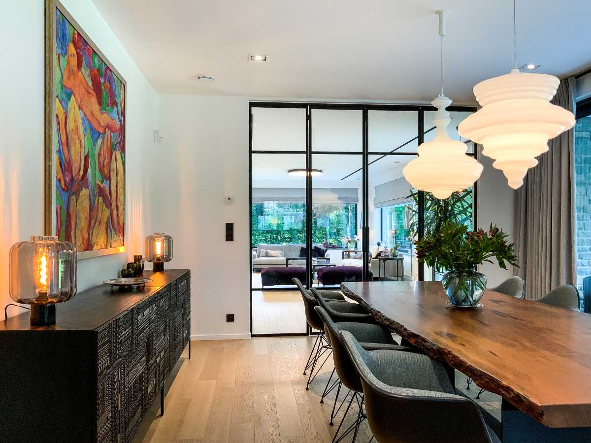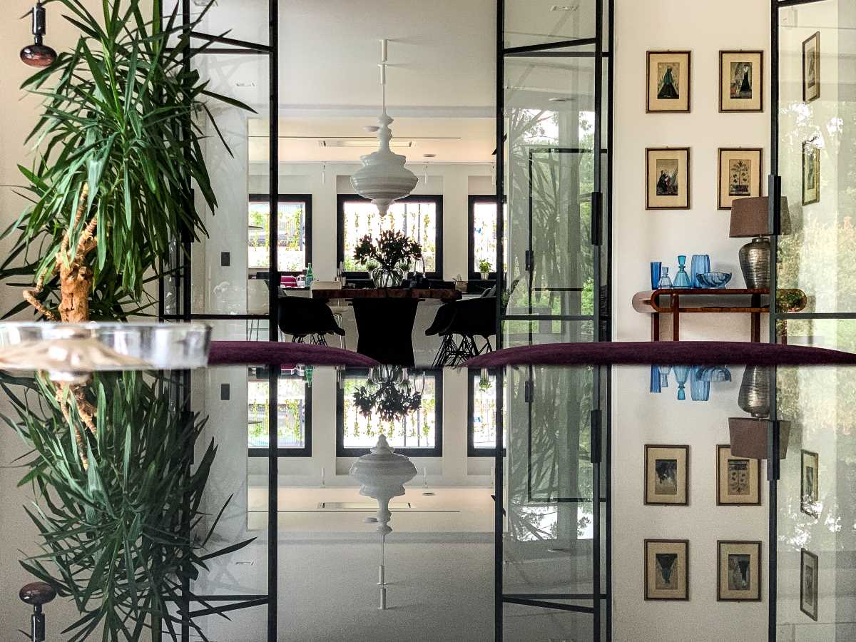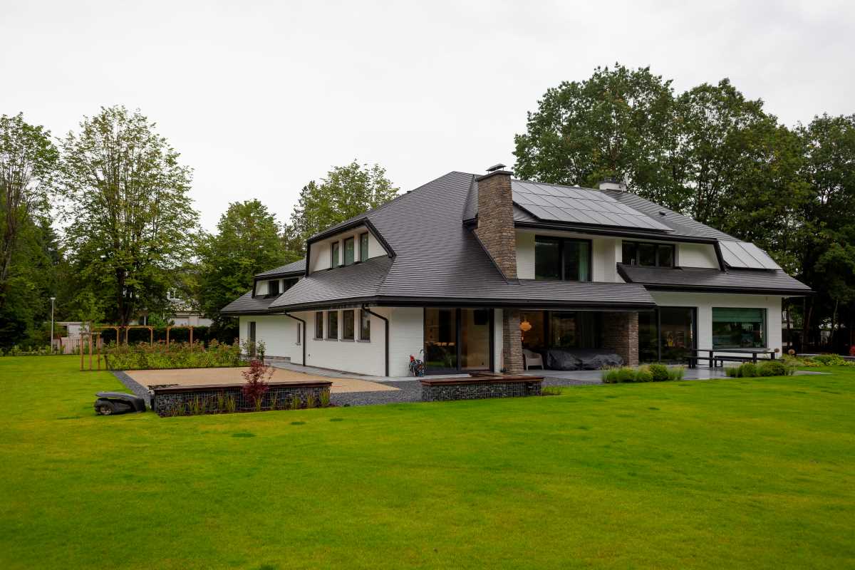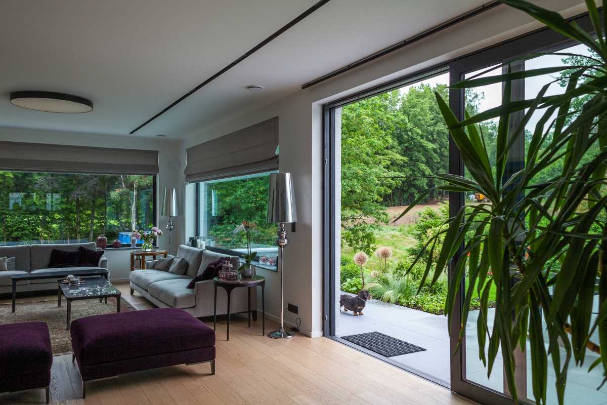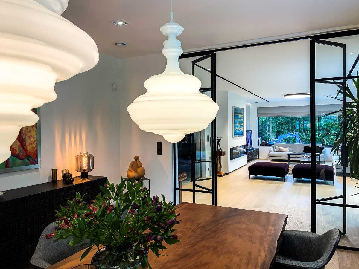 Sercem domu jest salon z dużymi przeszkleniami, przez które natura z zewnątrz została zaproszona do wnętrza. Każdy szczegół aranżacji domu został dokładnie dopracowany a otaczająca cały dom sztuka wprowadza nas w dobry nastrój.