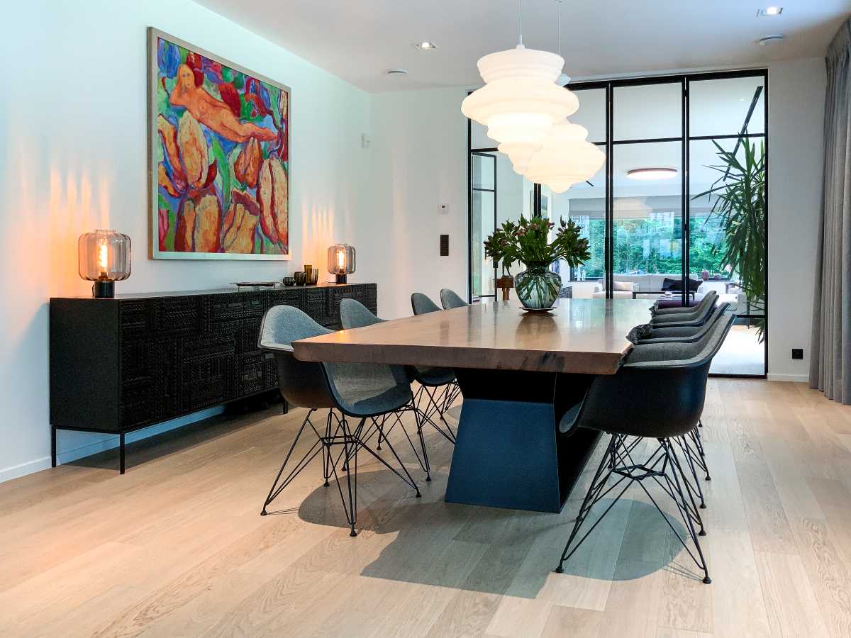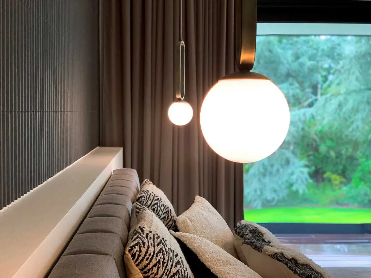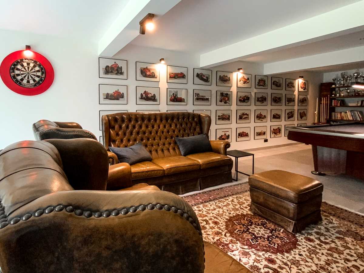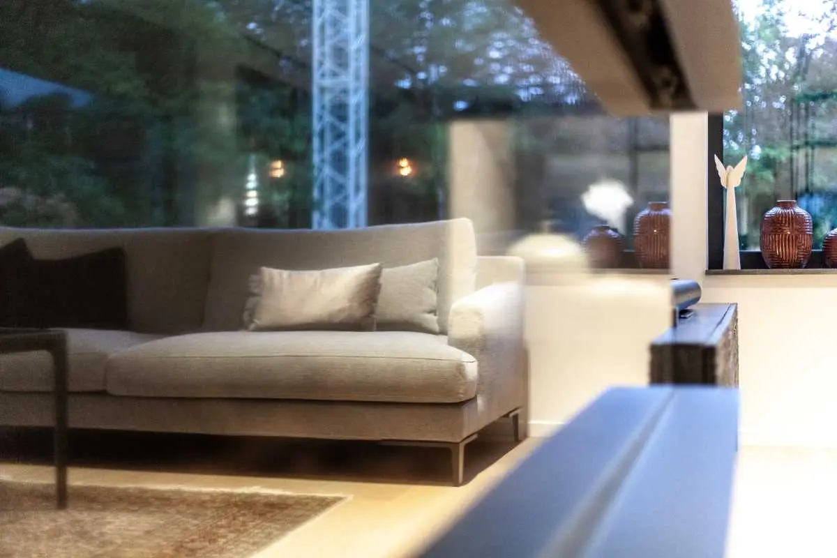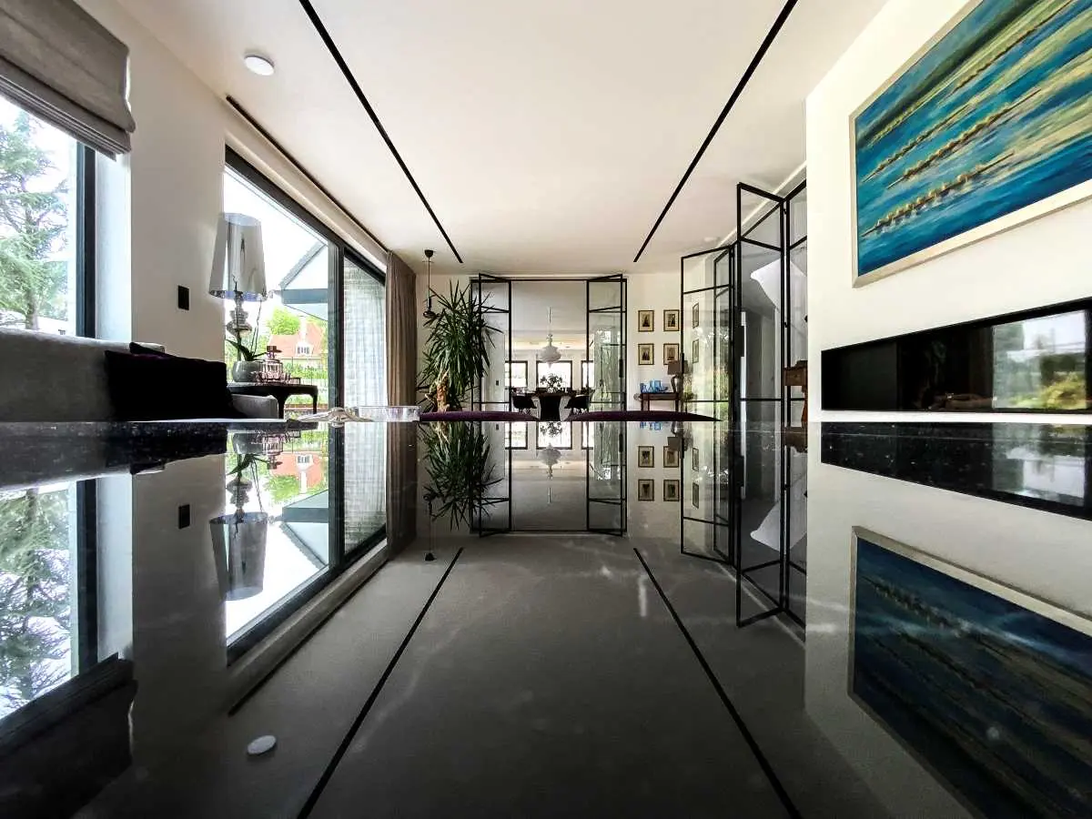 Sercem domu jest salon z dużymi przeszkleniami, przez które natura z zewnątrz została zaproszona do wnętrza. Każdy szczegół aranżacji domu został dokładnie dopracowany a otaczająca cały dom sztuka wprowadza nas w dobry nastrój.