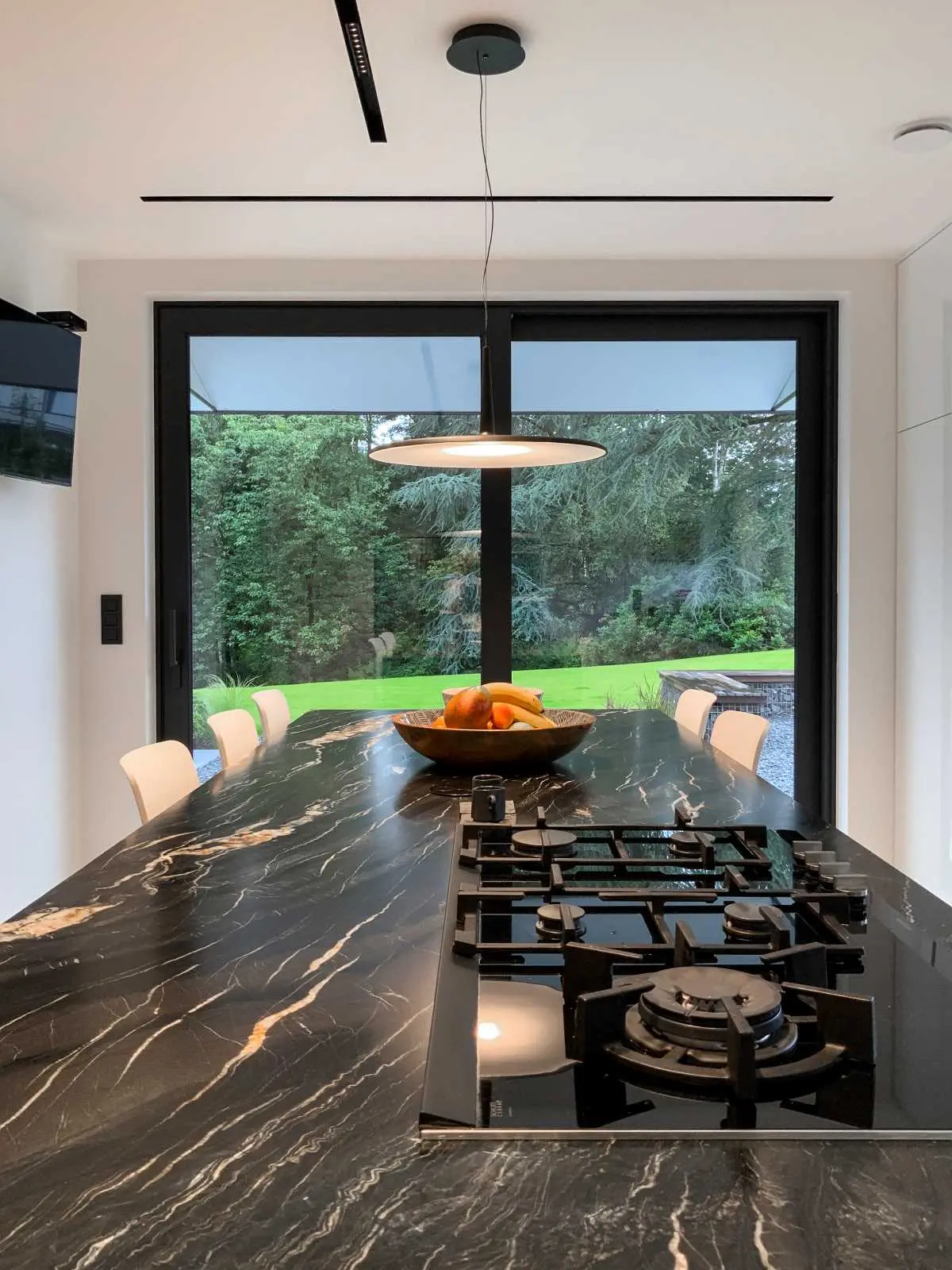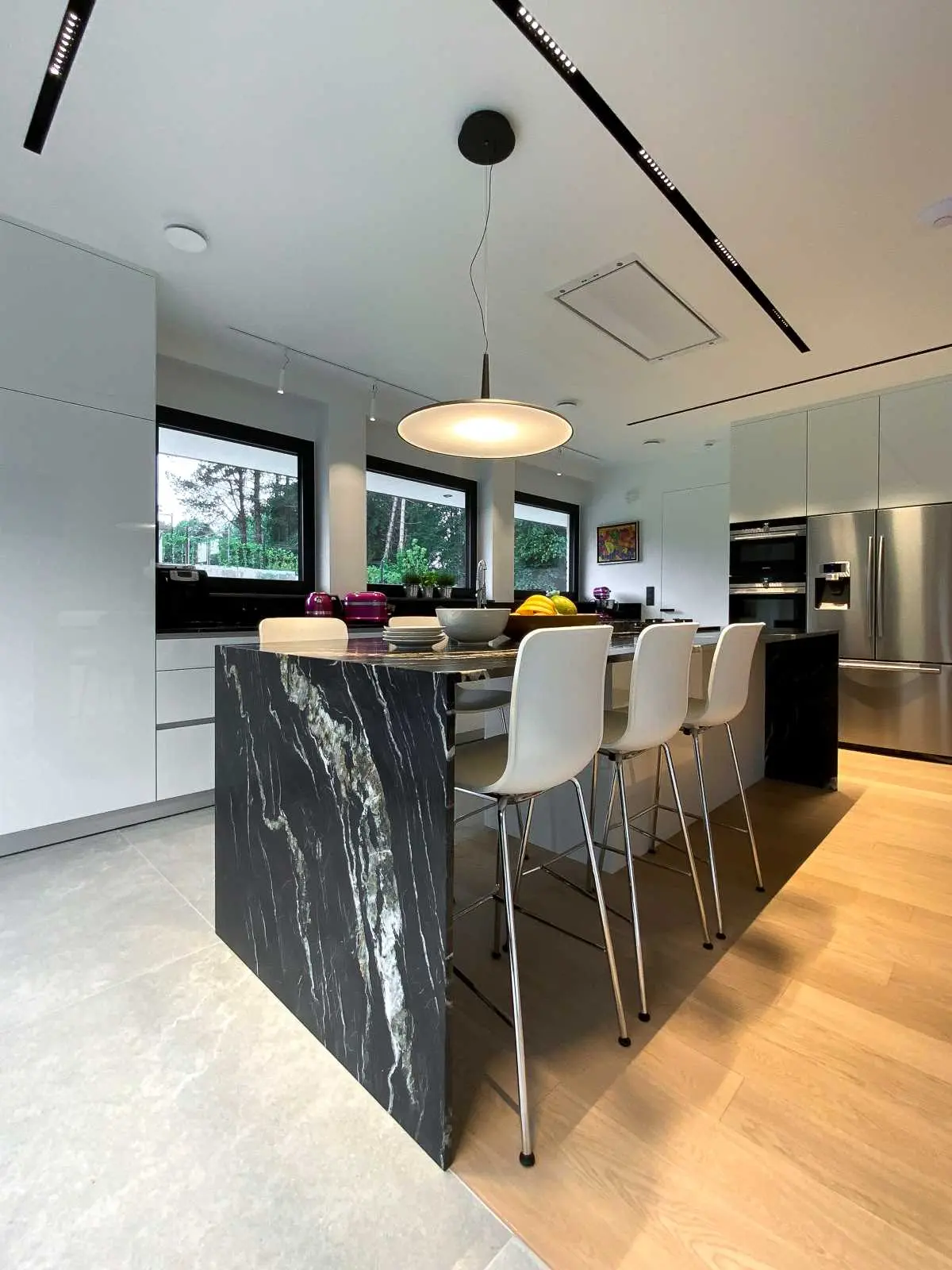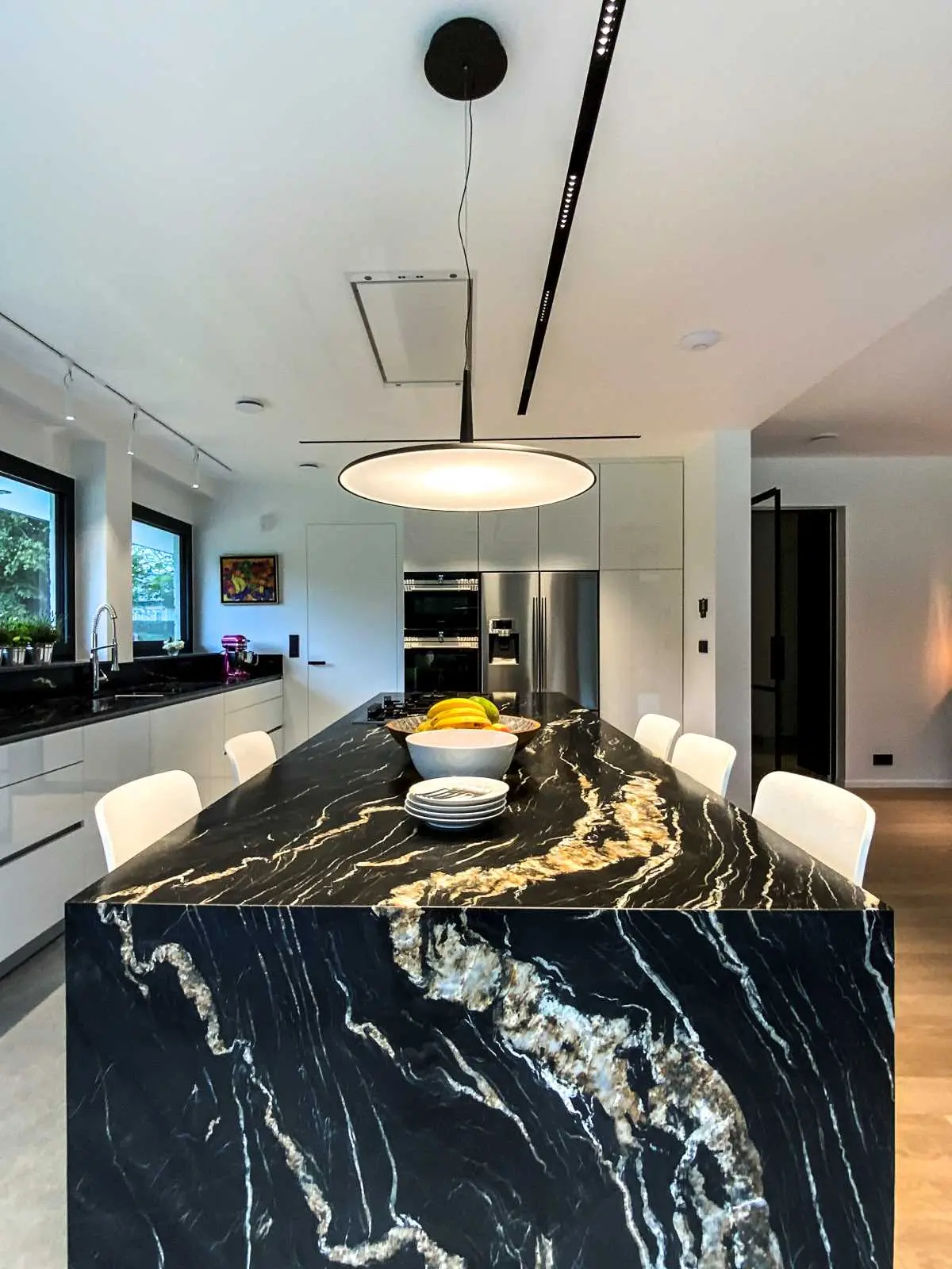 Kuchnia minimalistyczna z piękną stylową wyspą wykonana z płyty wielkoformatowej czarnej ze złotym ekskluzywnym użyleniem.