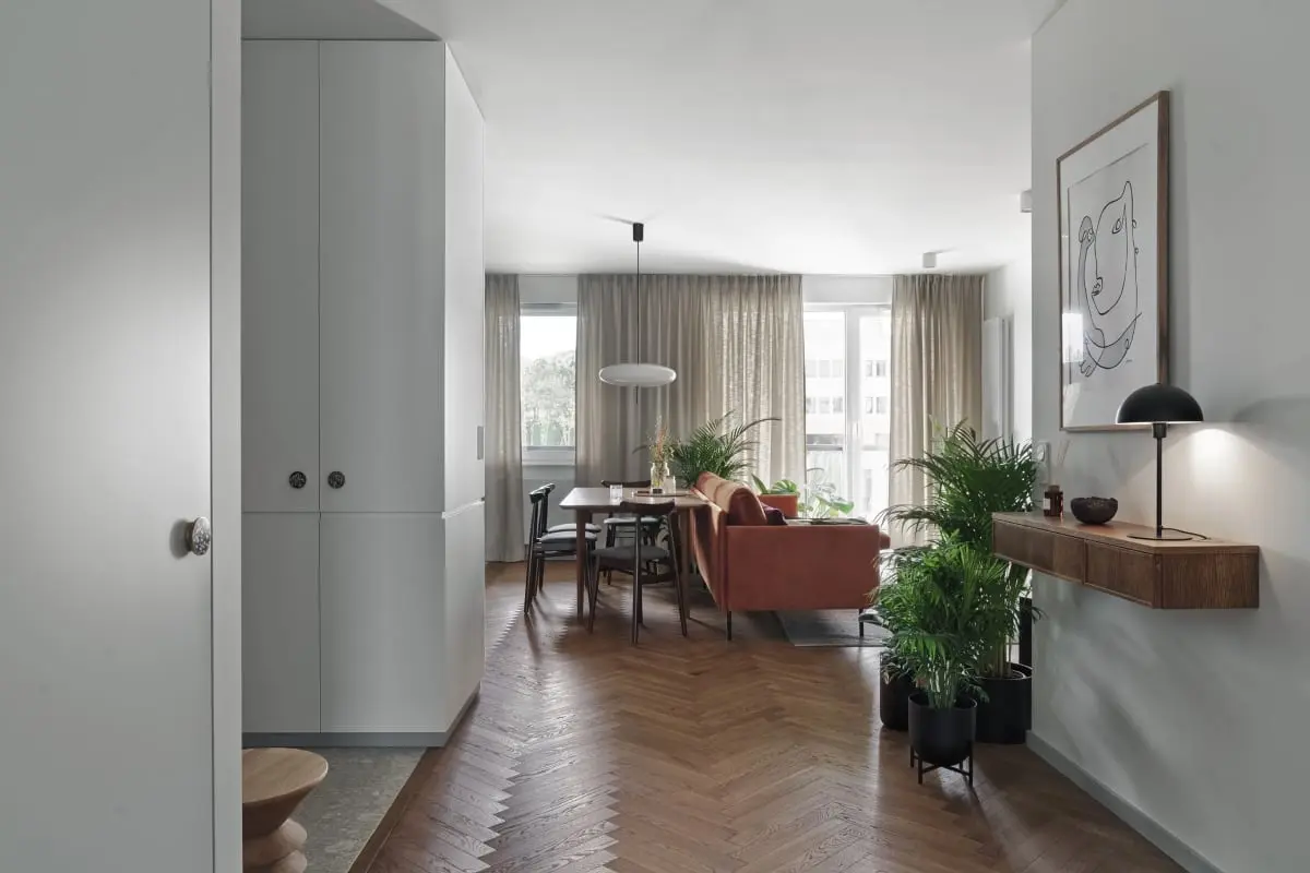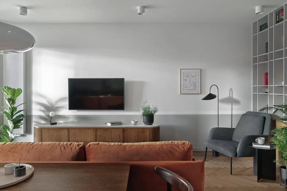 Strefa dzienna stanowi wizytówkę mieszkania. Architekci zadbali, by była elegancka, a jednocześnie przytulna i zachęcająca do wspólnego spędzania czasu. Organiczne formy, zaokrąglone ranty, a także wybór orzechowego odcienia elementów drewnianych, nawiązuje do designu lat 50. Podłogę pokrywa klasyczna jodełka, natomiast na ścianach zaproponowano lamperię z szarym pasem na 1/3 wysokości pomieszczenia. Centralną część strefy dziennej zajmuje stół jadalniany z krzesłami marki Famg. Układ zaproponowany przez dewelopera narzucił usytuowanie kuchni naprzeciw ściany telewizyjnej. Właśnie dlatego sofa została ustawiona tuż obok stołu, co bardzo sprzyja spotkaniom towarzyskim. Stół staje się sercem domu i przy większej liczbie gości pozwala na wygodne zebranie się wokół niego. W części salonu architekci postawili na narożnik polskiej marki Sits, obity welurem w pięknym rudym odcieniu. Ten mocny akcent kolorystyczny ciekawie przecina monochromatyczną przestrzeń i wizualnie rozdziela kuchnię od salonu.