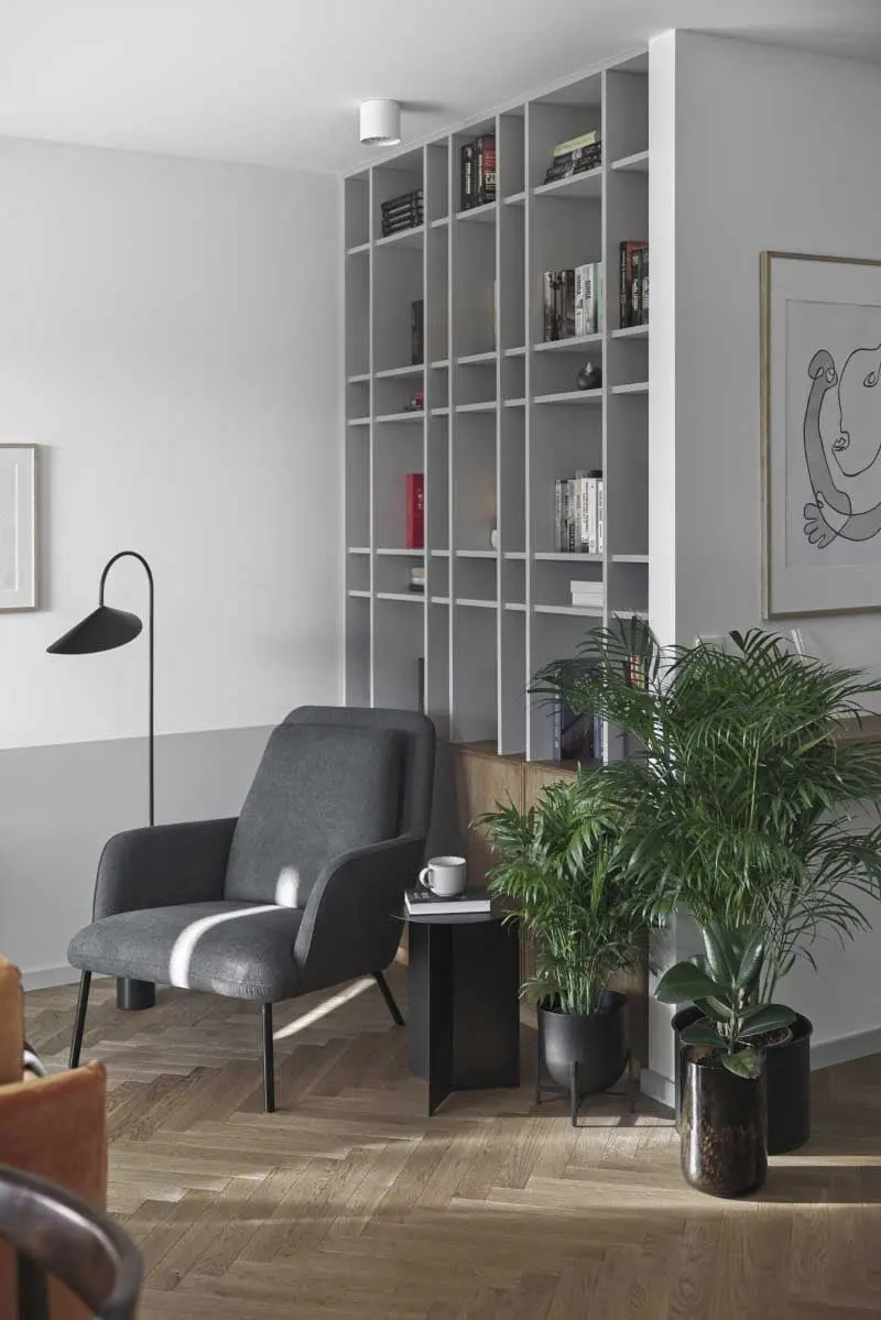 Podczas projektowania wnętrz zadbano o liczne miejsca do przechowywania, pozwalające ukryć sprzęt oraz przedmioty, których nie chciano eksponować w przestrzeni. Biała zabudowa stolarska oddziela przedpokój od strefy dziennej. Od strony korytarza kryje szafę na ubrania, natomiast od strony kuchni szafę z produktami spożywczymi i naczyniami. Zabudowa w części aneksu posiada zaokrąglony narożnik, co ma swoje uzasadnienie funkcjonalne, ale jest także nawiązaniem do modernistycznej stylistyki. Zabudowa, w której mieszczą się wszystkie akcesoria kuchenne pozwoliła na rezygnacje z szafek wiszących i zastąpienie ich półką. Natomiast okap został ukryty w zabudowie kartonowo-gipsowej. Dzięki tym zabiegom aranżacja kuchni jest znacznie lżejsza i nie przytłacza strefy dziennej pomimo swojej wielkości. Fronty szafek dolnych wykonane są z płyty fornirowanej, bejcowanej na ciemniejszy kolor, a poprzez dodanie cienkich ramek, uzyskano efekt vintage. Ścianę obok strefy RTV zabudowano, na całej jej wysokości biblioteczką, tworząc tym samym przytulny kącik czytelniczy. Bardzo ciekawym meblem jest zaprojektowana przez architektów szafka RTV, nawiązująca wykończeniem do dolnych frontów zabudowy kuchennej. Mosiężne nóżki nadają jej lekkości, a zaokrąglone boki są inspirowane stylem Mid-century.