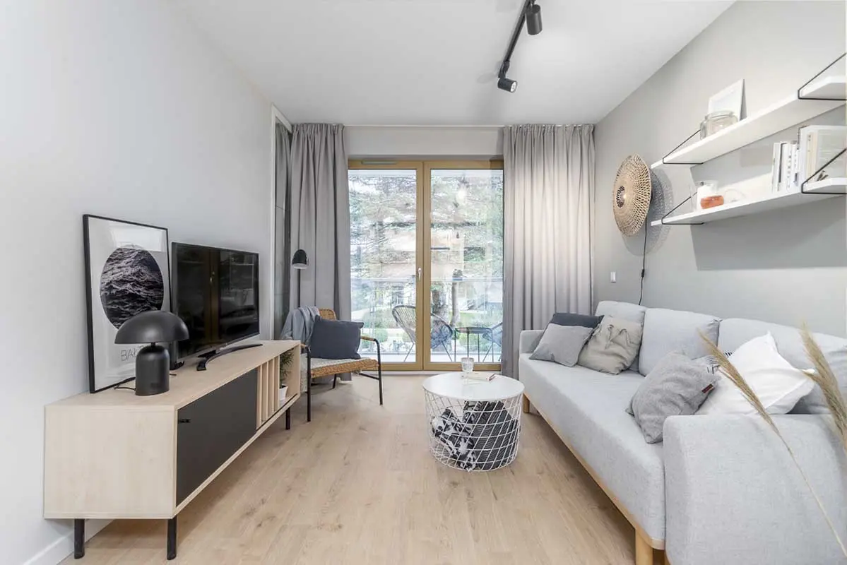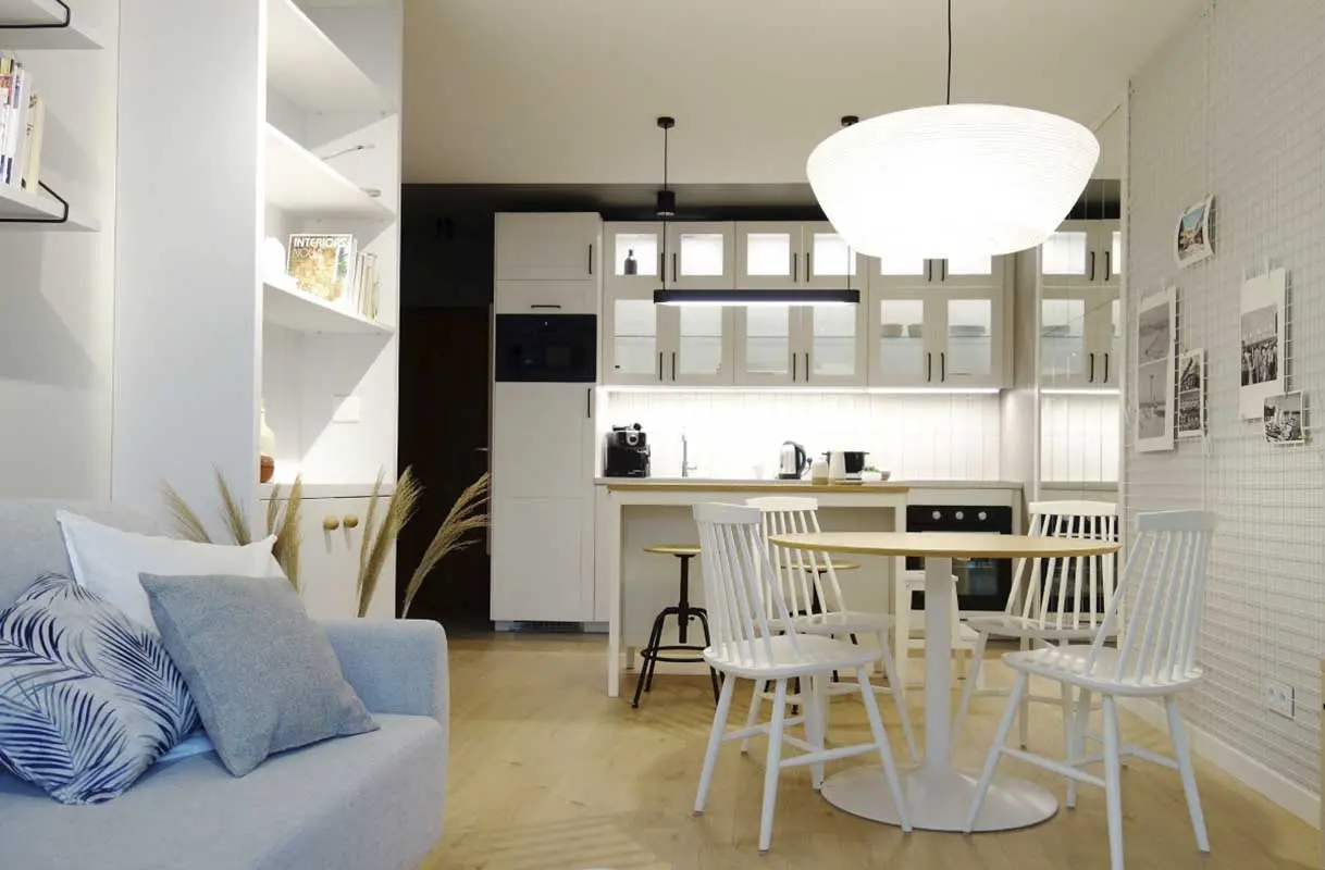 Niewielkie mieszkanie o powierzchni 42m2, powstało na potrzeby wynajmu krótkoterminowego. Zatem architekci musieli urządzić je z myślą o przyszłych lokatorach i ich potrzebach podczas wyjazdu. Sercem apartamentu jest strefa dzienna z aneksem kuchennym. Część ta jest dość wąska i długa, dlatego należało zniwelować to wrażenie i nadać jej przestronności. Projektanci zastosowali więc linearny układ funkcjonalny ( aneks/wyspa/stół jadalniany/salon z sofą) oraz wprowadzili lustrzany panel od podłogi do sufitu. Jasna zabudowa kuchni pogłębia pomieszczenie, a dzięki małej wyspie udało się powiększyć przestrzeń roboczą. Dużym atutem mieszkania są dwuskrzydłowe drzwi balkonowe, które pozwalają otworzyć je na dziedziniec osiedla.