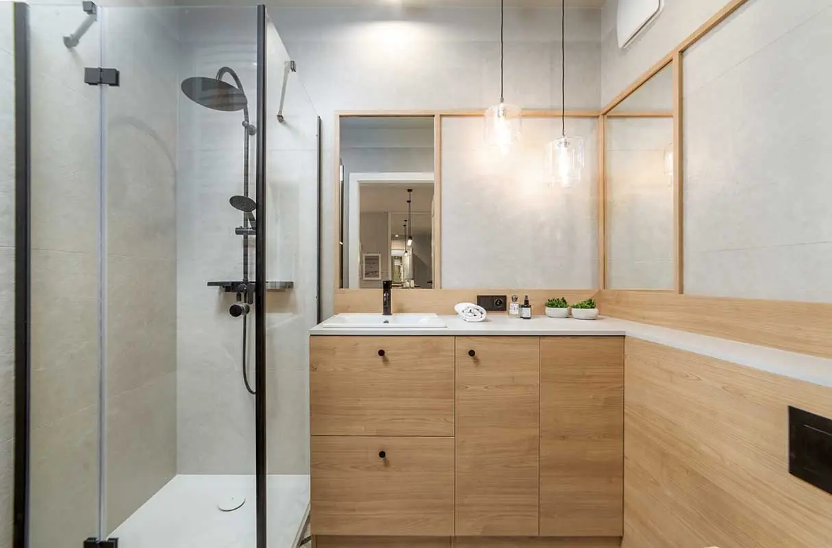 Naturalna stylistyka panuje, także w łazience. Tutaj zastosowano szare fakturowe płytki na ścianach imitujące kamień, zabudowy meblowe wykończone laminatem w odcieniu naturalnego dębu oraz czarną armaturę. Element charakterystyczny stanową wzorzyste płytki podłogowe imitujące lastryko.