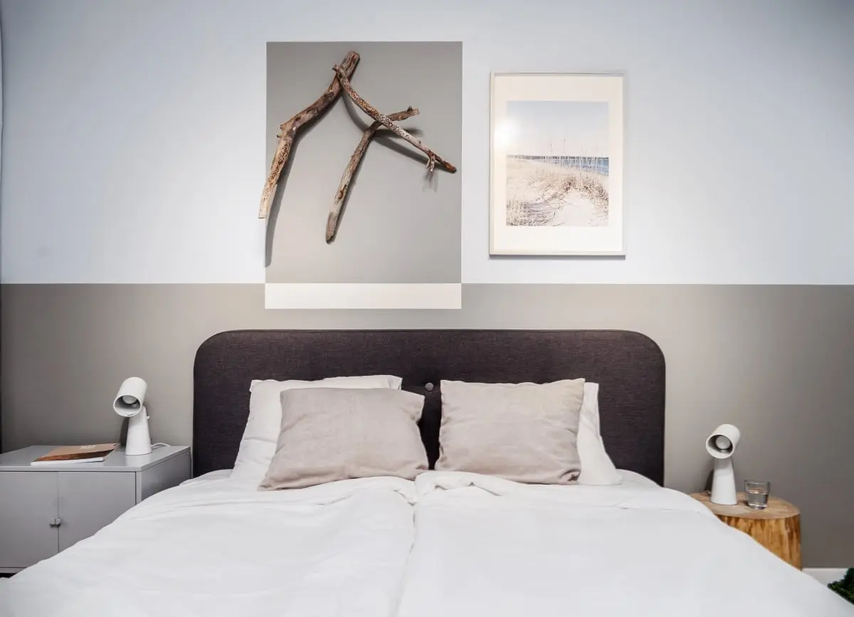 Architekci z Plan A zadbali, by również w sypialni panowała plażowa atmosfera. Kolorystyka została utrzymana w tonacji pochmurnego nieba. Natomiast głównym elementem kompozycyjnym jest szara lamperia, konsekwentnie przecinająca również szafę ubraniową oraz zasłony okienne. Przytulności wnętrzu tez dodaje malowany w tym samym kolorze sufit. Ciekawą dekoracje stanowi gałąź znaleziona na plaży, która zawisła nad łóżkiem. Kolejnym naturalnym dodatkiem w sypialni jest stolik nocny wykonany z pnia drzewa.