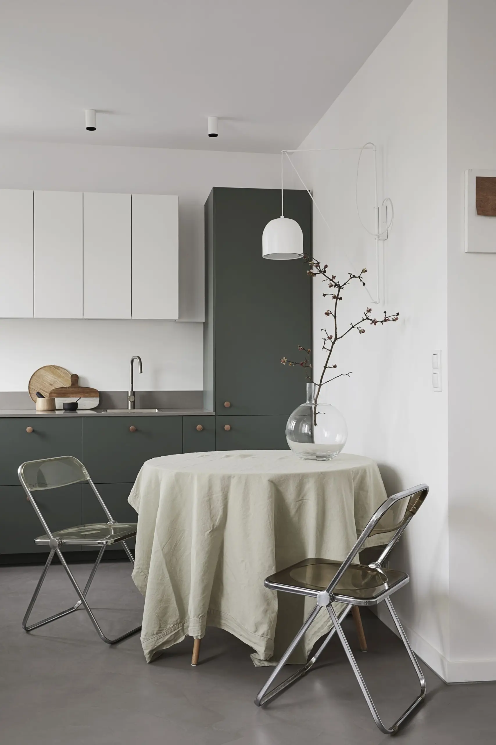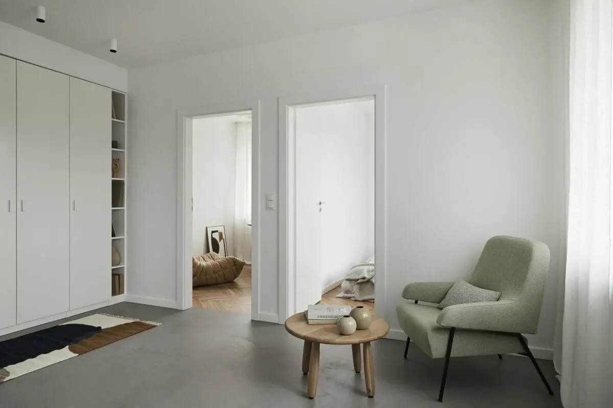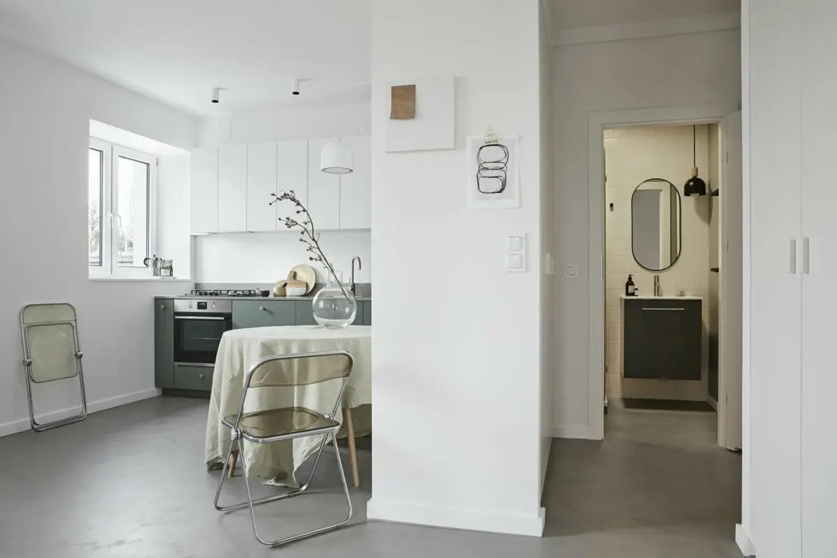 Mieszkanie jest przeznaczone na wynajem, a celem metamorfozy było zwiększenie poczucia komfortu przyszłych najemców. Właścicielce zależało na wydobyciu potencjału przestrzeni, lepszemu zaplanowaniu funkcji pomieszczeń przy maksymalnym wykorzystaniu powierzchni użytkowej. Dzięki przebudowie obejmującej wyburzenie oraz przeniesienie niektórych ścian działowych wnętrze zmieniło się nie do poznania. Wcześniej znajdowały się tu jedynie dwa pomieszczenia natomiast między dzięki proporcjom pokoi oraz rozmieszczeniu okien mieszkanie posiadało znacznie większy potencjał aranżacyjny. W wyniku przeprowadzonych prac remontowych z dwóch pomieszczeń powstały trzy. Powstała wspólna część dzienna z kuchnią, jadalnią oraz strefą wypoczynkową oraz dwa pokoje. Dzięki tym zabiegom nieruchomość może być wynajmowana zarówno na cele mieszkalne jak też komfortowe, kameralne gabinety czy przestrzeń co-workingową. Wnętrze zostało utrzymane w jasnej, neutralnej palecie barw sprzyjającej wyciszeniu. Dominuje biel ścian, a w dodatkach oraz meblach konsekwentnie pojawiają się odcienie brązu, beżu i oliwkowej zieleni.  W mieszkaniu znalazły się tylko niezbędne, starannie dobrane elementy wyposażenia, dzięki czemu ta niewielka przestrzeń wydaje się bardziej przestronna. Projektantkom udało się uratować i odświeżyć stary, dębowy parkiet, a w części dziennej, holu oraz toalecie została wykonana posadzka z mikrocementu.